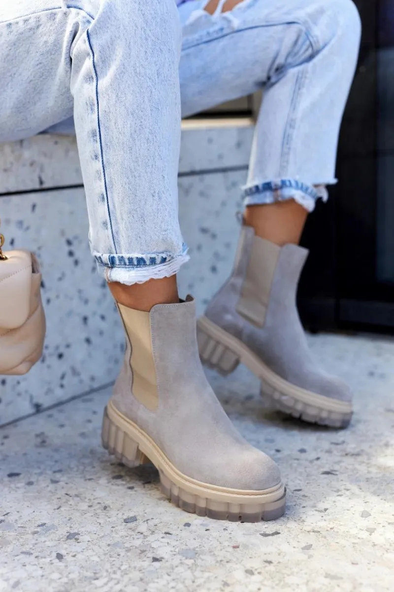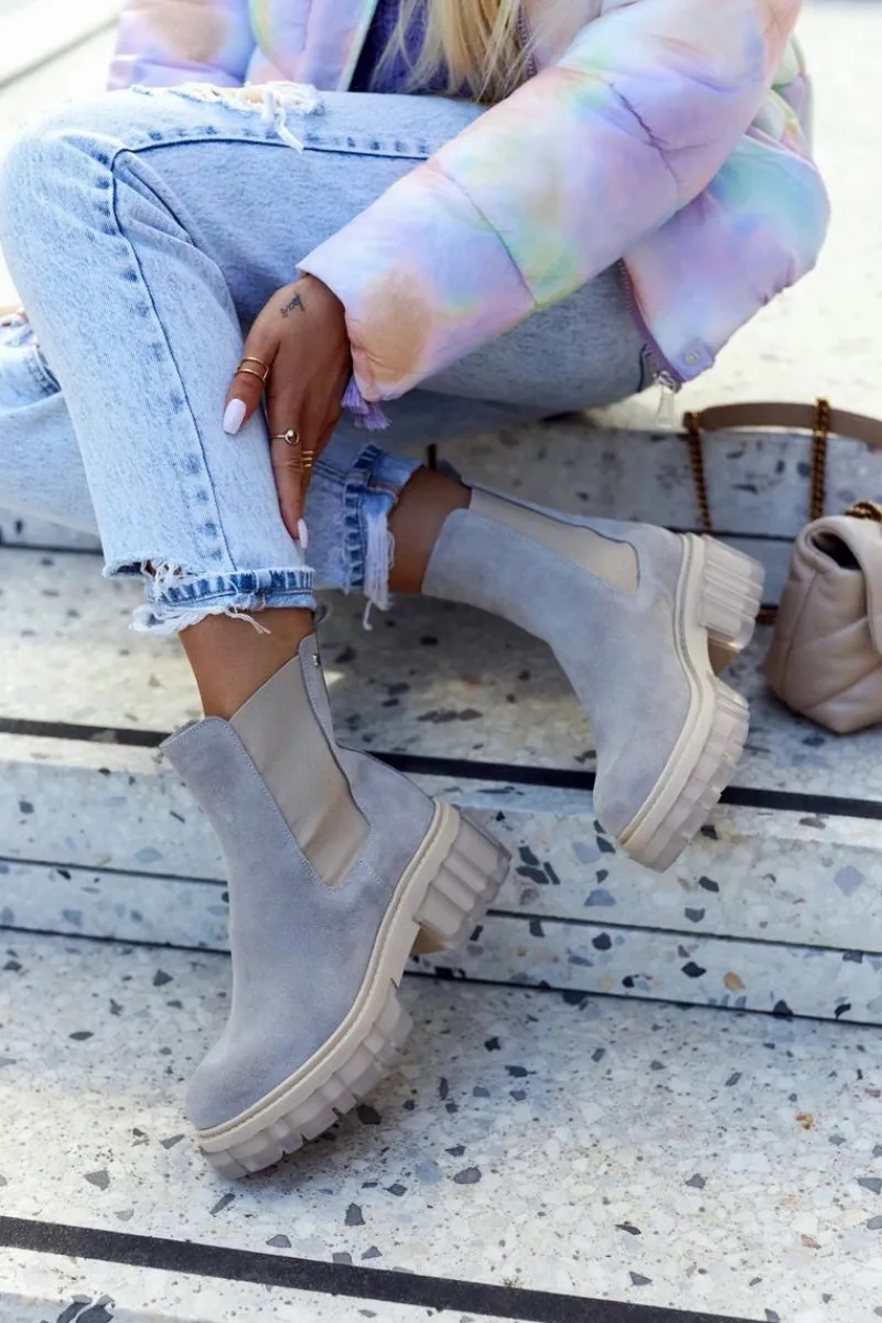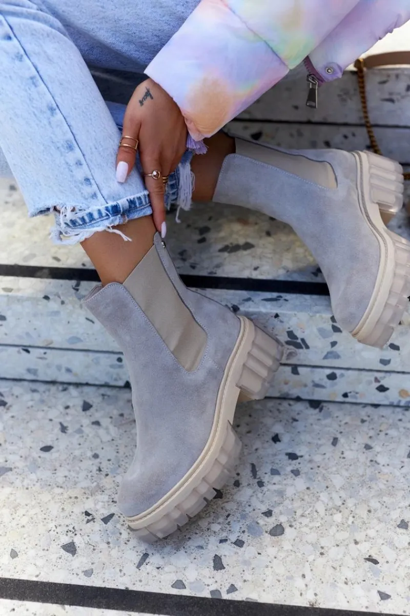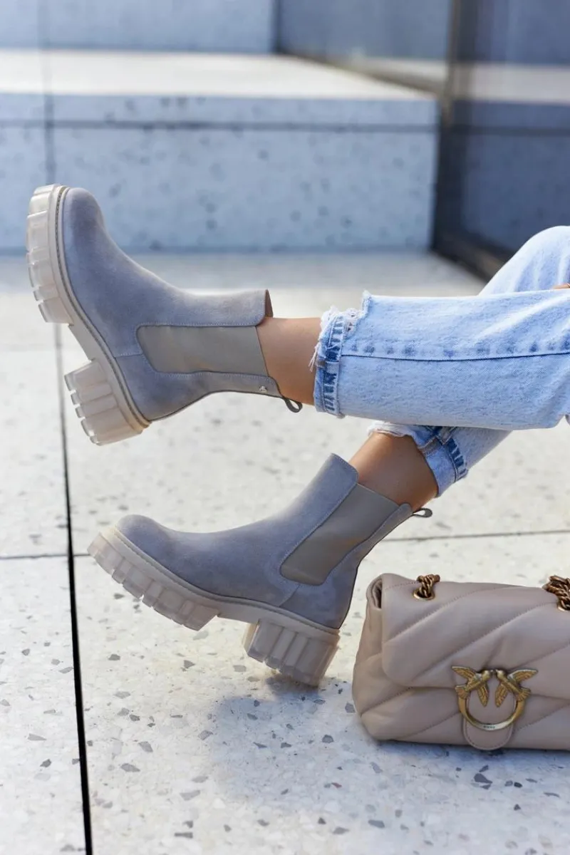 Botki na masywnej platformie z szerokim obcasem w stylu sztybletów. Posiadają wysoką, sięgającą ponad kostkę cholewkę. Wykonane z naturalnej zamszowej skóry. Posiadają dodatkową, elastyczną wstawkę, dzięki której cholewka świetnie dopasuje się do tęgości nogi. Boki podeszwy są ozdobione przezroczystym, gumowym tworzywem. Przy wyborze rozmiaru prosimy kierować się tabelą rozmiarów