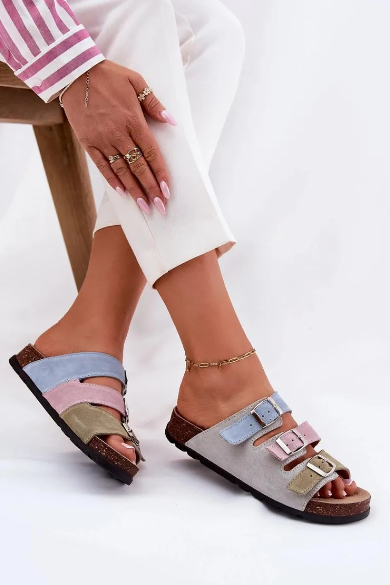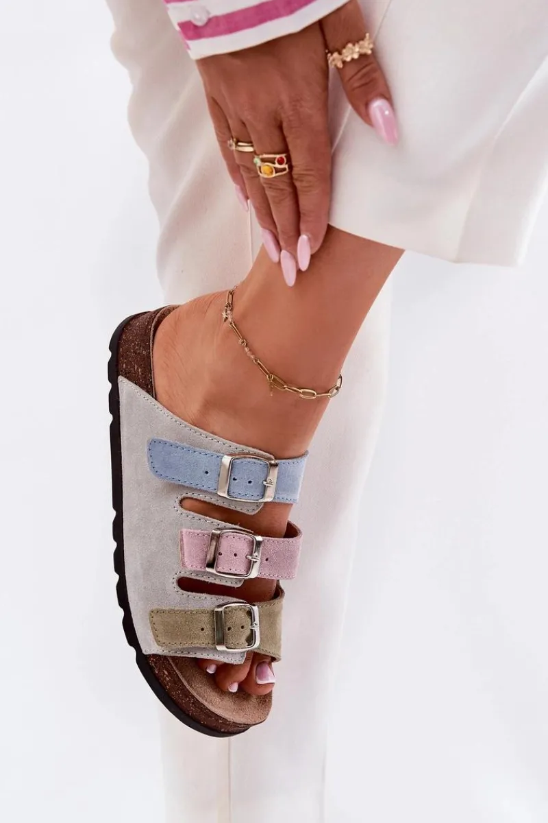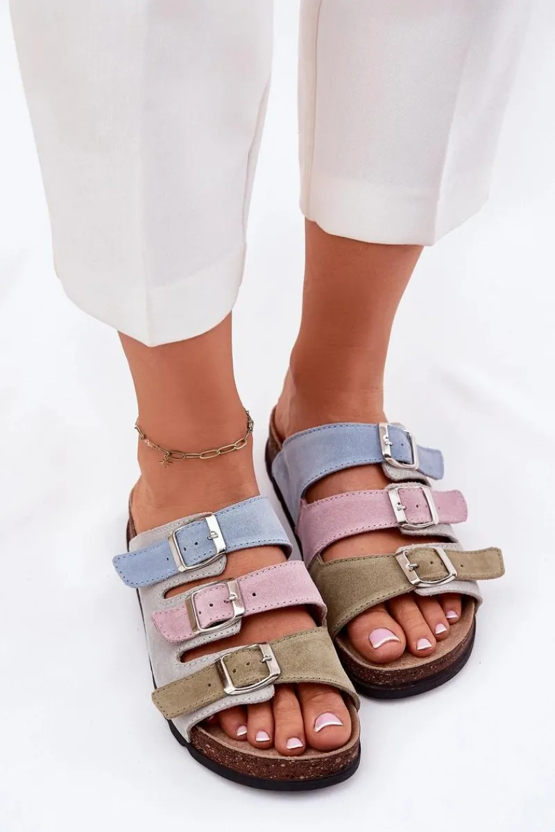 Damskie klapki wykonane z naturalnego zamszu to elegancka i modna propozycja na ciepłe dni. Osadzone na platformie, oferują komfort i stabilność przez cały dzień. Model wyróżnia się trzema regulowanymi paskami z klamrami, które pozwalają na idealne dopasowanie do stopy. Te stylowe klapki będą doskonałym uzupełnieniem letnich stylizacji, łącząc funkcjonalność z nowoczesnym wyglądem. Przy wyborze rozmiaru prosimy sugerować się tabelą rozmiarów.