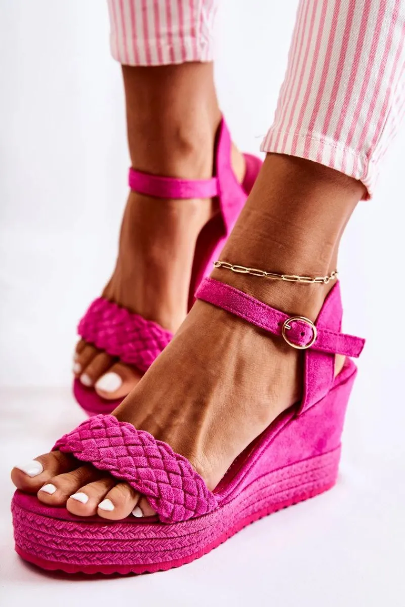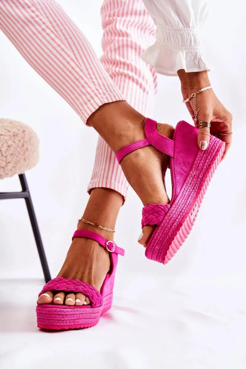Sandały damskie wykonane z eko skóry. Regulowane zapinanie ze sprzączką. Głównym elementem zdobienia jest piękny, przeplatany pasek na przodzie. Koturn jest dodatkowo ozdobiony. Podeszwa gumowa i antypoślizgowa. Eko skórzana wkładka zadba o Twój komfort i wygodę. Sandały świetnie sprawdzą się w letnich stylizacjach. Przy wyborze rozmiaru prosimy sugerować się tabelą rozmiarów.
