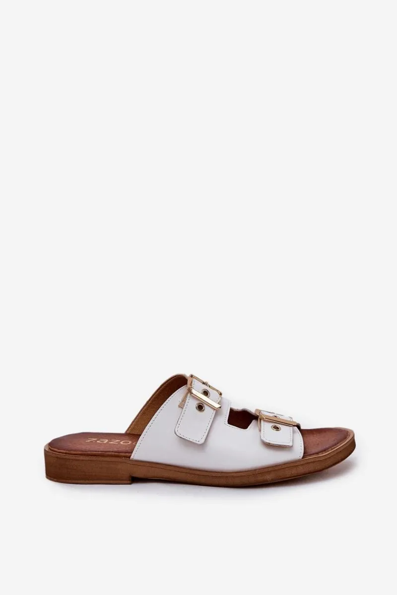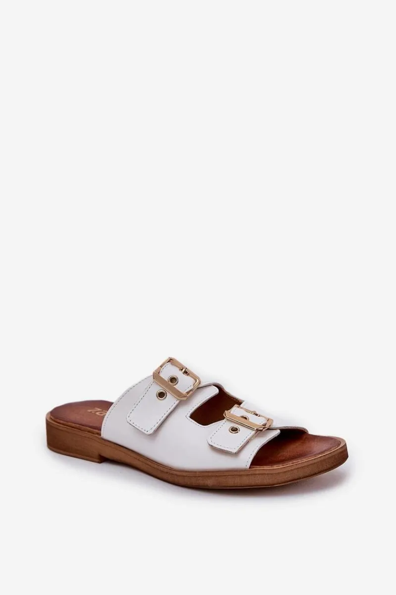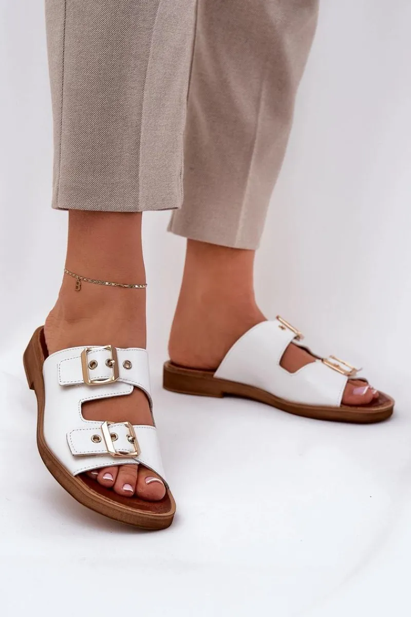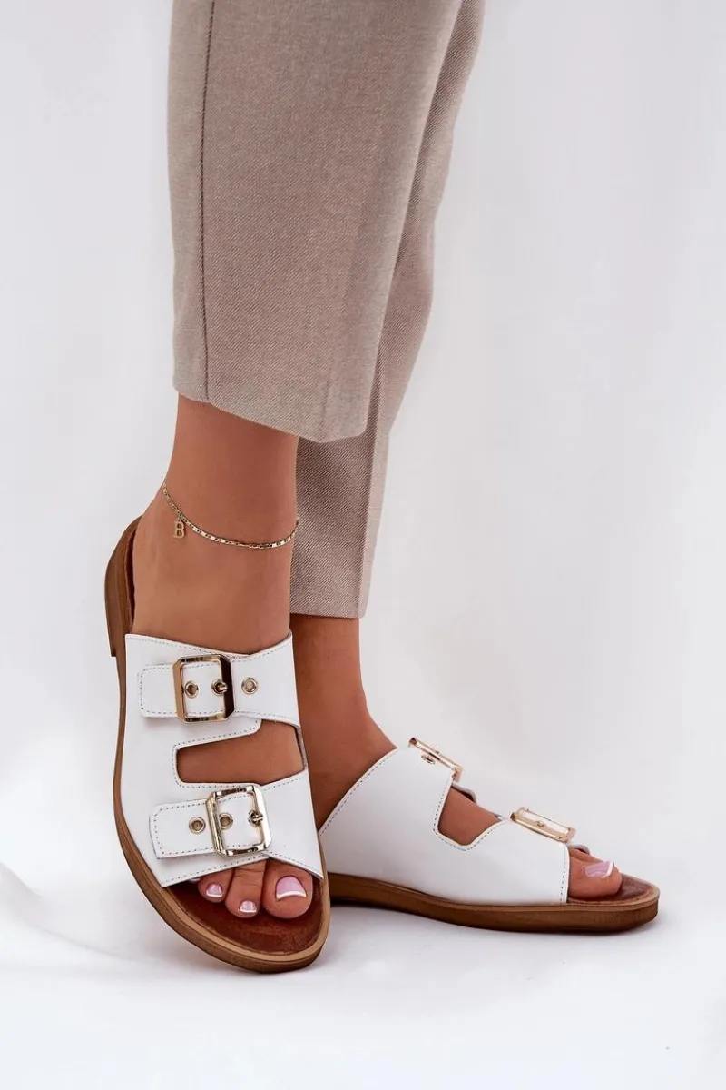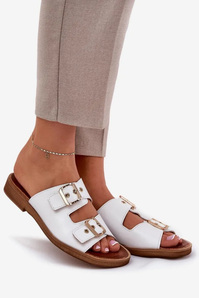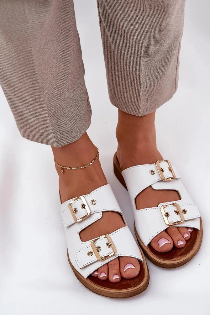 Skórzane klapki damskie na płaskim obcasie to elegancka propozycja, która łączy komfort z nowoczesnym stylem. Posiadają dwie złote klamry z regulowanymi paskami, które nie tylko zapewniają idealne dopasowanie do stopy, ale również stanowią modny akcent, dodający subtelnego blasku. Dzięki płaskiemu obcasowi klapki te są wygodne i stabilne, idealne na co dzień, zarówno do casualowych, jak i bardziej eleganckich stylizacji. Skórzana cholewka gwarantuje trwałość i komfort, sprawiając, że te klapki będą doskonałym wyborem na upalne dni. Przy wyborze rozmiaru prosimy sugerować się tabelą rozmiarów.