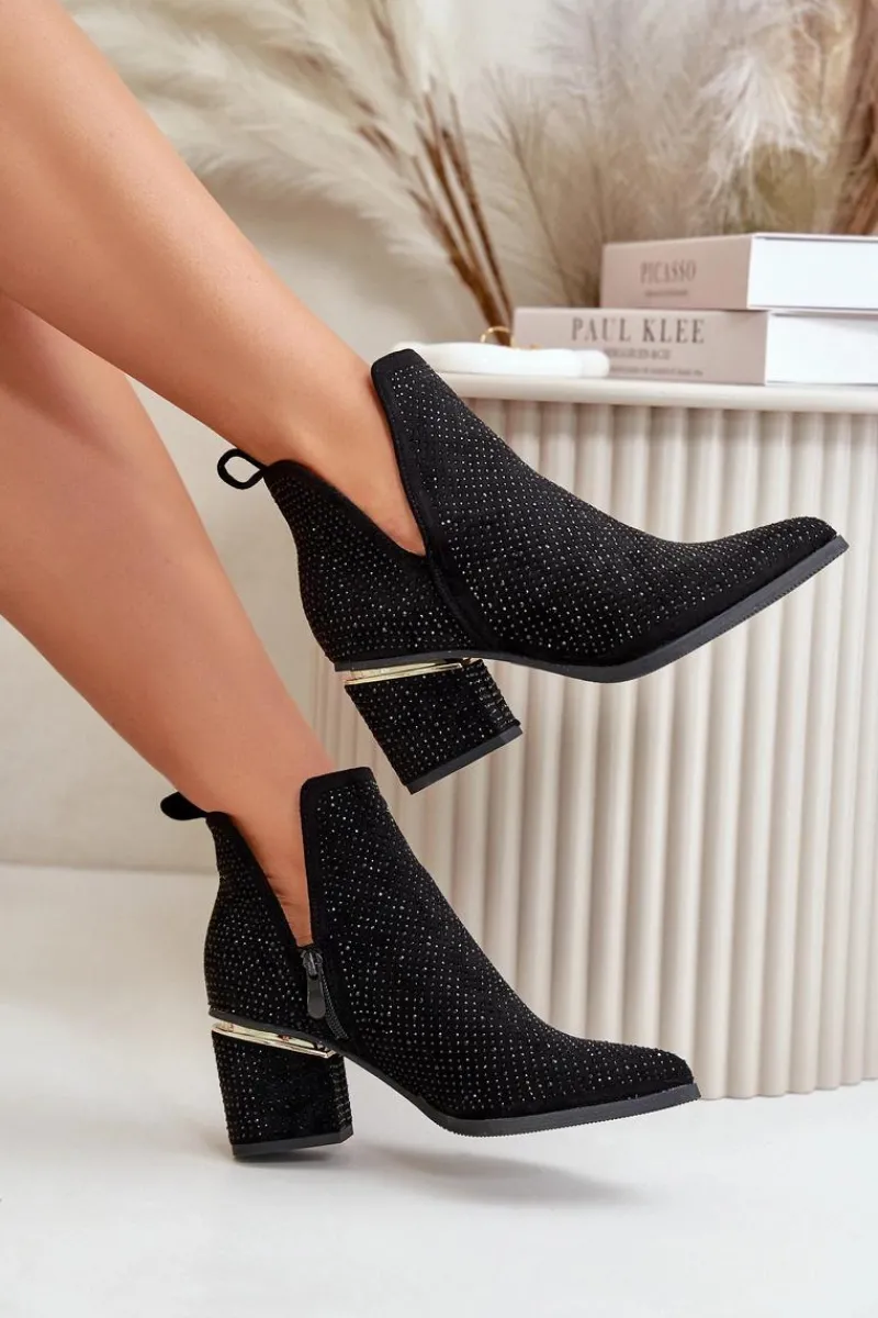 Zdobione botki damskie wykonane z eko zamszu. Cholewka z wycięciami, zapinana na zamek, nadaje im unikalnego charakteru. Osadzone na stabilnym obcasie typu słupek, z noskami w szpic, te botki łączą elegancję z nowoczesnym stylem, idealnie komponując się z różnymi stylizacjami. Przy wyborze rozmiaru prosimy sugerować się tabelą rozmiarów.