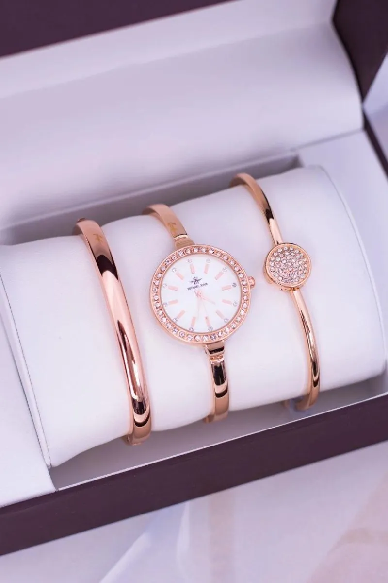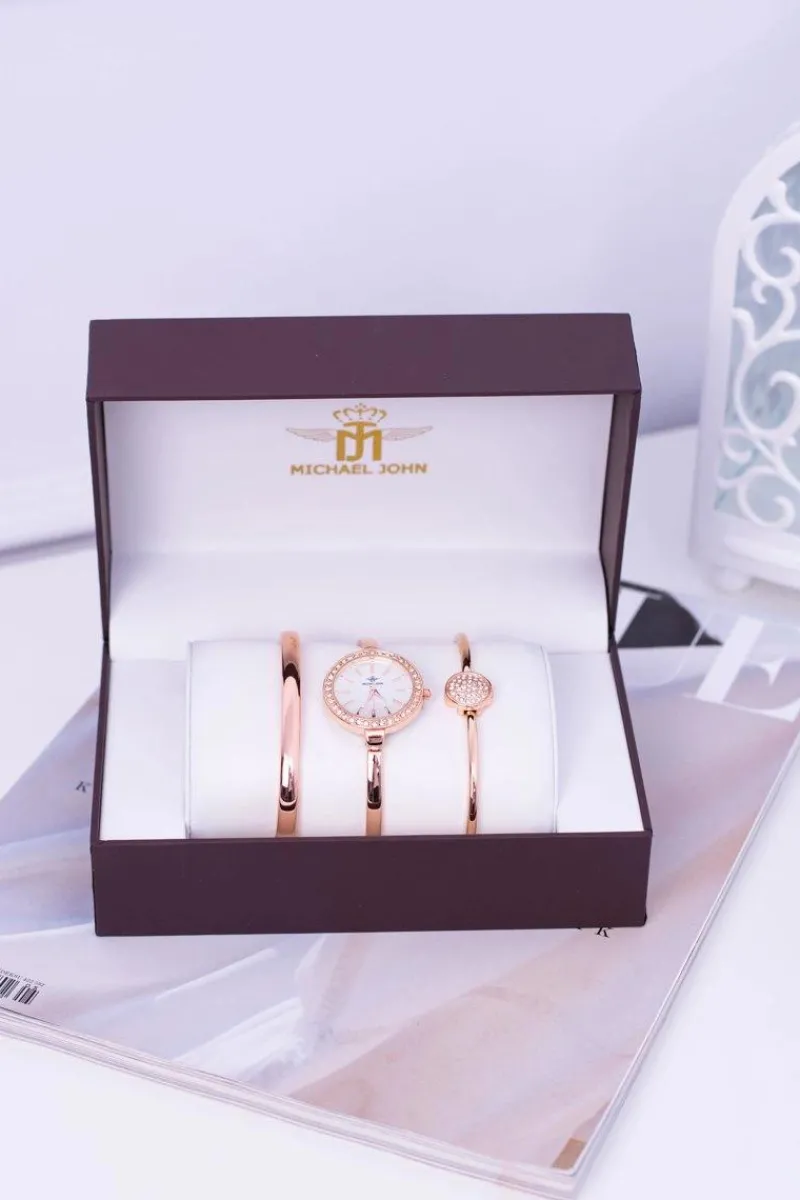 Niezwykła kolekcja zegarków Michael John, która w idealny sposób podkreśli Twoją wyjątkowość! To małe pudełeczko zawiera w sobie wszystko czego pragniemy. Delikatna ozdoba w postaci złotego zegarka z cyrkoniami, oraz z dwoma pięknymi bransoletkami. To małe pudełeczko zawiera wszystko co jest na zdjęciu, czyli zegarek, dwie bransoletki i opakowanie.