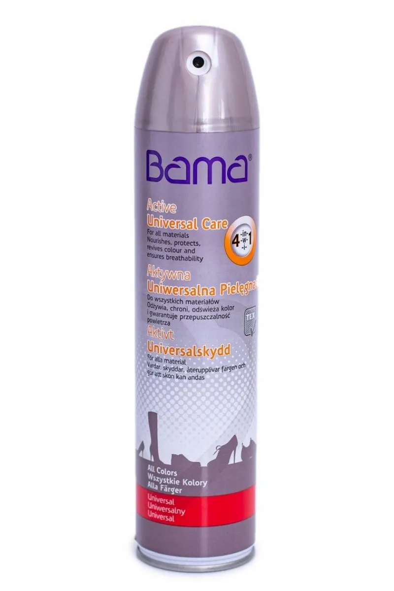 BAMA – Aktywna, Uniwersalna Pielęgnacja 4w1Preparat do wszystkich rodzajów materiałów, obuwia, odzieży jak również torebek. Odżywia, chroni, odświeża kolor i gwarantuje przepuszczalność powietrza.