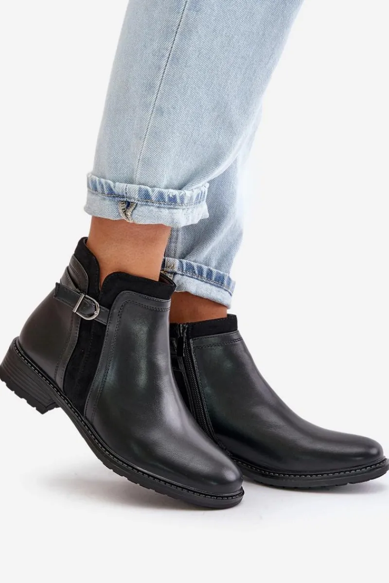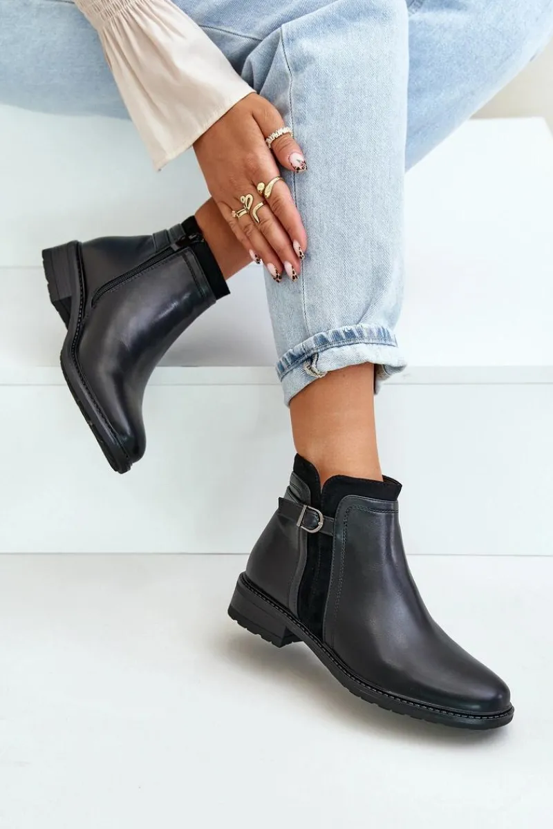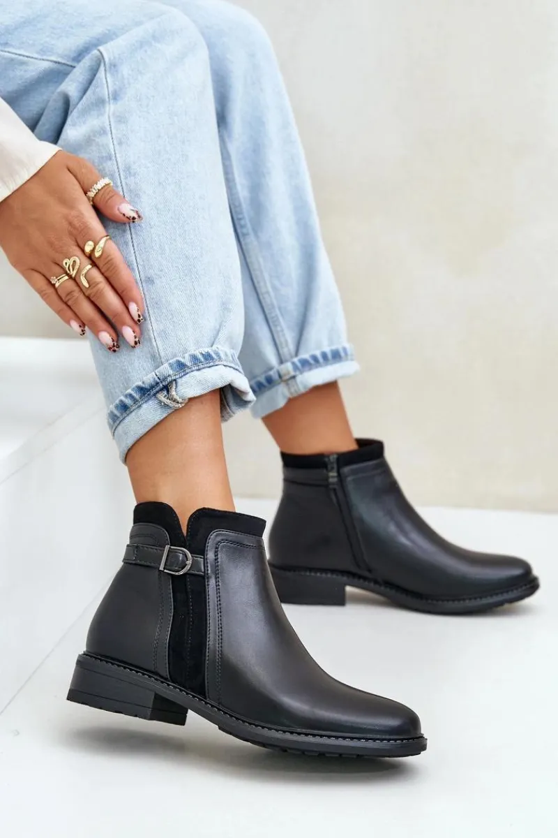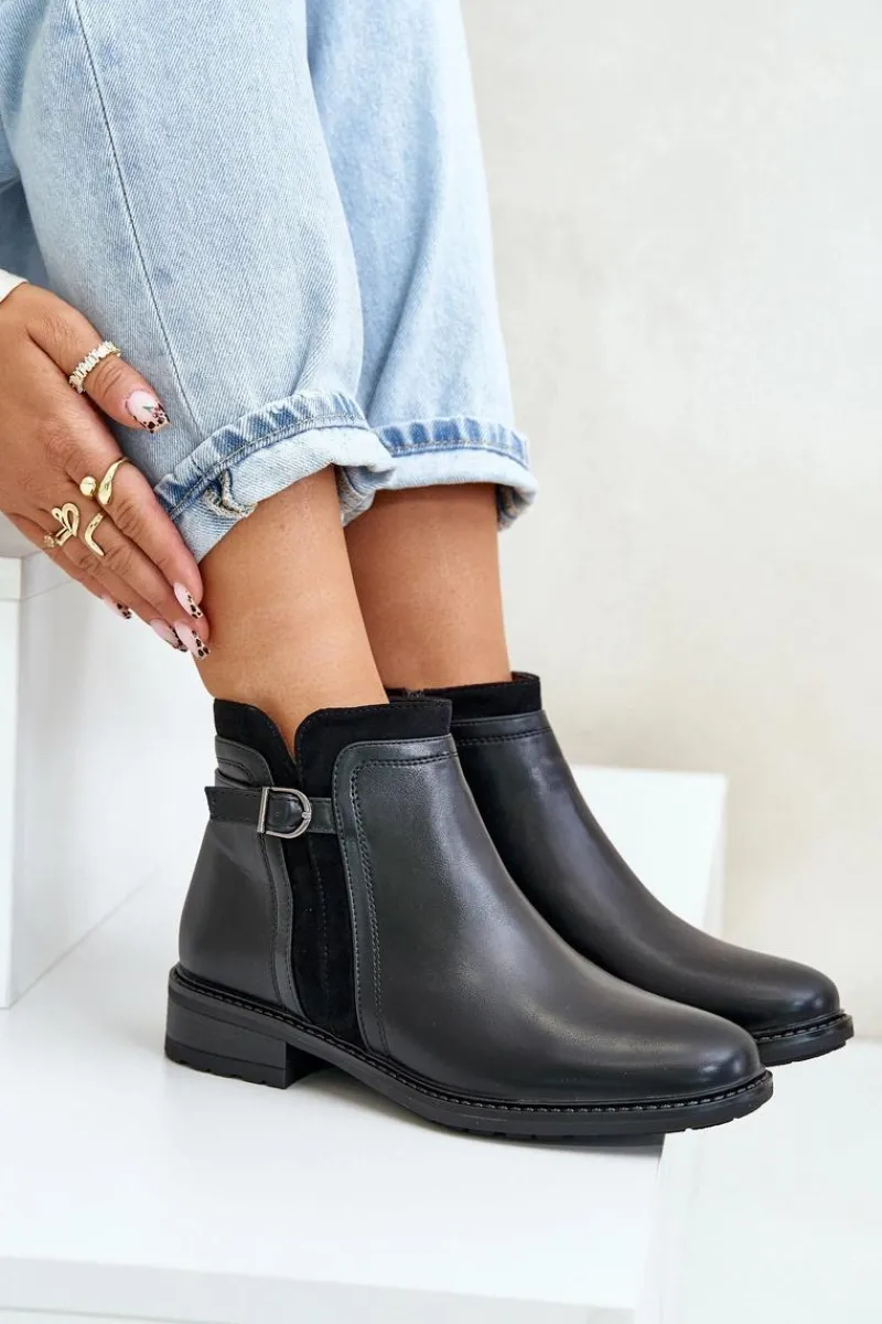 Klasyczne botki damskie świetnie sprawdzą się w wielu stylizacjach! Wykonane ze skóry ekologicznej. Osadzone na płaskim obcasie. Cholewka ozdobiona paskiem z małą ozdobą. Wnętrze ozdobione kocem obuwniczym. Noski zaokrąglone. Przy wyborze rozmiaru prosimy kierować się tabelą rozmiarów