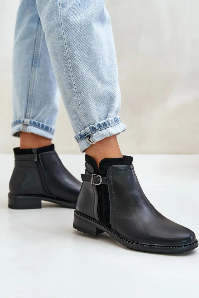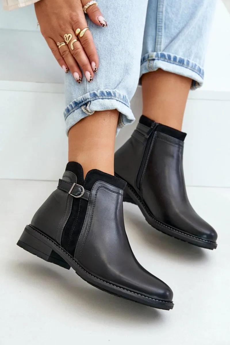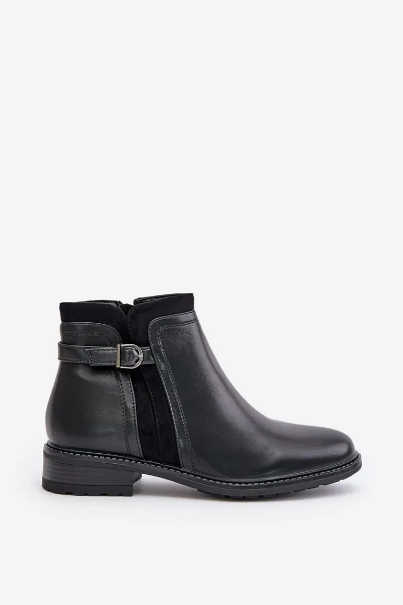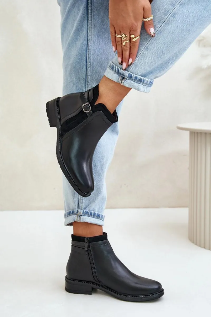 Klasyczne botki damskie świetnie sprawdzą się w wielu stylizacjach! Wykonane ze skóry ekologicznej. Osadzone na płaskim obcasie. Cholewka ozdobiona paskiem z małą ozdobą. Wnętrze ozdobione kocem obuwniczym. Noski zaokrąglone. Przy wyborze rozmiaru prosimy kierować się tabelą rozmiarów