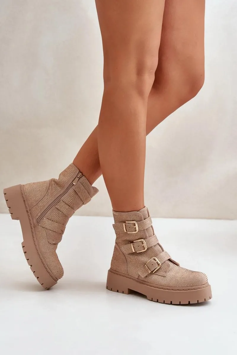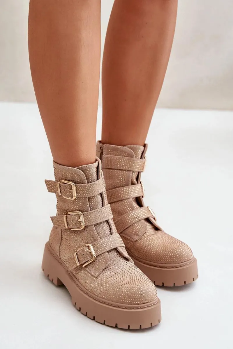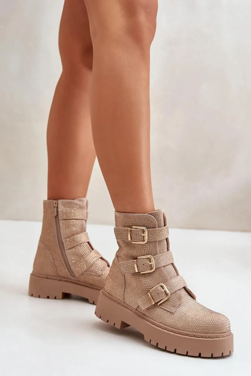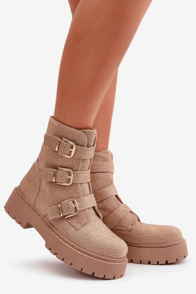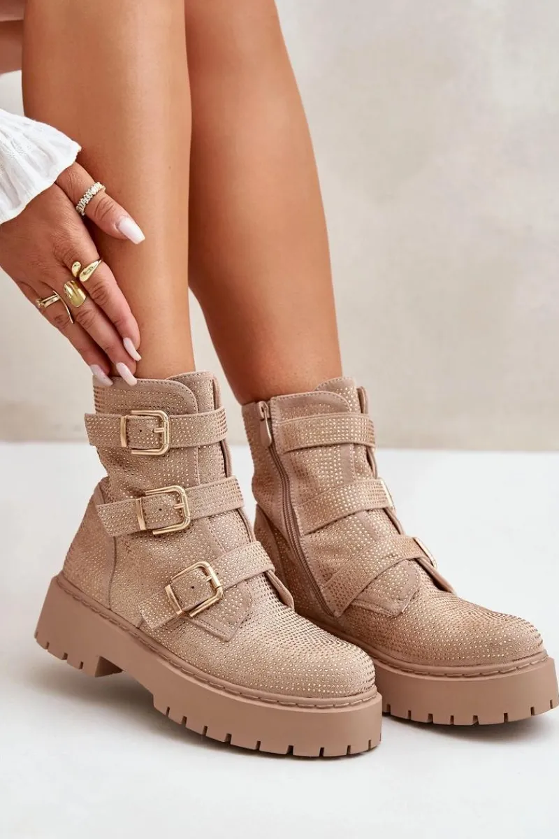 Stylowe damskie botki to niezbędny element jesienno-zimowej garderoby. Model ten wyróżnia się zdobioną cholewką oraz regulowanym paskami z klamrami. Zapinane na zamek, co ułatwi zakładanie i zdejmowanie obuwia. Środek ocieplony kocem obuwniczym. Doskonale sprawdzą się w różnych stylizacjach! Przy wyborze rozmiaru prosimy sugerować się tabelą rozmiarów.