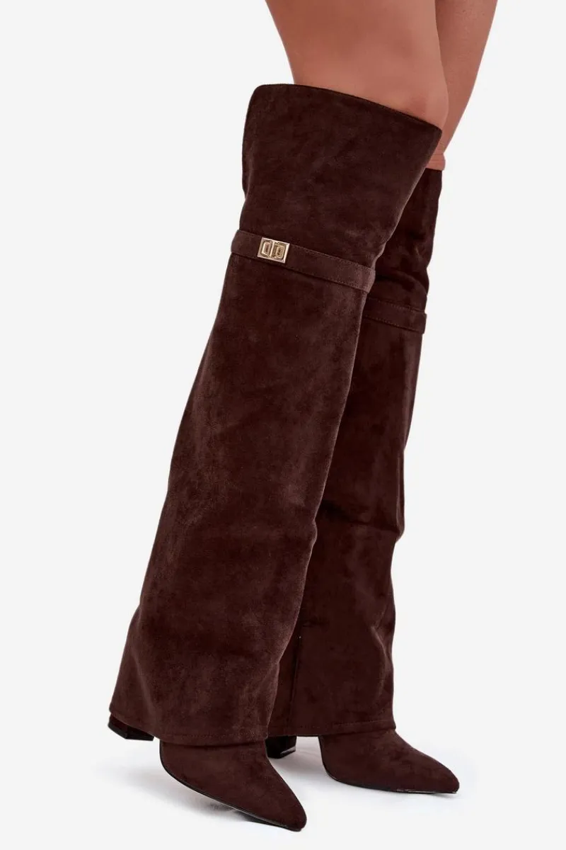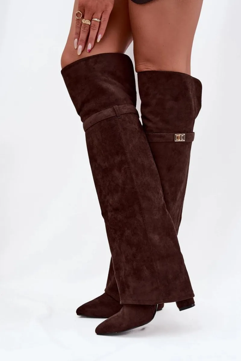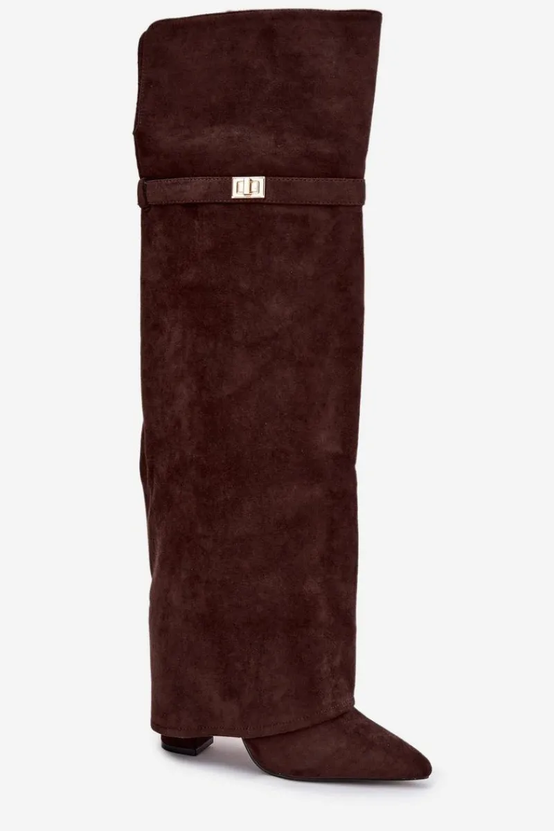 Kozaki damskie z wywiniętą cholewką to prawdziwy hit nadchodzącego sezonu jesienno-zimowego! Cholewka sięga za kolano i nachodzi na obcas dodaje im niepowtarzalnego charakteru. Osadzone na stabilnym obcasie typu słupek, zapewniają komfort i elegancję, a ocieplenie gwarantuje ciepło w chłodniejsze dni. Wsuwane i z noskami w szpic, łączą w sobie wygodę z modnym, kobiecym stylem – idealne do tworzenia efektownych, zimowych stylizacji. Przy wyborze rozmiaru prosimy sugerować się tabelą rozmiarów.