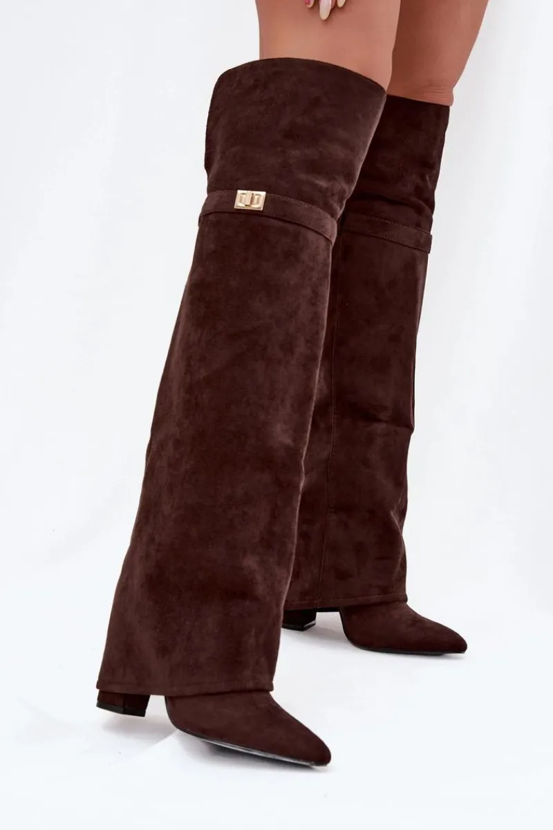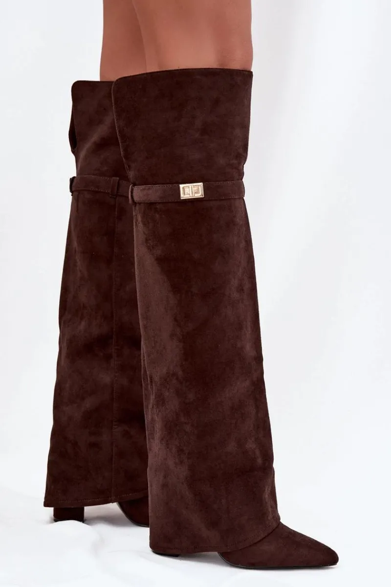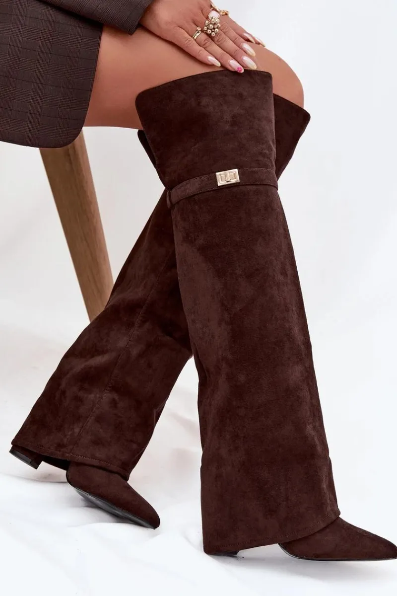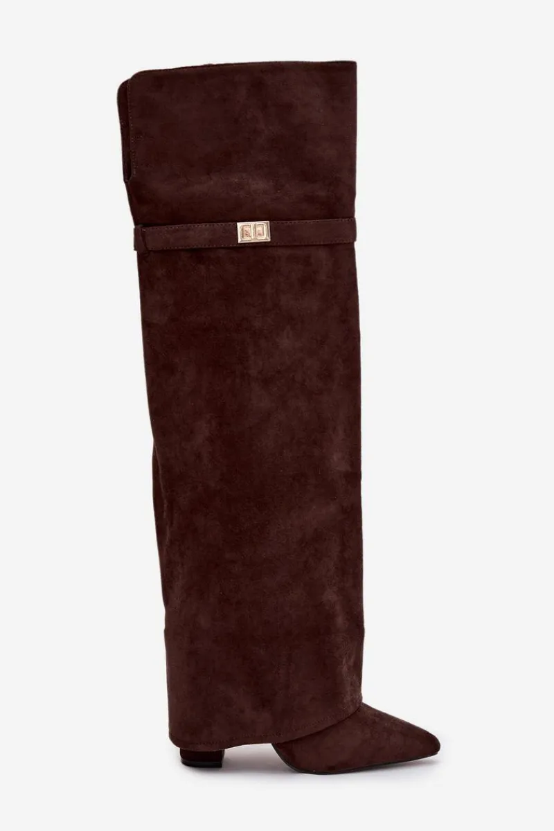 Kozaki damskie z wywiniętą cholewką to prawdziwy hit nadchodzącego sezonu jesienno-zimowego! Cholewka sięga za kolano i nachodzi na obcas dodaje im niepowtarzalnego charakteru. Osadzone na stabilnym obcasie typu słupek, zapewniają komfort i elegancję, a ocieplenie gwarantuje ciepło w chłodniejsze dni. Wsuwane i z noskami w szpic, łączą w sobie wygodę z modnym, kobiecym stylem – idealne do tworzenia efektownych, zimowych stylizacji. Przy wyborze rozmiaru prosimy sugerować się tabelą rozmiarów.