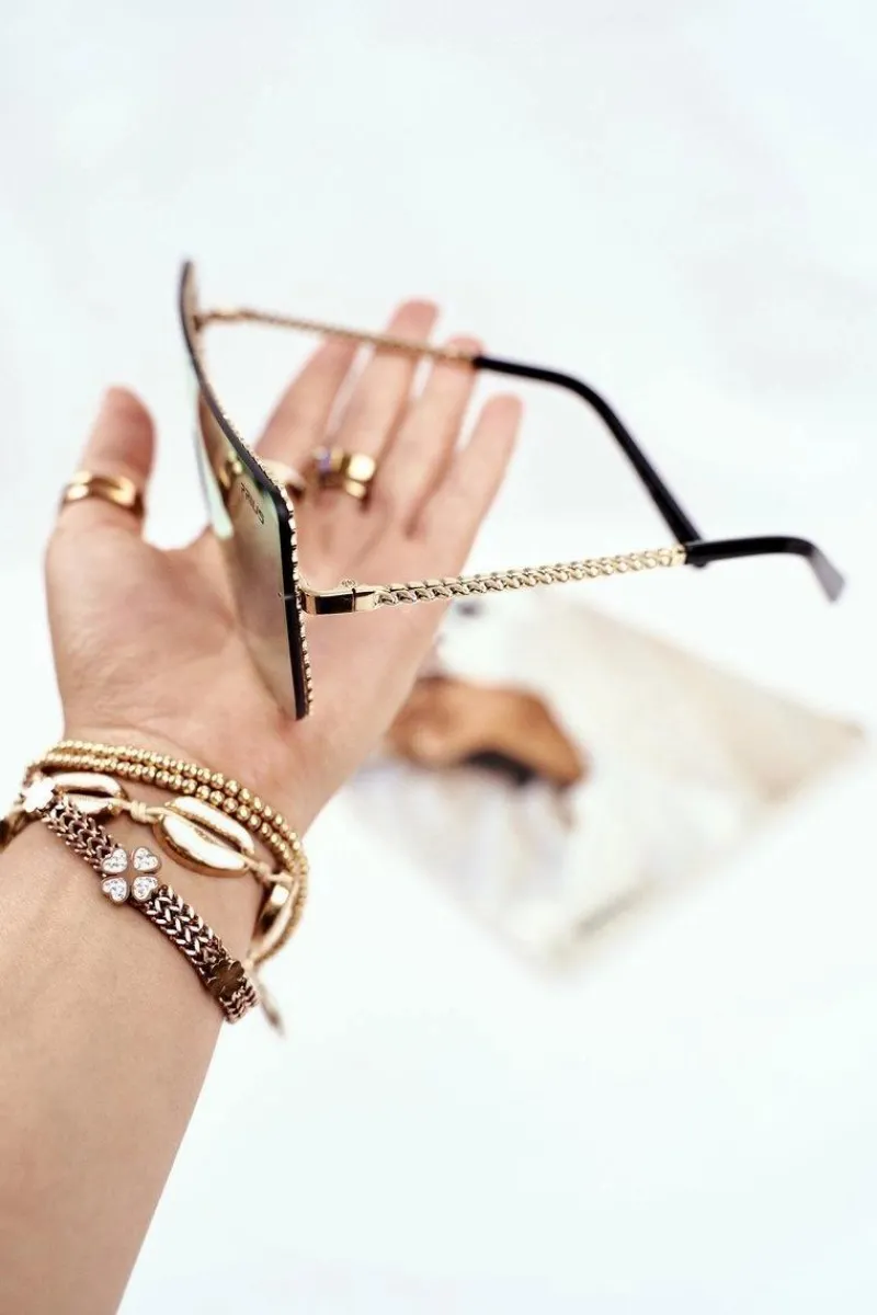 Okulary posiadają szkła z pięknym efektem lustra oraz modne, złote ozdoby na zausznikach, a także dookoła szkieł, widoczne na zdjęciach.