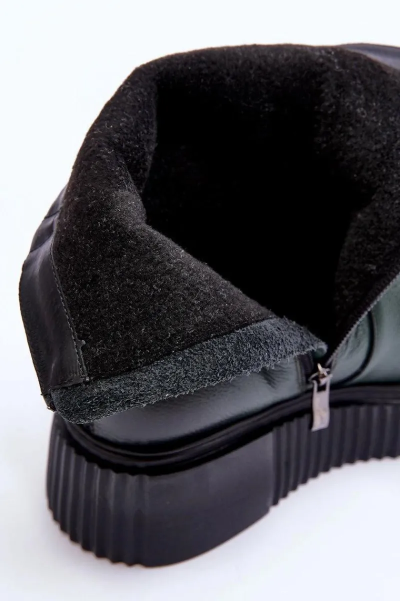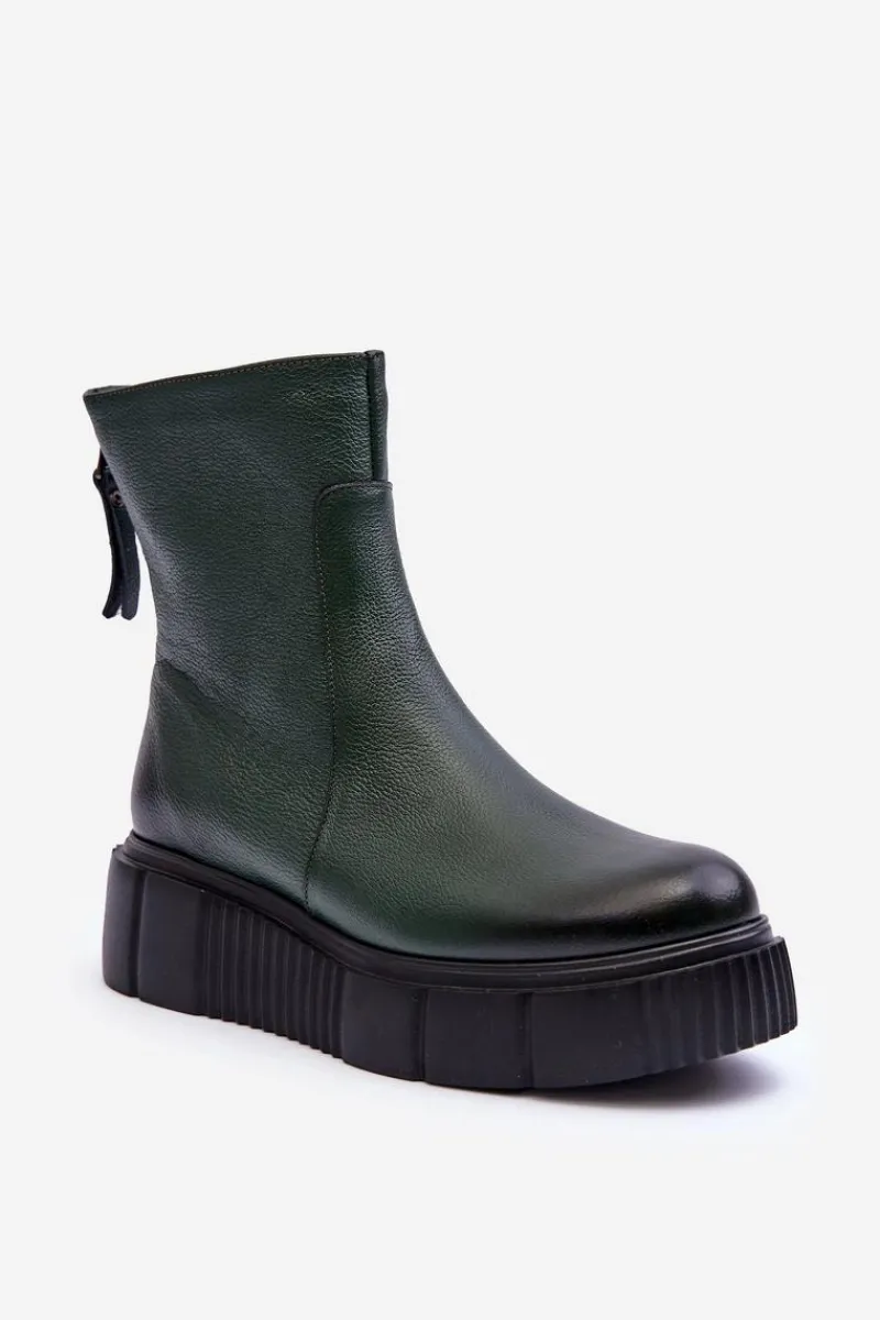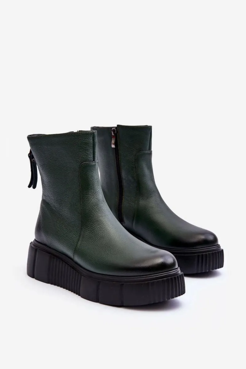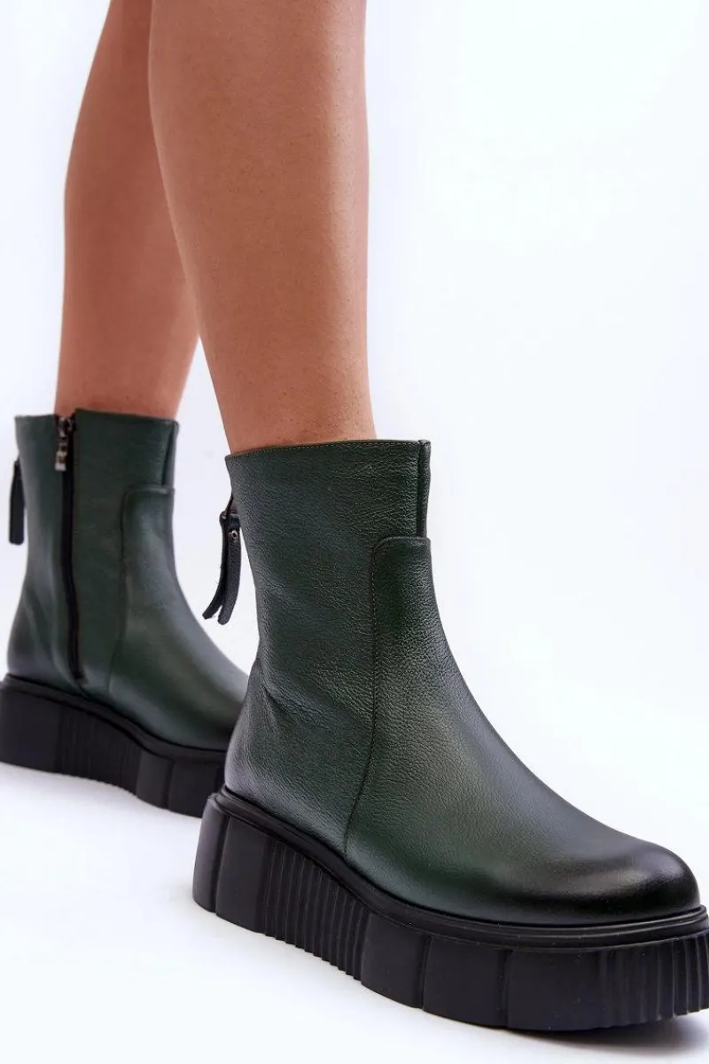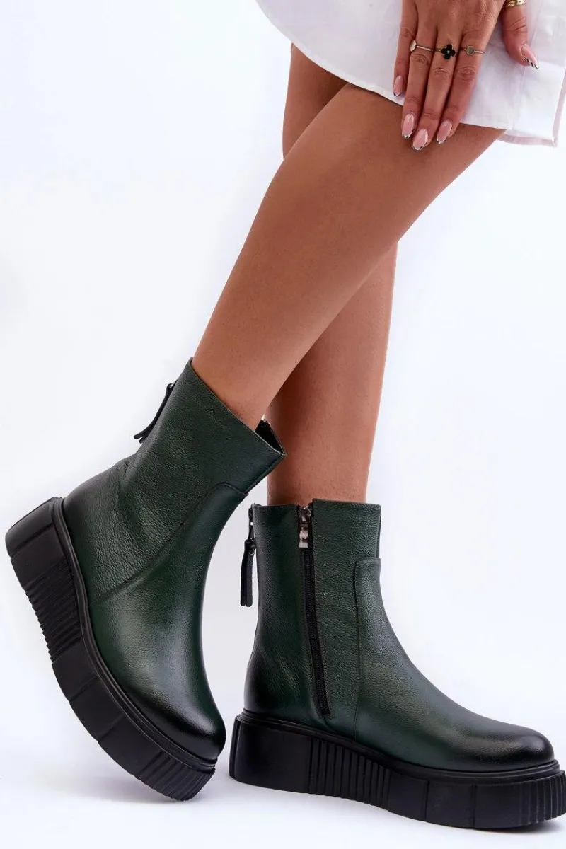 Botki damskie zostały wykonane z wysokiej jakości naturalnych skór. Osadzone na masywnej platformie z delikatnym koturnem. Zapinane z boku cholewki na suwak, natomiast suwak z tyłu jest ozdobny. Dodatkowo botki posiadają usztywniany zapiętek. Ocieplone w środku kocem obuwniczym. Model ten na pewno sprawdzi się w wielu jesiennych stylizacjach! Przy wyborze rozmiaru prosimy kierować się tabelą rozmiarów