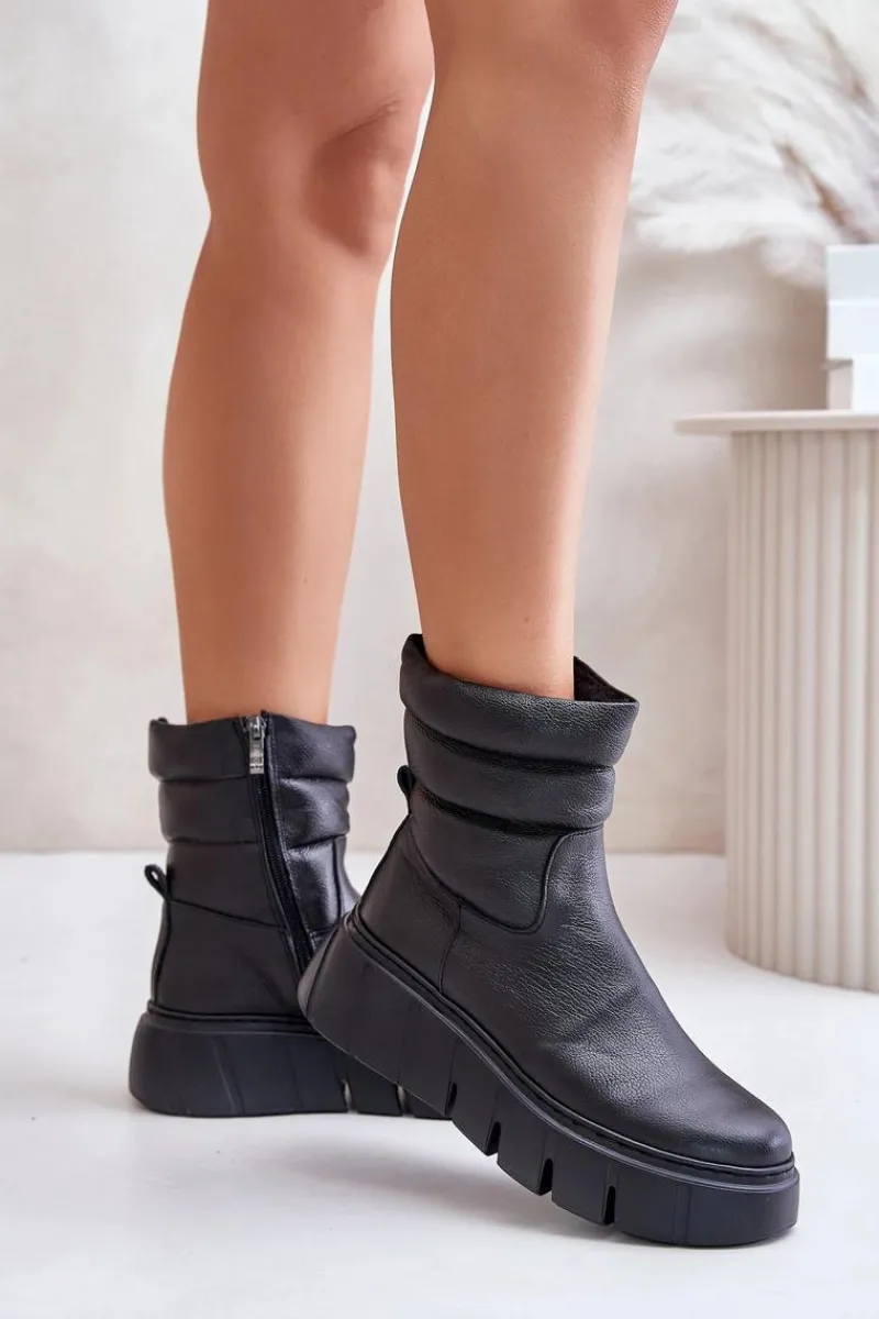 Damskie botki z wysokogatunkowej skóry naturalnej to doskonały wybór na jesień i zimę. Z boku cholewki posiadają praktyczny suwak, który ułatwia ich zakładanie. Osadzone na platformie z delikatnym koturnem, łączą w sobie nowoczesny styl i wygodę. Wnętrze ocieplone filcem zapewnia ciepło, a zaokrąglone noski dodają klasycznego uroku. Ten model z pewnością będzie świetnym dodatkiem do wielu jesienno-zimowych stylizacji. Przy wyborze rozmiaru prosimy kierować się tabelą rozmiarów
