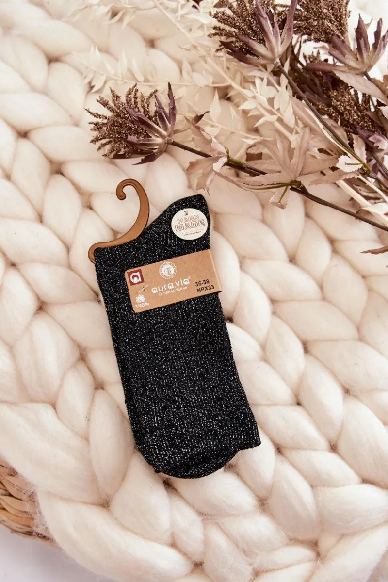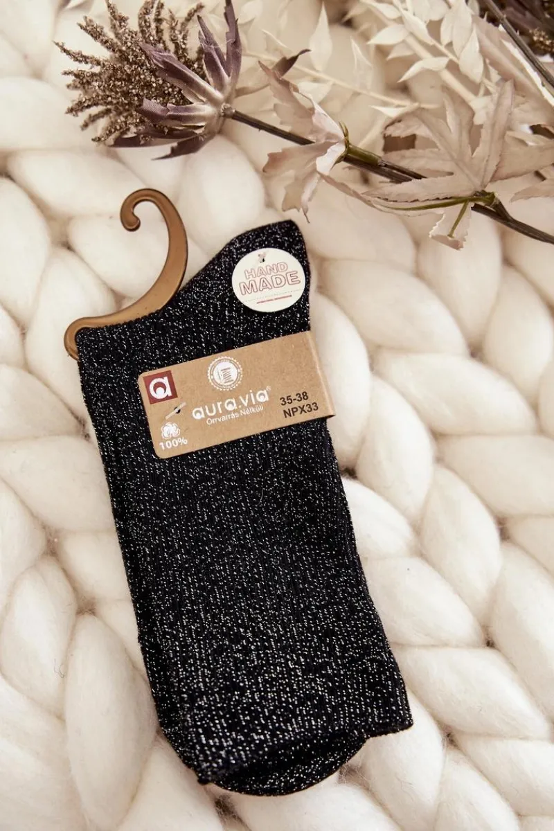 Damskie skarpetki o modnym fasonie zostały wykonane z bawełnianej tkaniny z dodatkiem lurexu, czyli nici metalizowanej. Skarpetki te są bezuciskowe. Model prążkowany, wykonany z wytrzymałej, przewiewnej tkaniny. Dodatkowo skarpetki są antybakteryjne. Model ten na pewno świetnie będzie prezentować się w wielu stylizacjach w chłodniejsze dni!