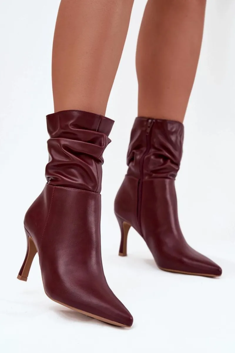 Eleganckie botki damskie z marszczoną cholewką to propozycja pełna kobiecego charakteru. Model ze szpiczastymi noskami i smukłą szpilką podkreśla nogi i dodaje stylu każdej stylizacji. Zamek z boku ułatwia szybkie zakładanie i idealne dopasowanie do stopy, czyniąc botki świetnym wyborem na wieczorne wyjścia i eleganckie okazje. Przy wyborze rozmiaru prosimy sugerować się tabelą rozmiarów.