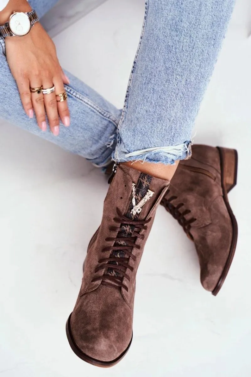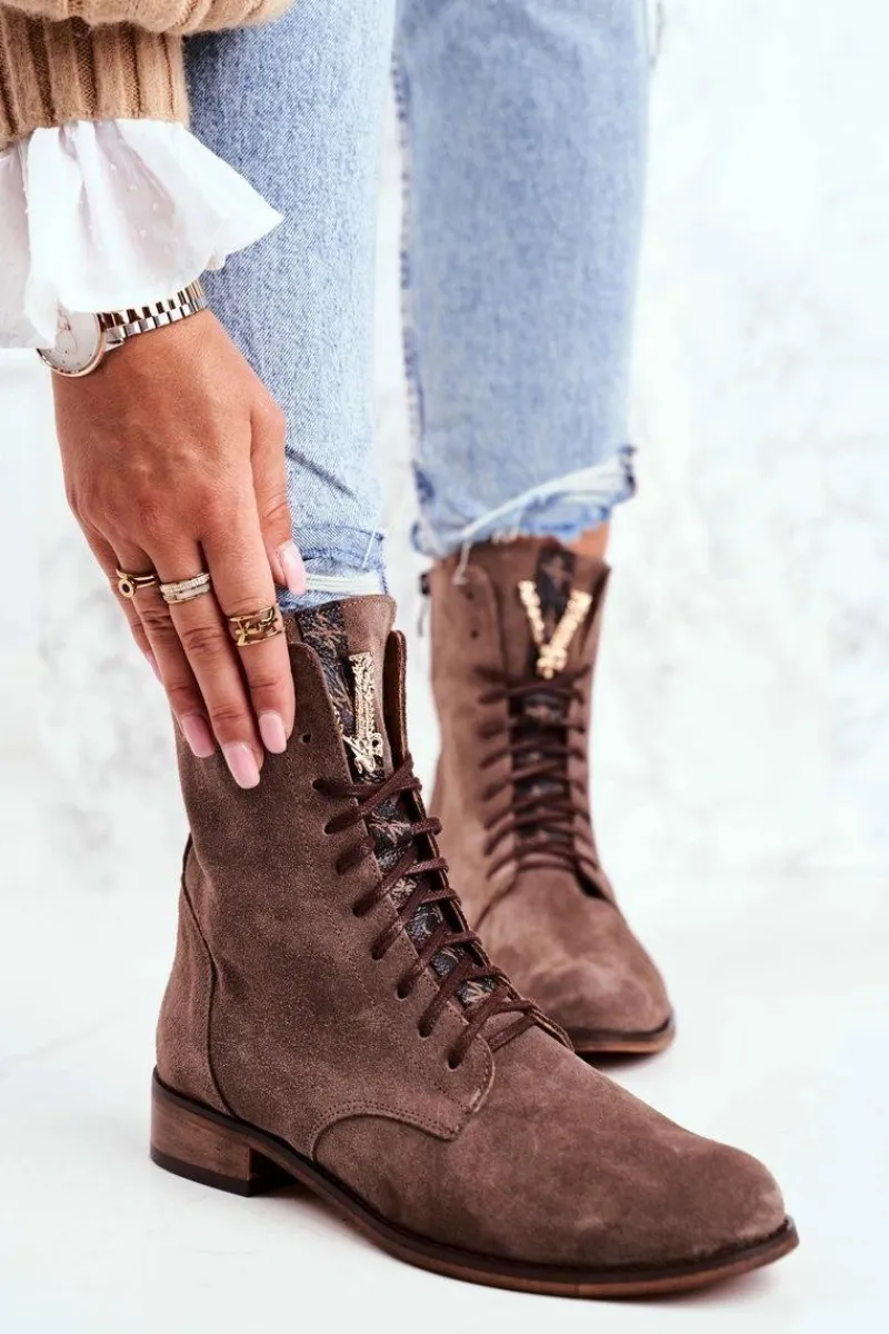 Online Botki Damskie Skórzane Nubuk Cappuccino Nicole 2593 Damskie Botki Sznurowane|Botki Zimowe Damskie