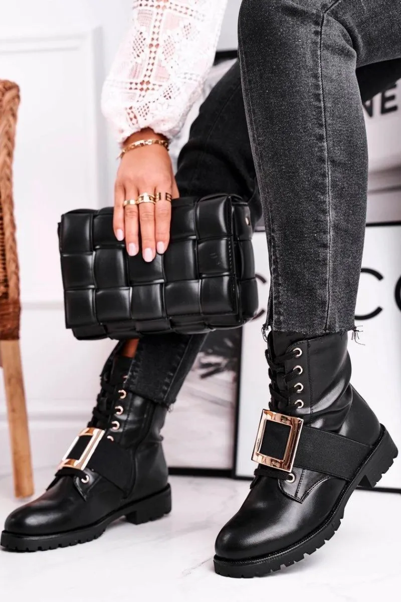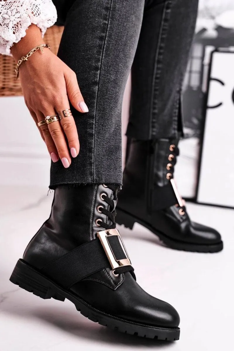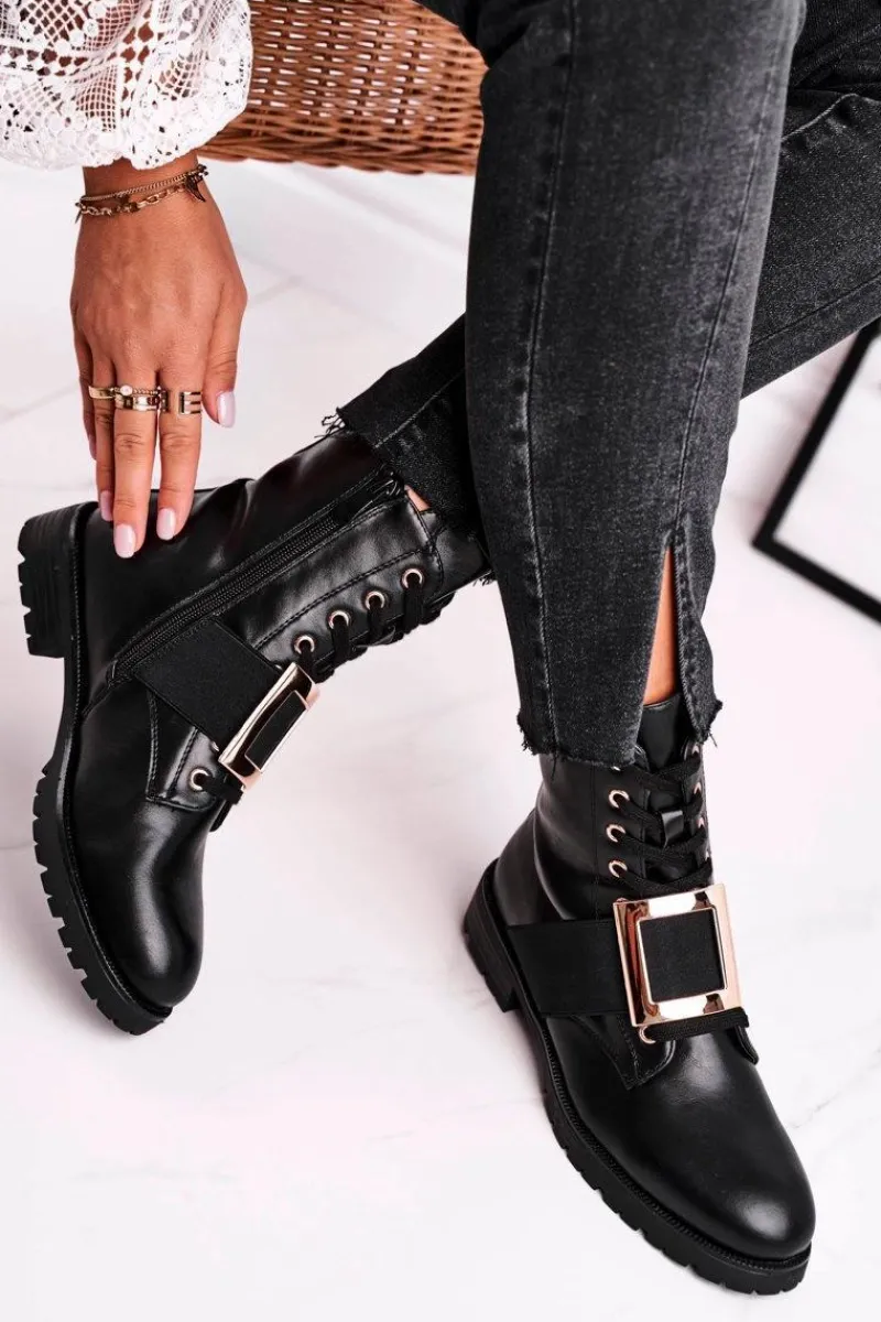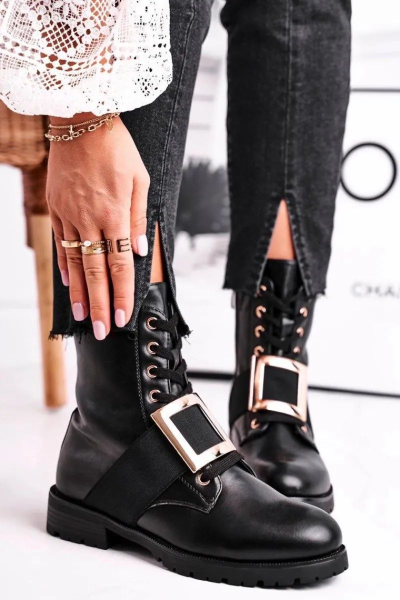 Online Botki Damskie Ze Złotą Klamrą Happy Su Czarne Damskie Botki Sznurowane|Czarne Botki