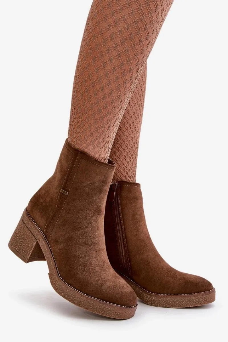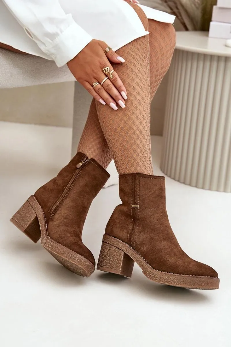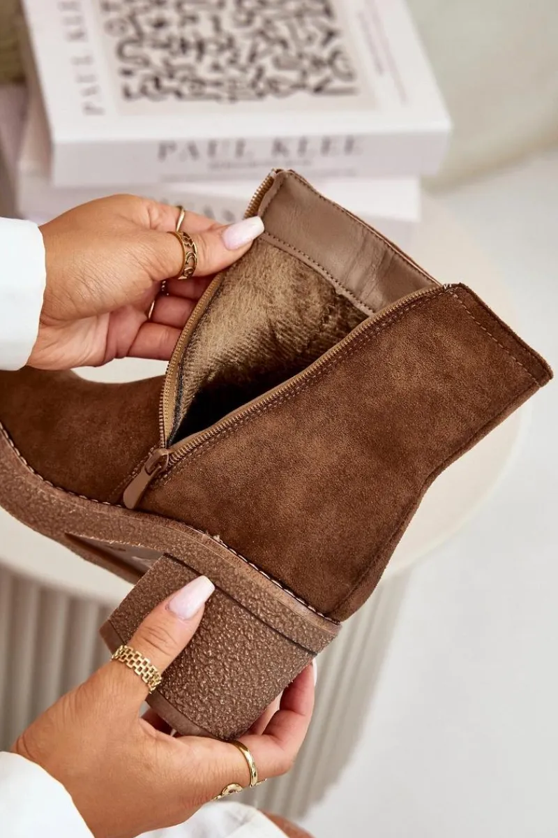 Damskie botki z eko zamszu, który jest miękki i przyjemny w dotyku. Osadzone na stabilnym obcasie w formie słupka, co zapewnia wygodę i pewność chodzenia przez cały dzień, jednocześnie dodając kilka centymetrów wzrostu i podkreślając sylwetkę. Wnętrze ocieplone jest kocem obuwniczym, który zapewnia ciepło i komfort w chłodniejsze dni, chroniąc stopy przed zimnem. Dzięki zapięciu na zamek, ich zakładanie i zdejmowanie jest szybkie i bezproblemowe, co jest dużym atutem w codziennym użytkowaniu. Przy wyborze rozmiaru prosimy sugerować się tabelą rozmiarów.