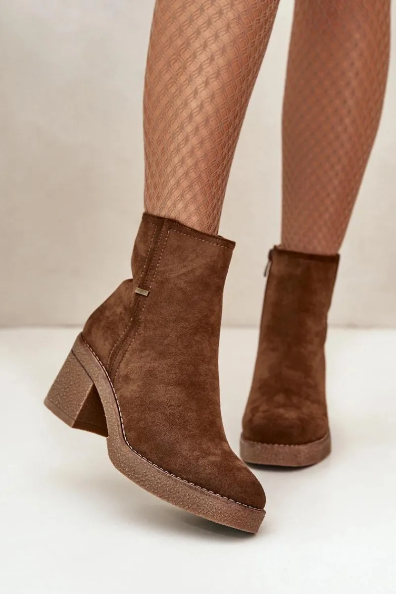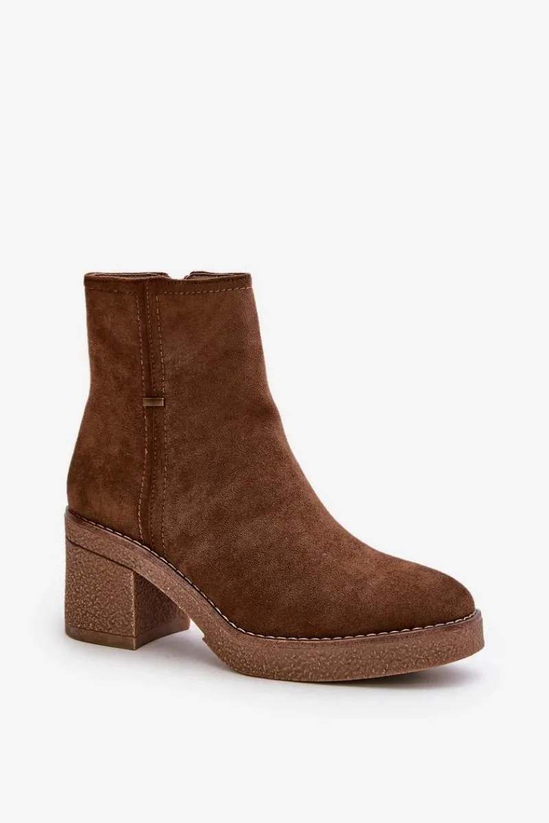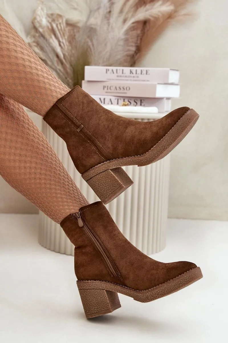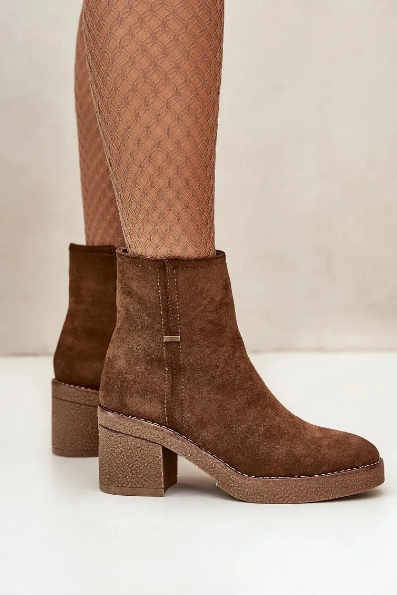 Damskie botki z eko zamszu, który jest miękki i przyjemny w dotyku. Osadzone na stabilnym obcasie w formie słupka, co zapewnia wygodę i pewność chodzenia przez cały dzień, jednocześnie dodając kilka centymetrów wzrostu i podkreślając sylwetkę. Wnętrze ocieplone jest kocem obuwniczym, który zapewnia ciepło i komfort w chłodniejsze dni, chroniąc stopy przed zimnem. Dzięki zapięciu na zamek, ich zakładanie i zdejmowanie jest szybkie i bezproblemowe, co jest dużym atutem w codziennym użytkowaniu. Przy wyborze rozmiaru prosimy sugerować się tabelą rozmiarów.