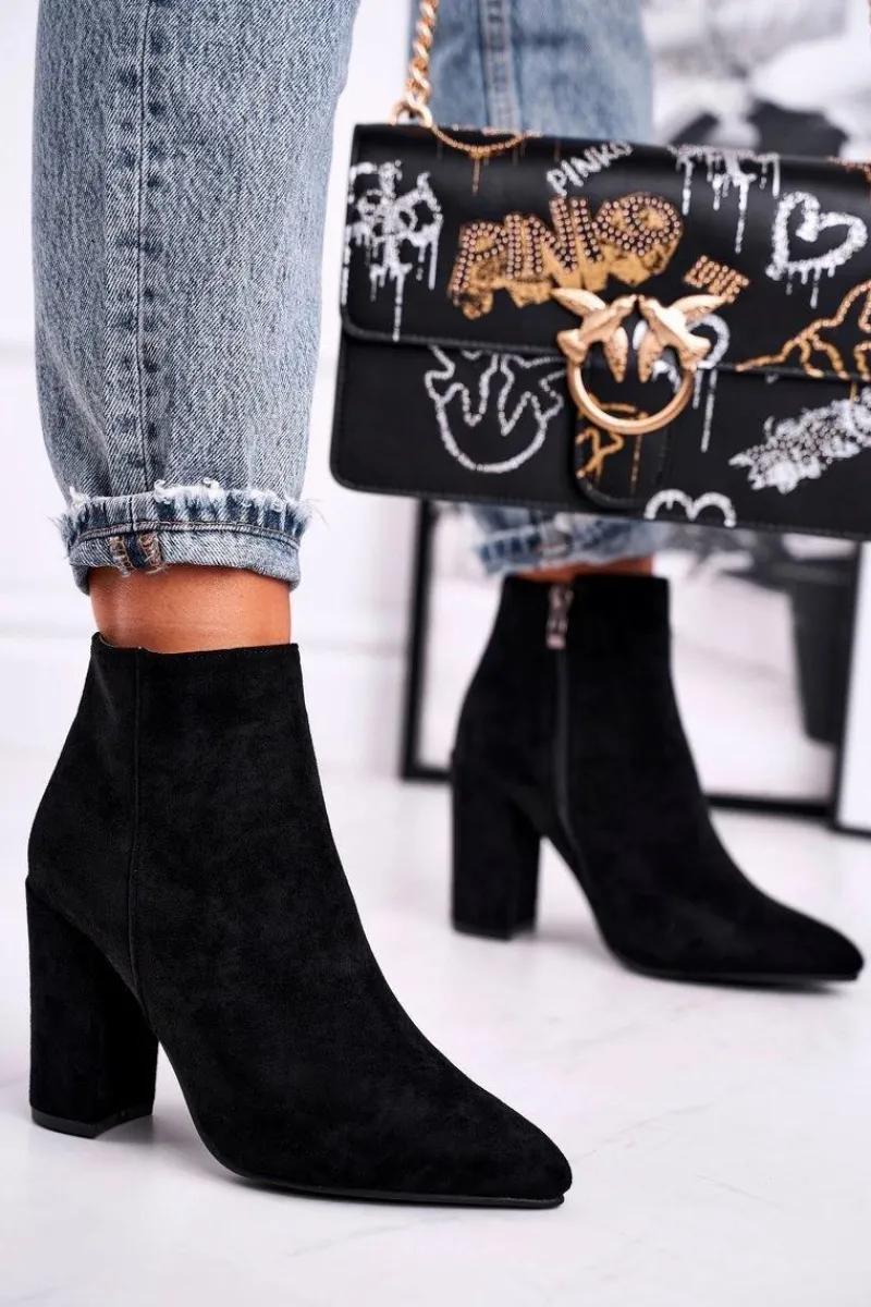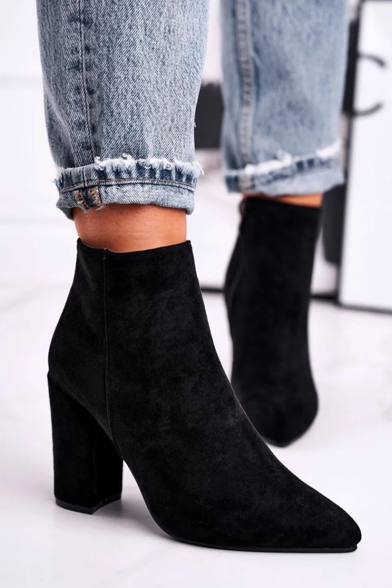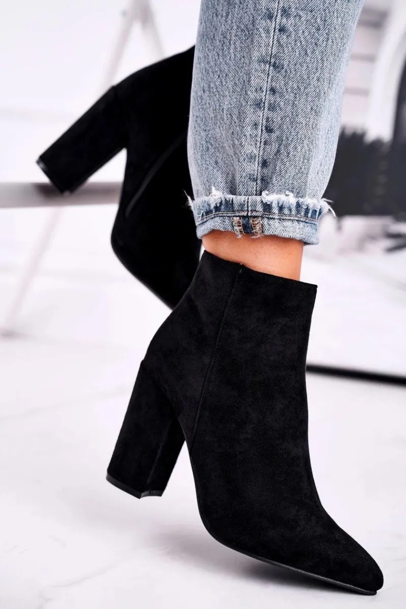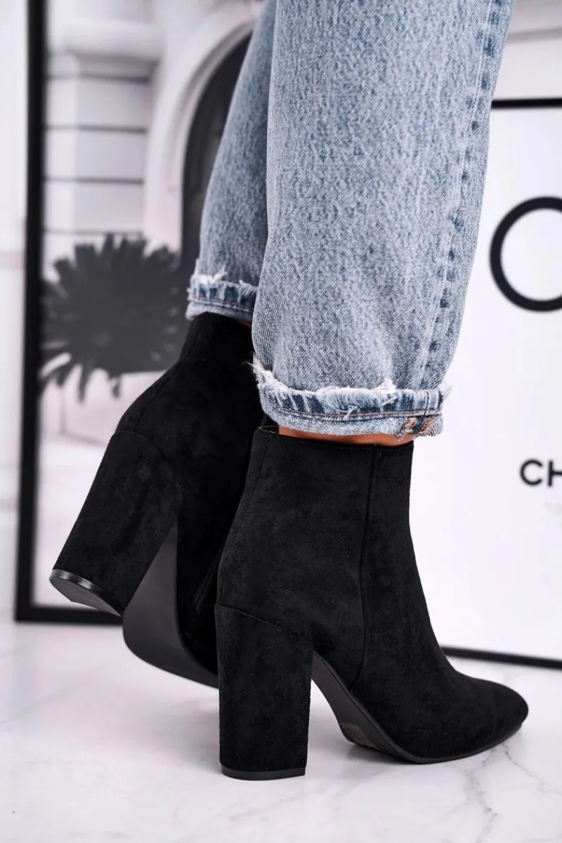 Zamszowe botki na słupku. Wnętrze ocieplone miłym w dotyku kocem obuwniczym z krótkim włosiem. Zapinane na zamek. Przy wyborze rozmiaru prosimy sugerować się tabelą rozmiarów, która dostępna jest po najechaniu bądź kliknięciu w dany rozmiar.
