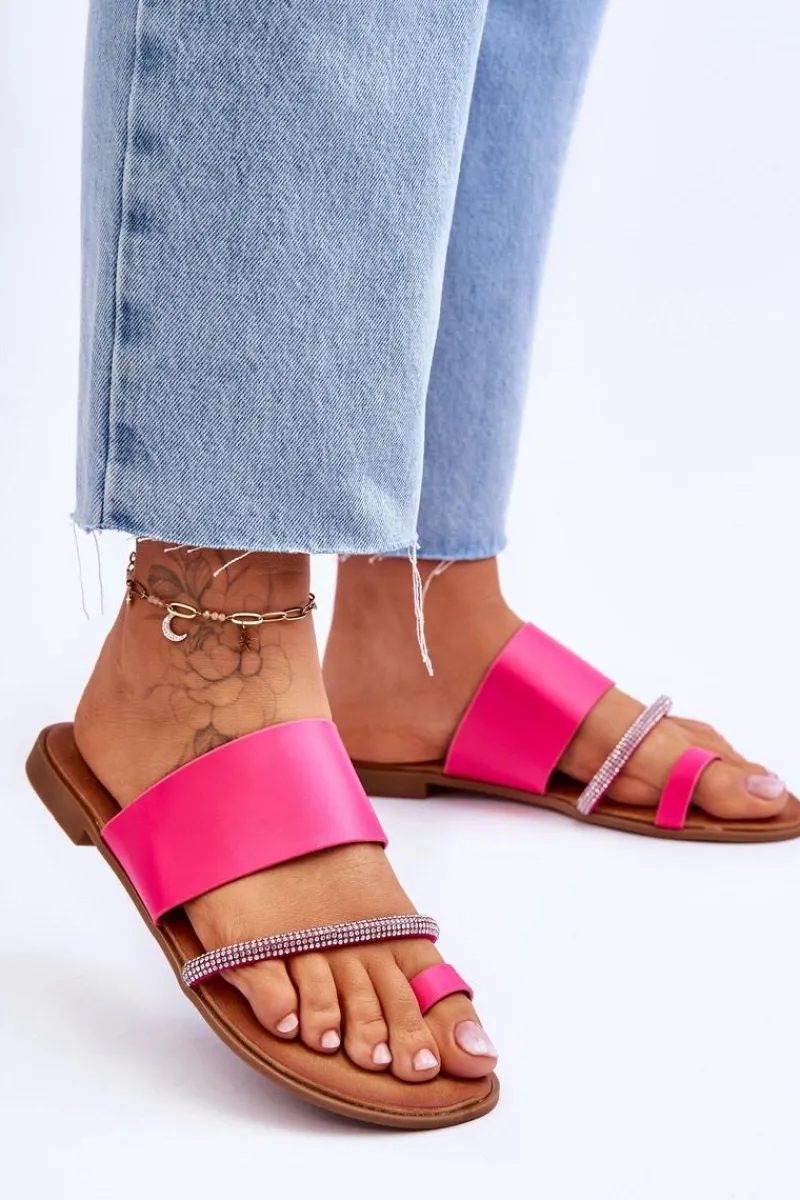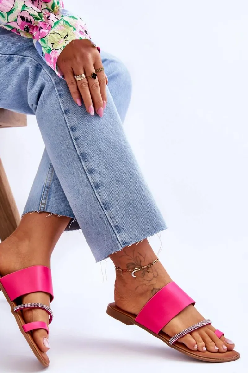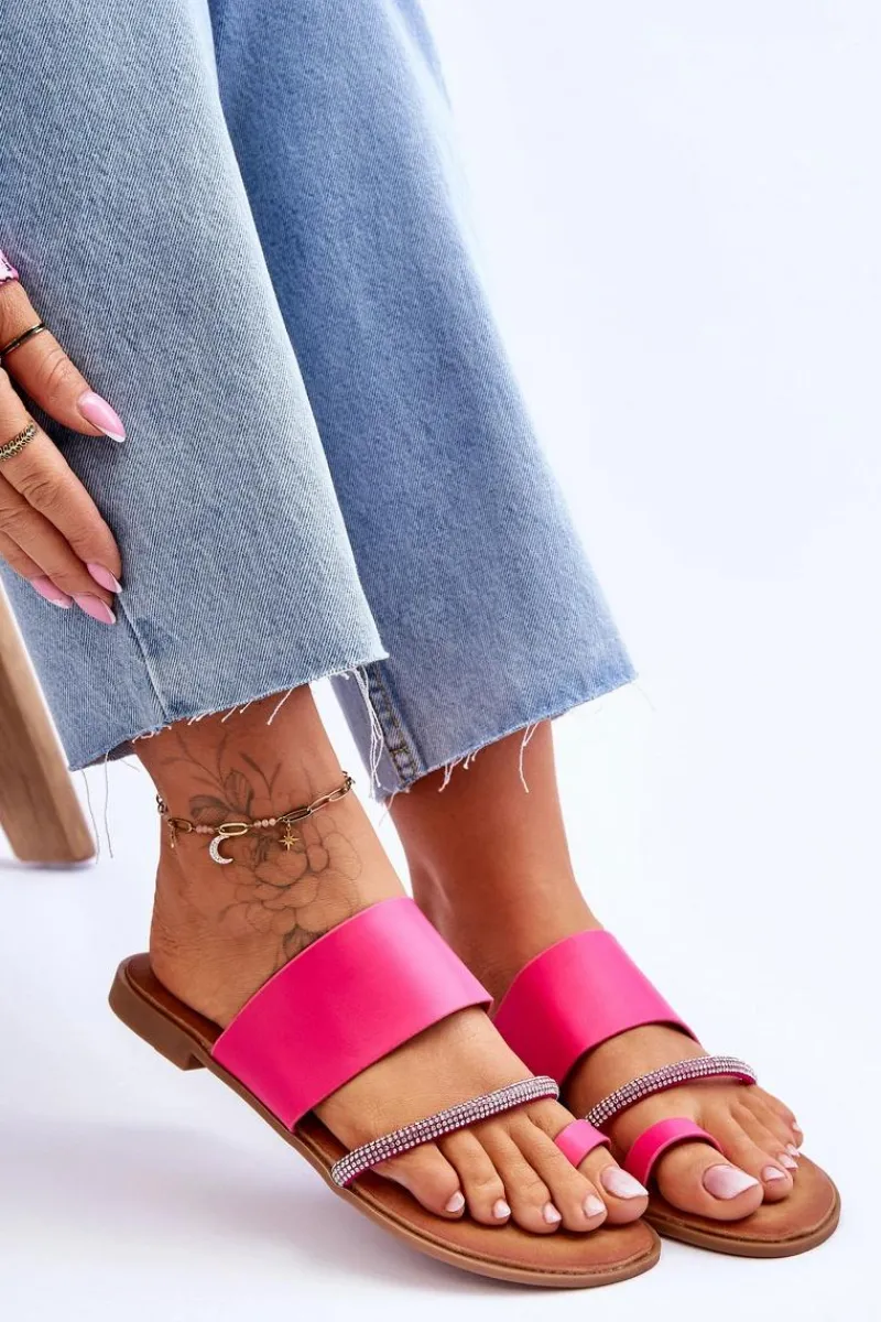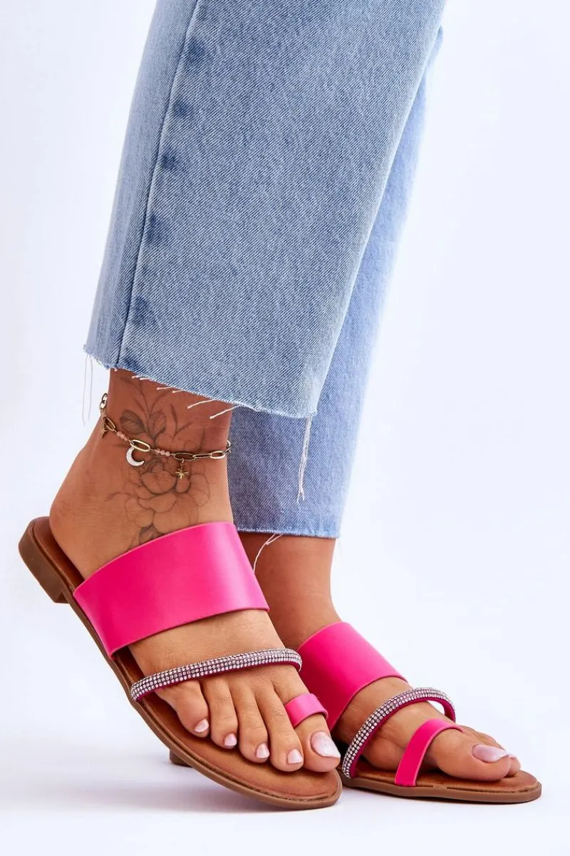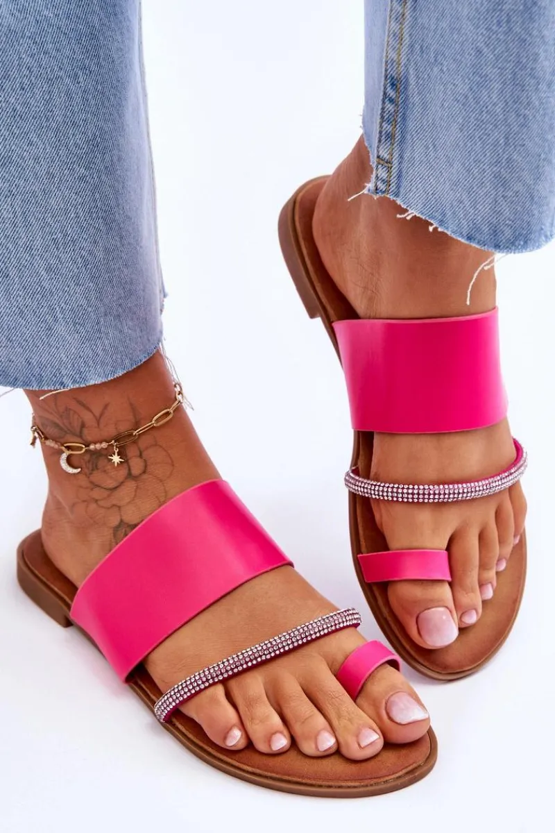 Klasyczne klapki o fasonie japonek zostały wykonane z eko skóry. Posiadają ozdobny paseczek z mieniącymi się dżetami imitującymi cyrkonie. Osadzone na płaskim obcasie z podeszwą z tworzywa sztucznego. Model ten świetnie sprawdzi się do wielu letnich stylizacji. Japonki posiadają miękką, eko skórzaną wkładkę.