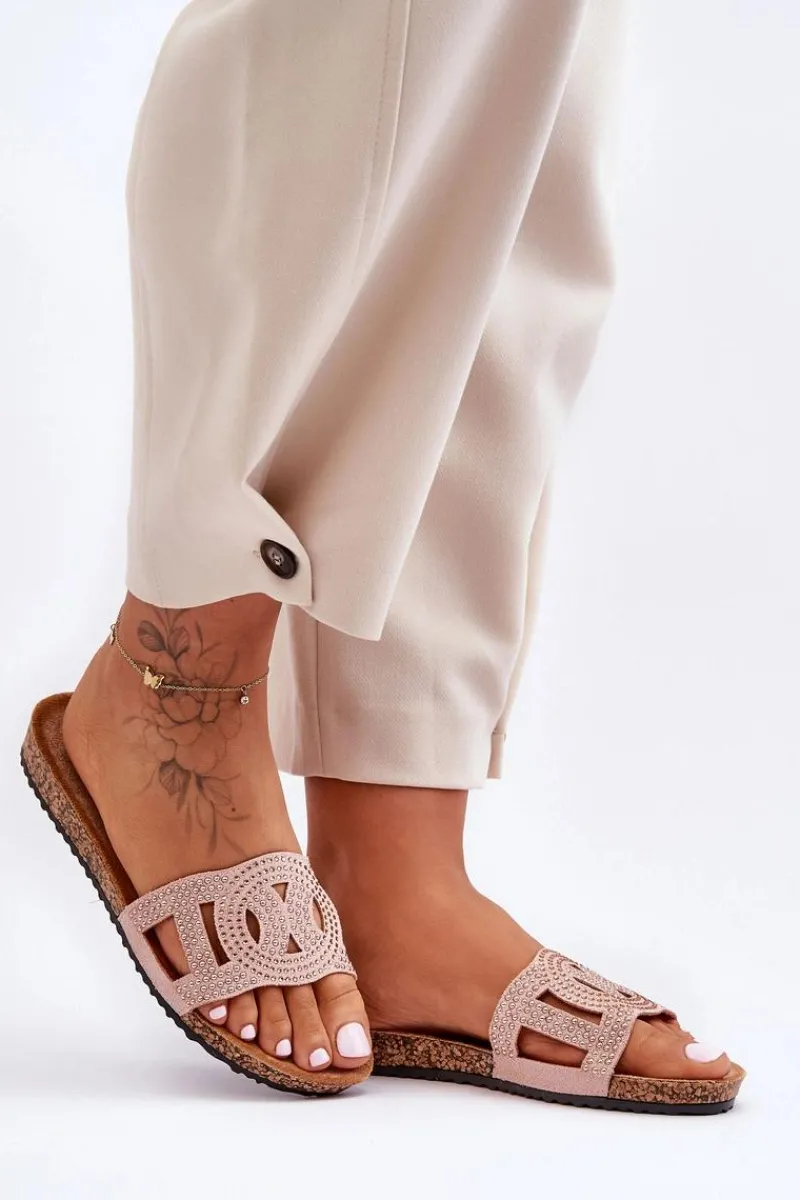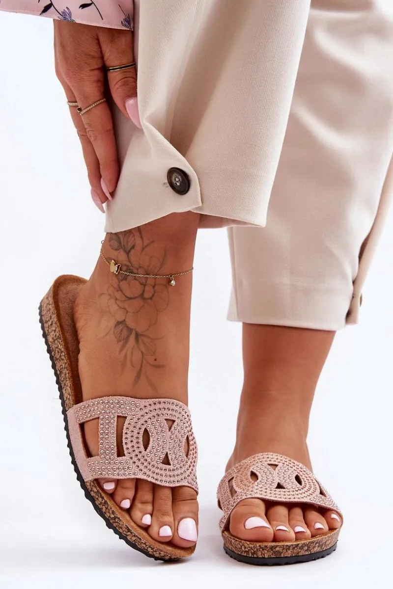 Klasyczne klapki damskie zostały wykonane z miłego w dotyku eko zamszu i ozdobione modnymi ćwiekami z przodu. Klapki są idealne na letnie spacery czy wyjścia na zakupy. Profilowana wkładka także została wykonana z eko zamszu. Klapki osadzono na korkowej podeszwie.