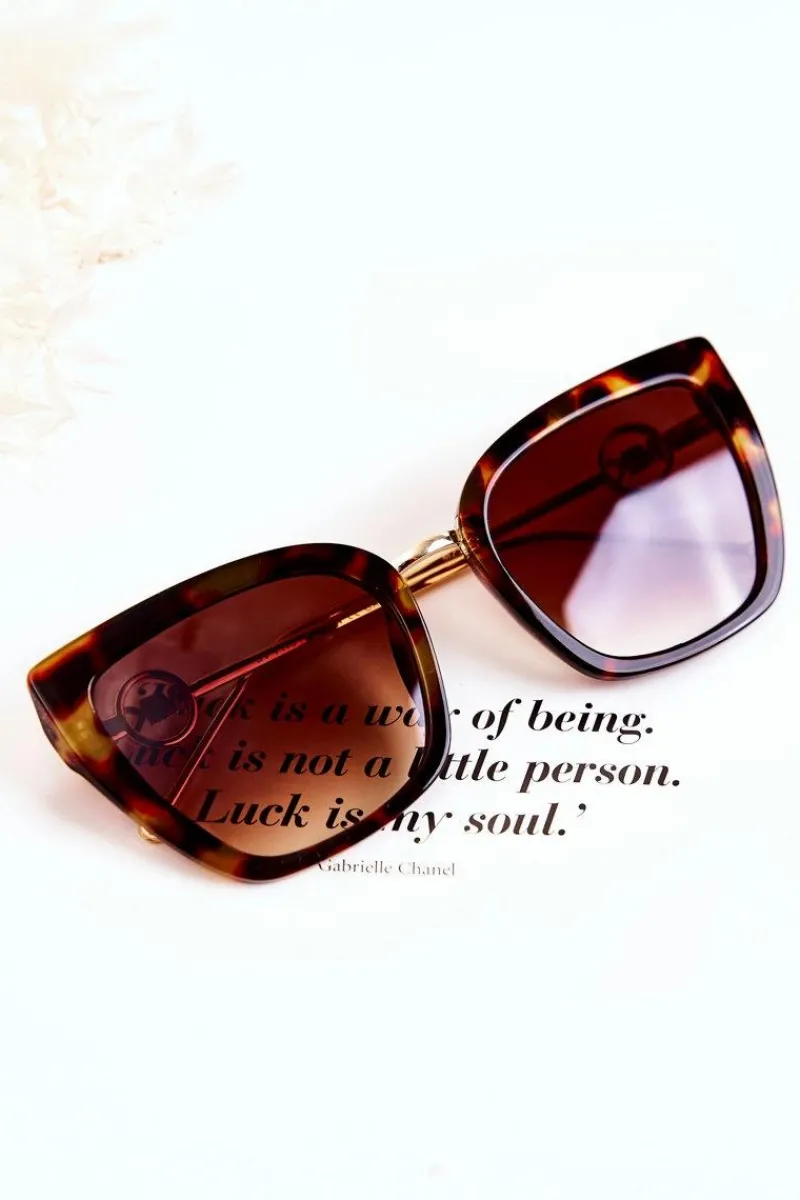 Wyjątkowe okulary przeciwsłoneczne świetnie sprawdzą się w wielu sytuacjach! Nie tylko podczas letniego sezonu, ale także zimowego, kiedy promienie słoneczne odbijają się od śniegu. Model o kształcie kocich oczu. Wykonane z tworzywa sztucznego oraz metalu. Soczewki z delikatnymi oprawkami. Zauszniki złote oraz cienkie, z ozdobnym logo. Informacja od producenta: okulary chronią przed szkodliwym promieniowaniem UV, kategoria 3.