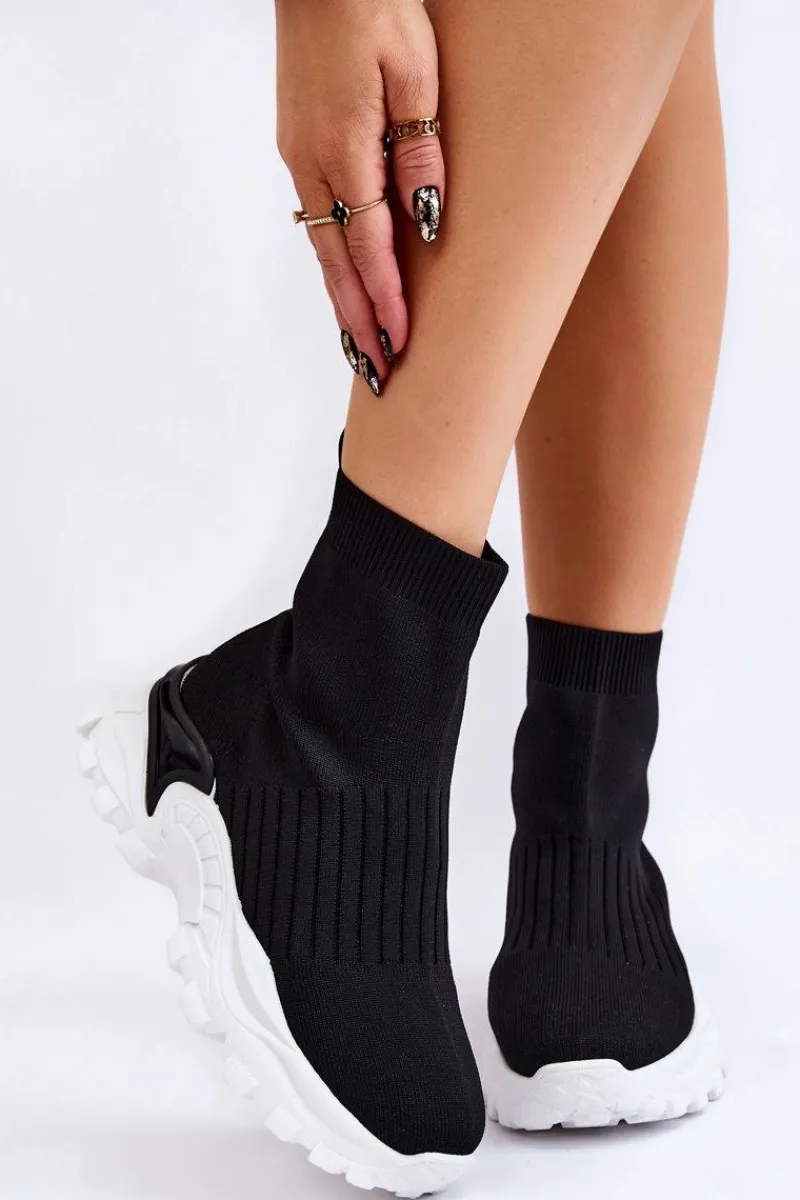 Buty sportowe zostały wykonane z materiału tekstylnego z wysoką cholewką sięgającą za kostkę. Nosek zaokrąglony. Model wsuwany ze ściągaczem u góry cholewki. Wykonane z elastycznego materiału, który dobrze dopasuje się do stopy. Wkładka z materiału jest wyciągana. Osadzone na płaskim obcasie i platformie. Przy wyborze rozmiaru prosimy kierować się tabelą rozmiarów.