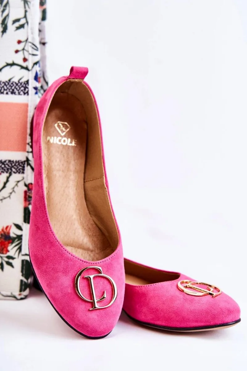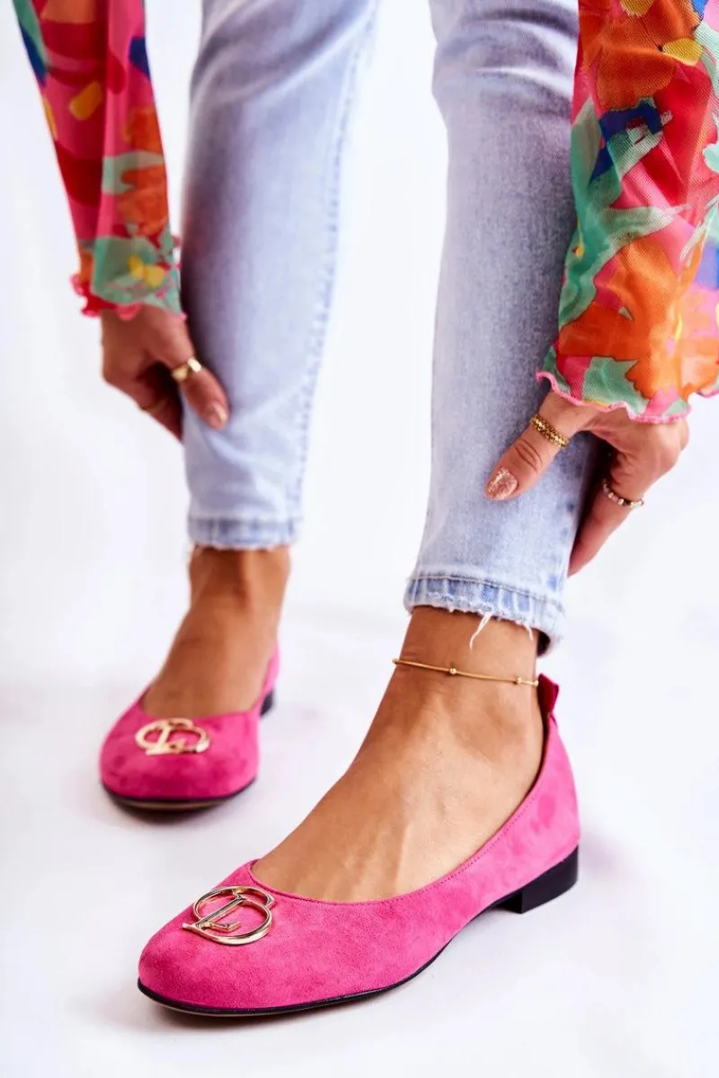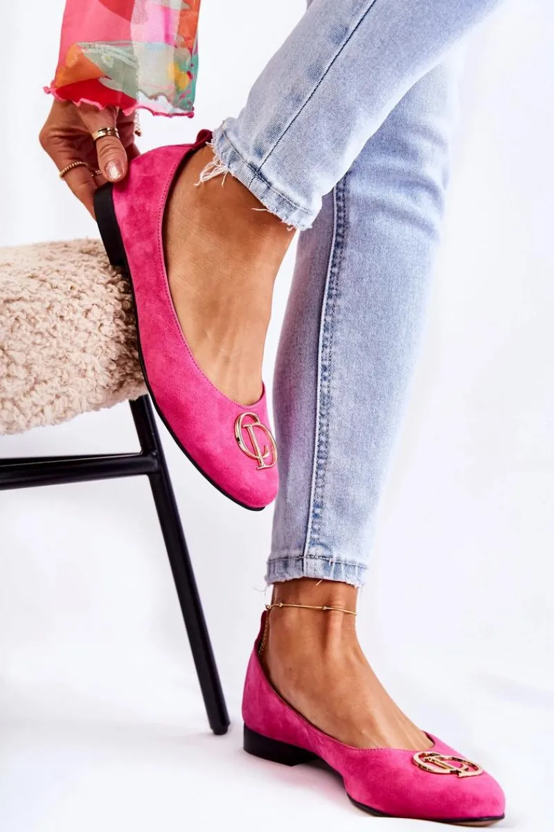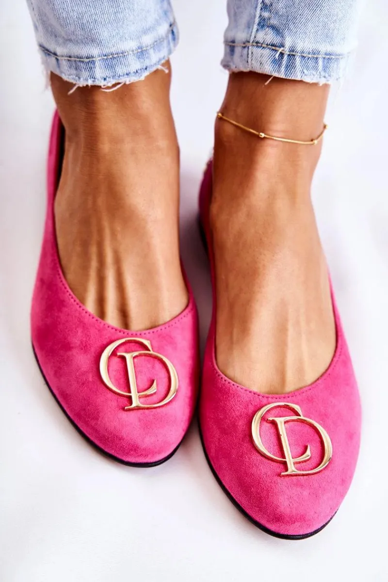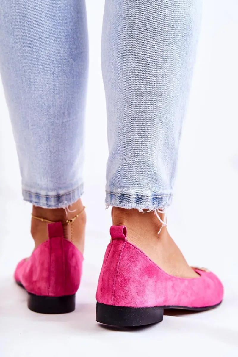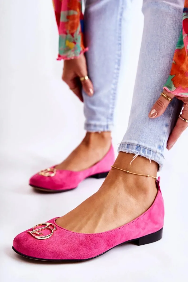 Eleganckie baleriny wykonane z wysokiej jakości naturalnego zamszu. Posiadają delikatnie zaokrąglony nosek. Model wsuwany. Osadzone na niewysokim, płaskim obcasie. Na przodzie znajduje się ozdoba w kształcie liter. Wkładka wykonana z naturalnej skóry jest bardzo miękka i wygodna podczas użytkowania. W tych balerinach poczujesz się niezwykle swobodnie. Komfort użytkowania gwarantowany! Koniecznie powinnaś je mieć w swojej garderobie! Przy wyborze rozmiaru prosimy sugerować się tabelą rozmiarów.