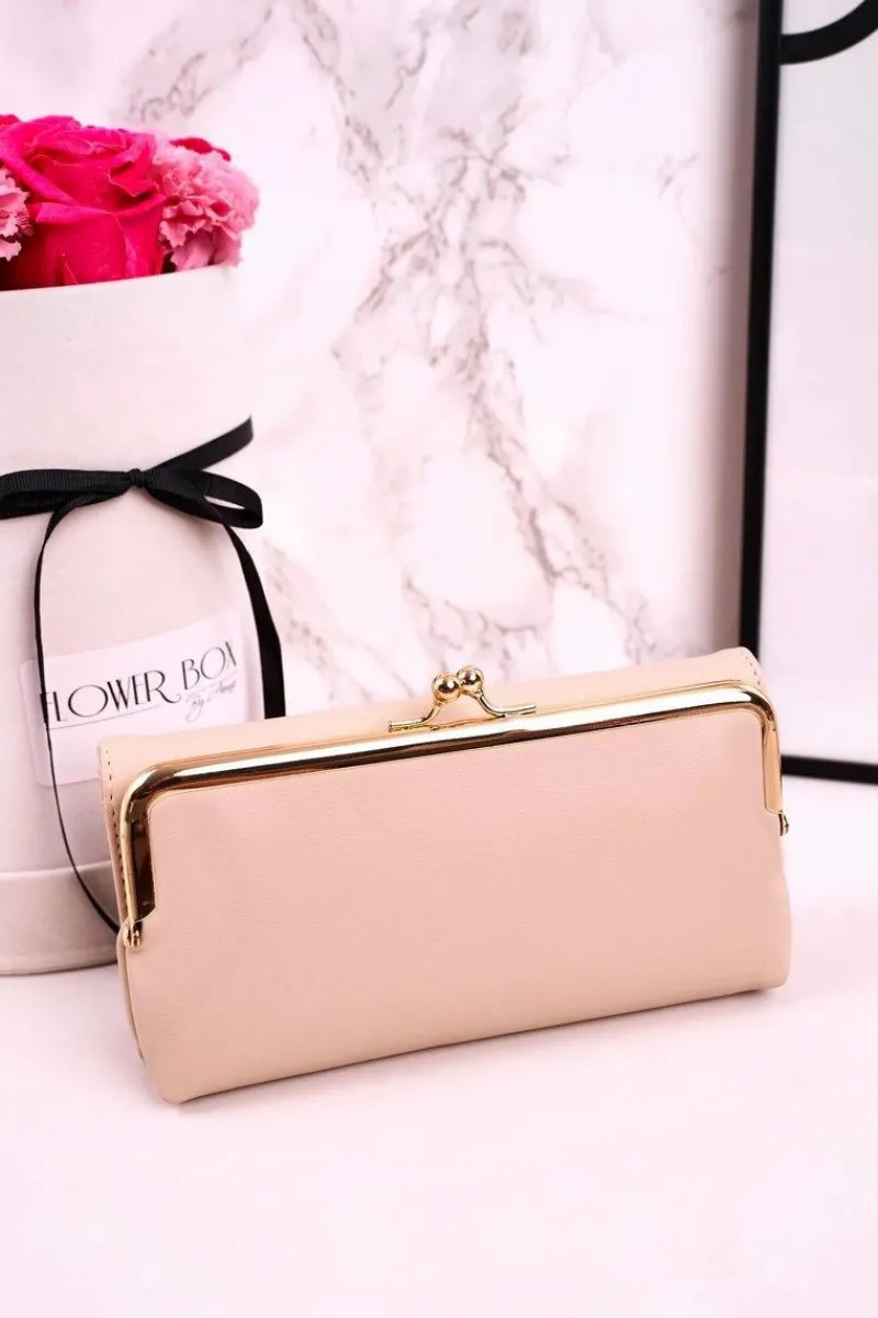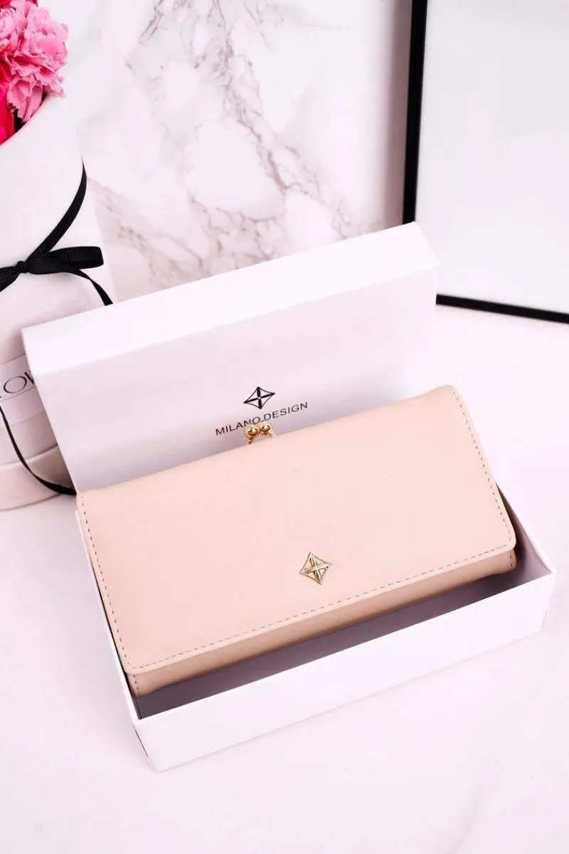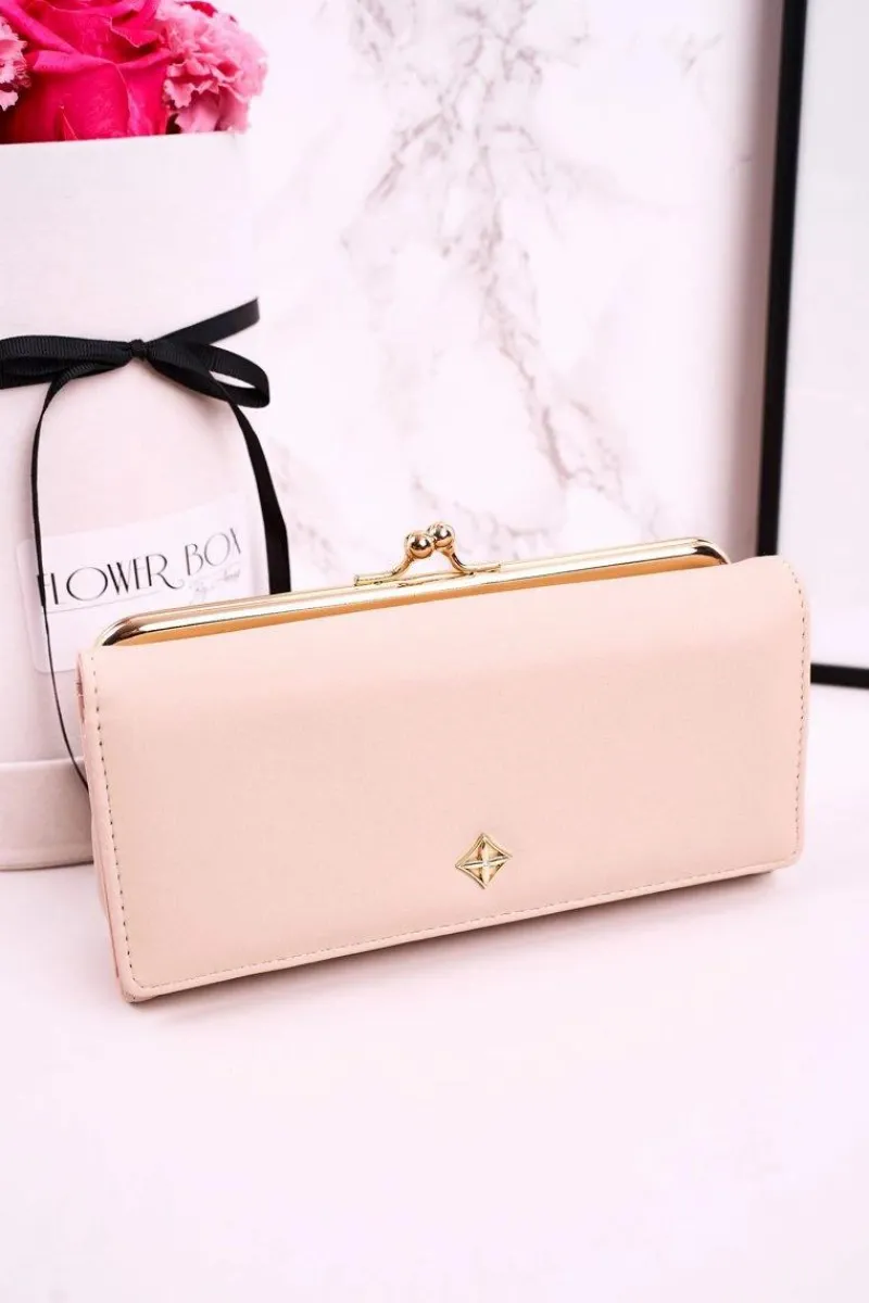Duży portfel damski zapinany na bigiel. Portfel pomieści bilon, banknoty oraz karty płatnicze. Wykonany ze skóry ekologicznej.