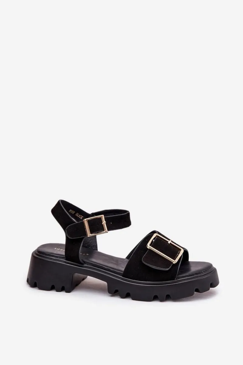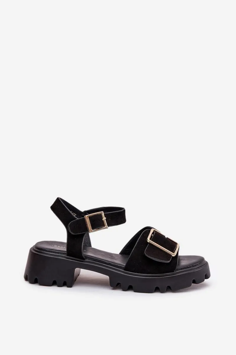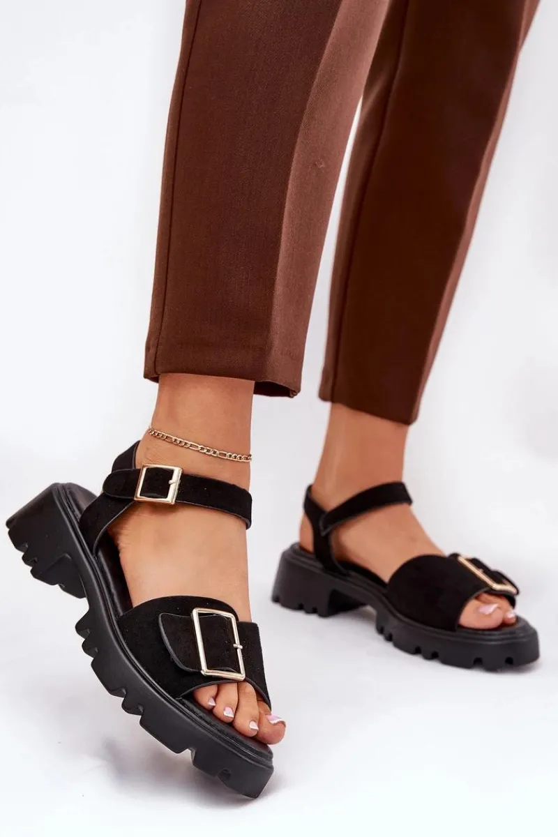 Eleganckie sandały damskie wykonane z eko zamszu, osadzone na platformie oraz płaskim obcasie, które zapewniają wygodę i stabilność. Z przodu buty ozdobione zostały dużą złotą klamrą, która dodaje im subtelnej elegancji i charakteru. Zapinane na regulowany pasek ze sprzączką, co pozwala na idealne dopasowanie do stopy. Te sandały to doskonały wybór na ciepłe dni, pasujące zarówno do sukienek, jak i spodni, łącząc styl i komfort w każdej stylizacji. Przy wyborze rozmiaru prosimy sugerować się tabelą rozmiarów.