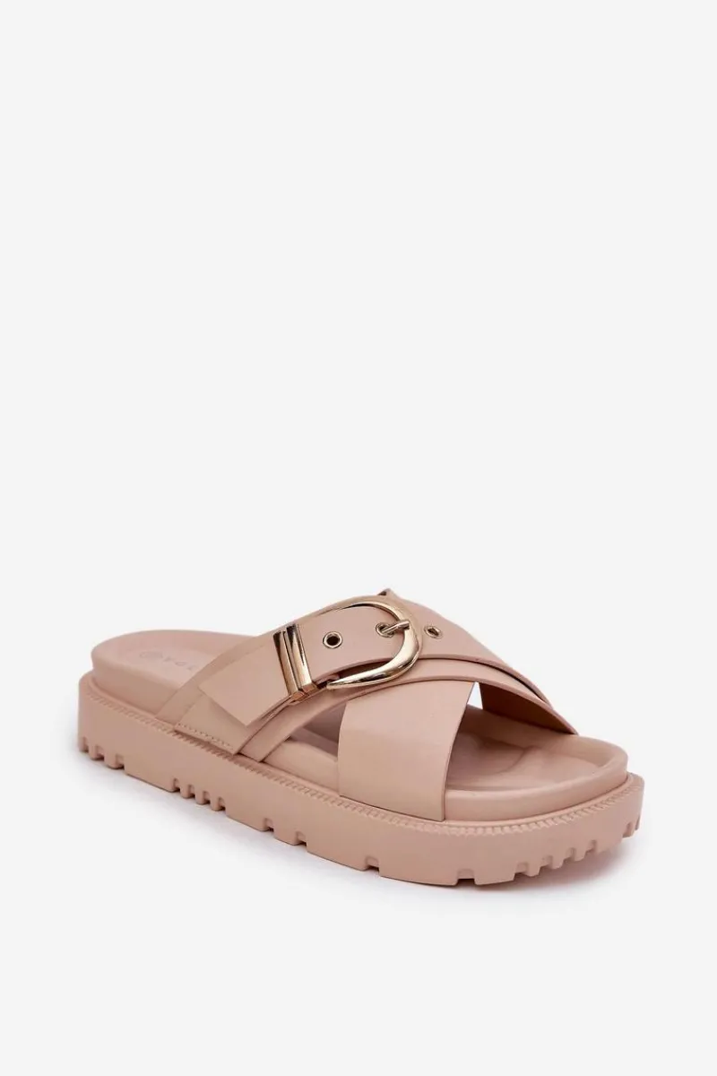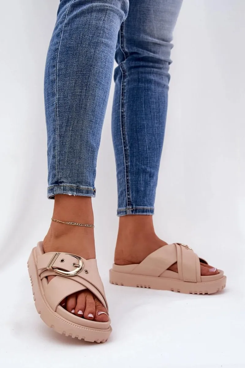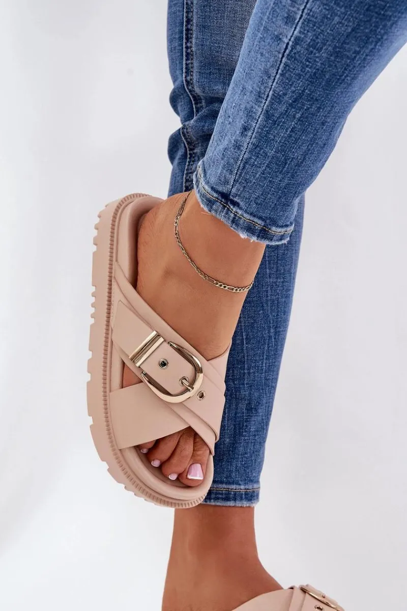 Klapki na platformie wykonane z eko skóry to modna i wygodna propozycja na ciepłe dni. Z przodu znajdują się dwa szerokie, krzyżujące się paski, które dodają nowoczesnego charakteru. Duża klamra na pasku przyciąga uwagę, nadając wyrazistego stylu. Te klapki łączą komfort z eleganckim designem, idealnie pasując do letnich stylizacji. Przy wyborze rozmiaru prosimy sugerować się tabelą rozmiarów.</p