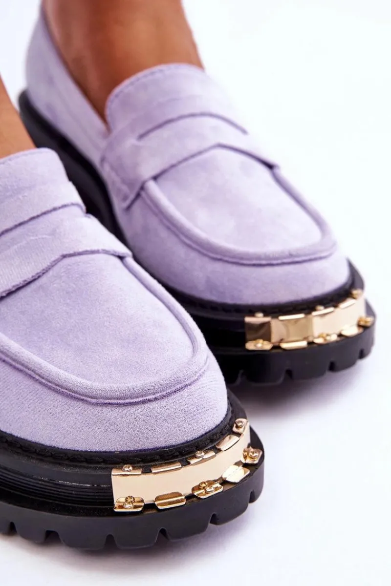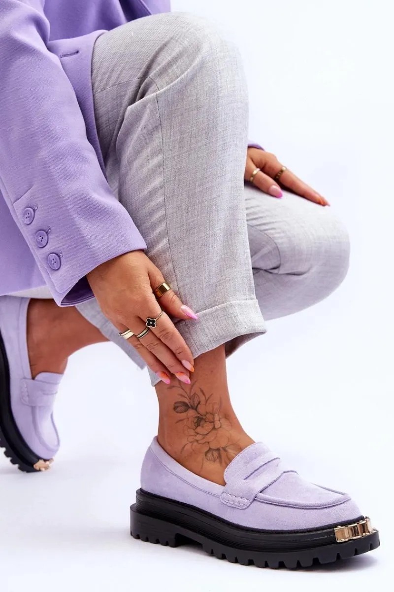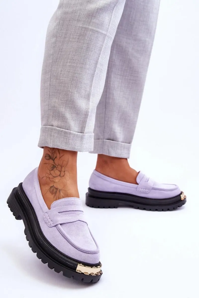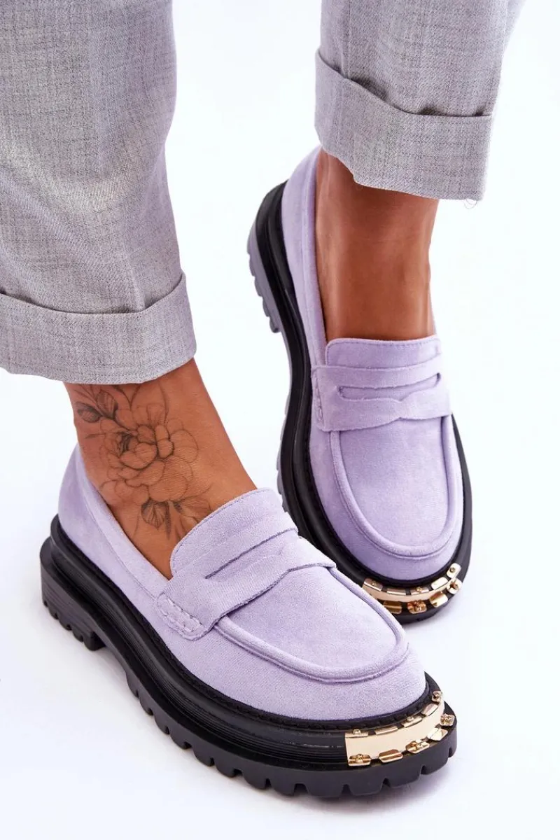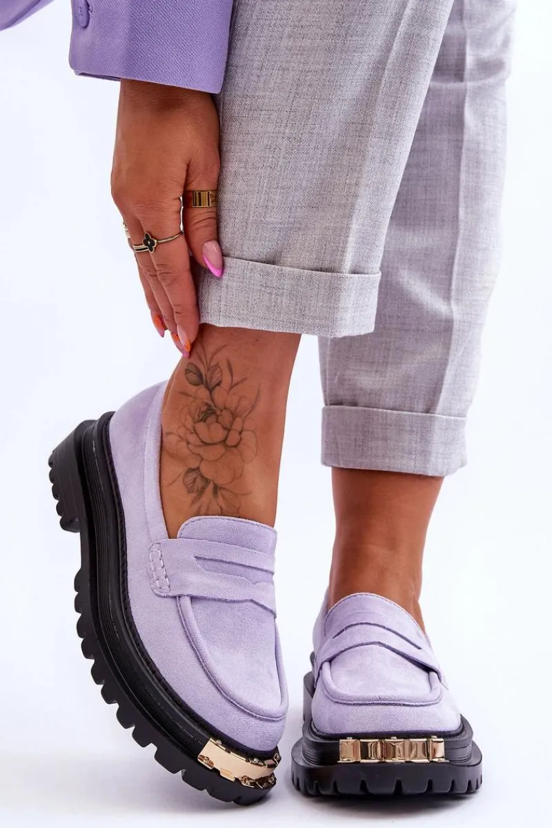 Klasyczne mokasyny zostały wykonane z ekologicznego zamszu. Na przodzie platformy posiadają ozdobne elementy. Osadzone na płaskim obcasie. Podeszwa z tworzywa sztucznego ze żłobieniami świetnie odizoluje od nierównego podłoża. Model wsuwany z usztywnianym zapiętkiem. Koniecznie powinnaś je mieć! Przy wyborze rozmiaru prosimy sugerować się tabelą rozmiarów.