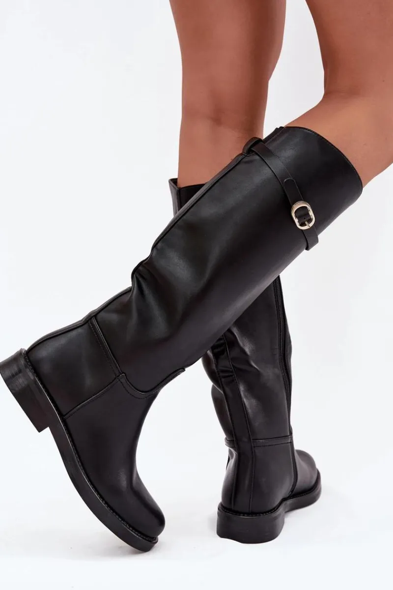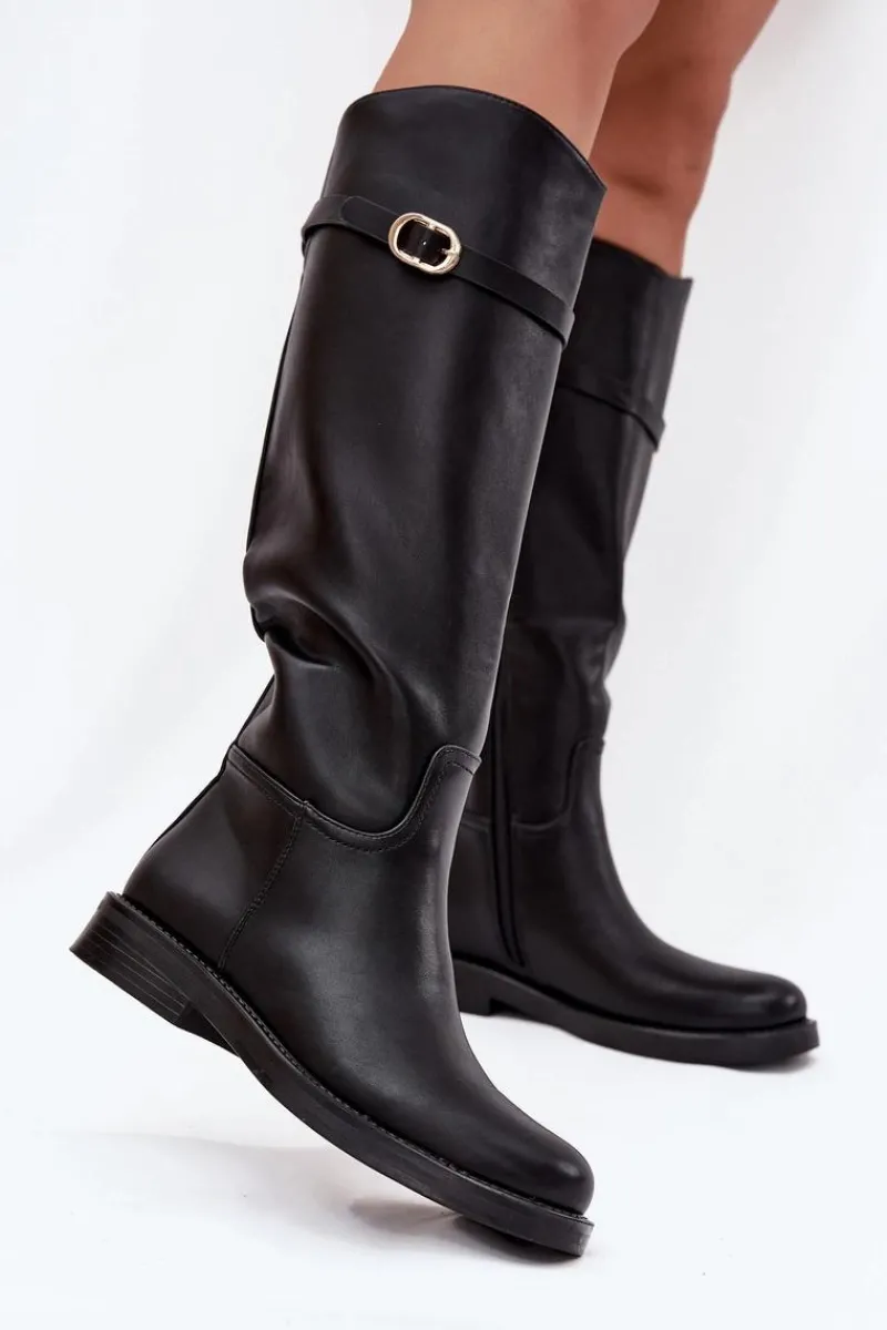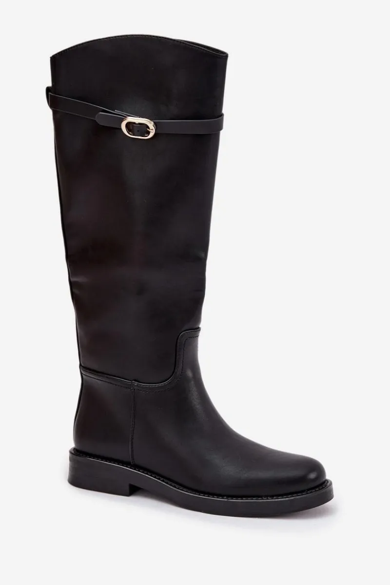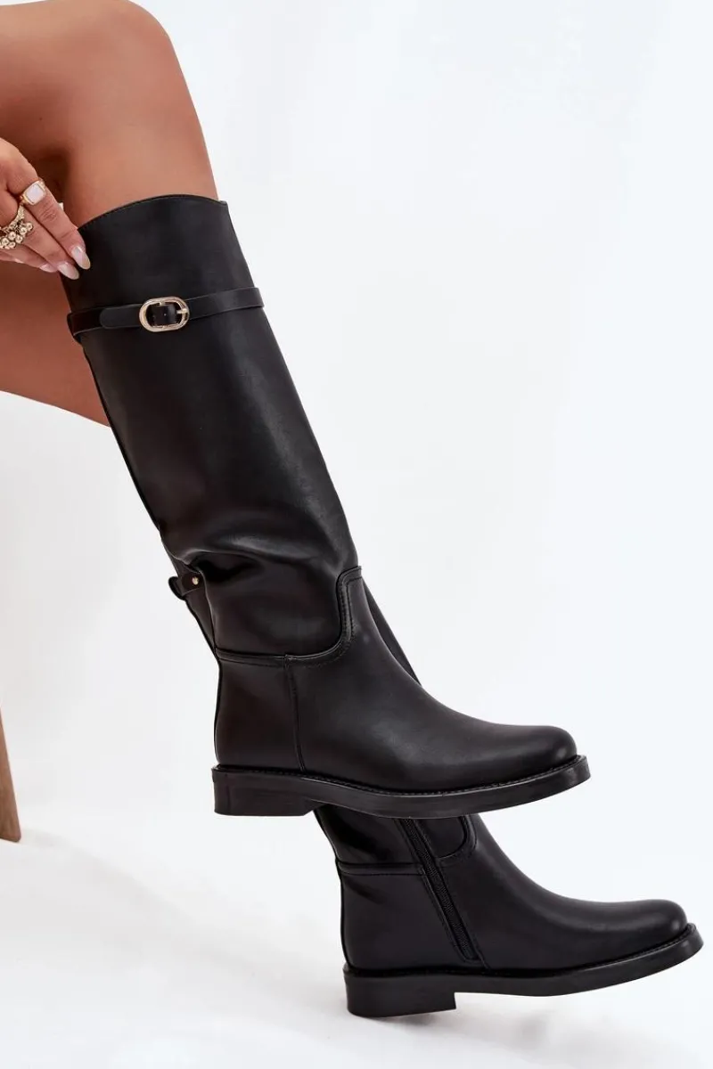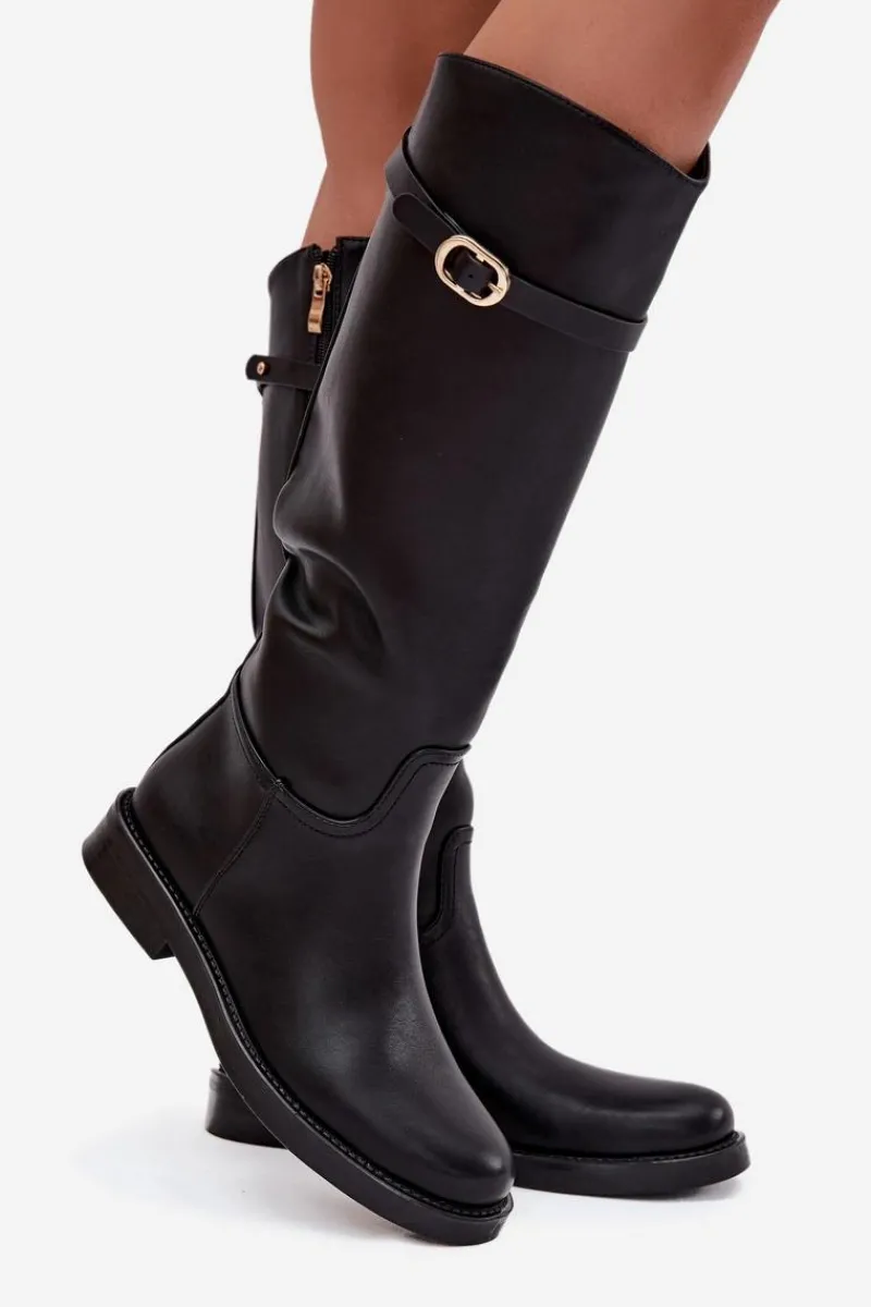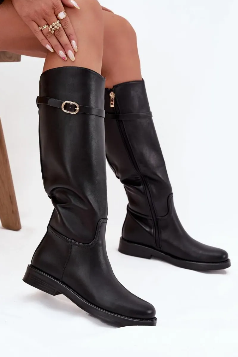 Kozaki damskie z eko skóry to połączenie prostoty i subtelnego stylu. Osadzone na płaskim obcasie, zapewniają wygodę przy codziennym noszeniu, a zamek ułatwia szybkie zakładanie. Wnętrze ocieplone na wysokości stopy gwarantuje komfort w chłodniejsze dni. Dodatkowo cienki paseczek ze złotą klamrą, który można odpiąć, wprowadza elegancki akcent i pozwala na drobną zmianę stylu w zależności od okazji. Przy wyborze rozmiaru prosimy kierować tabelą rozmiarów.