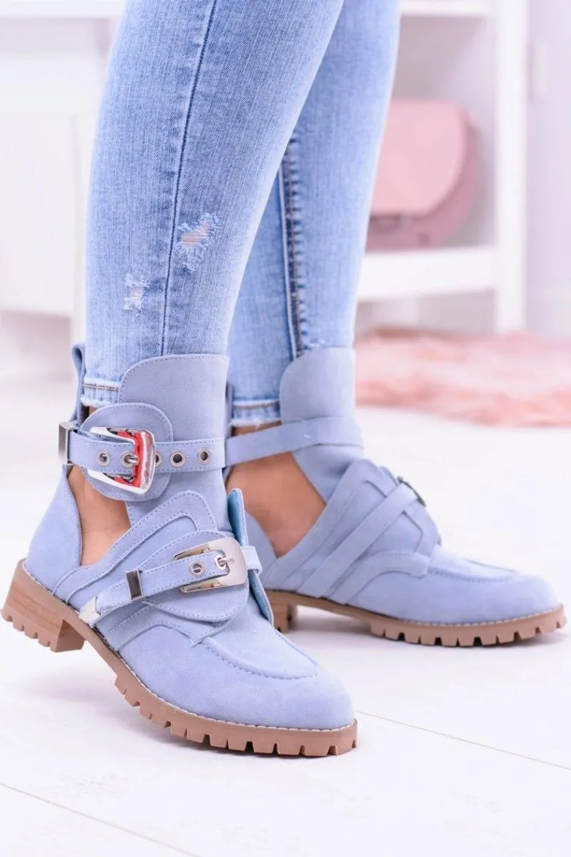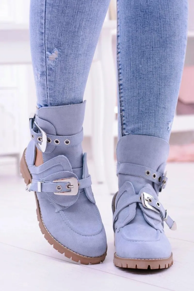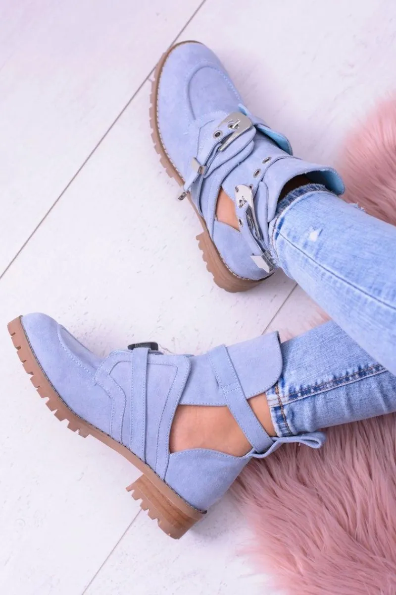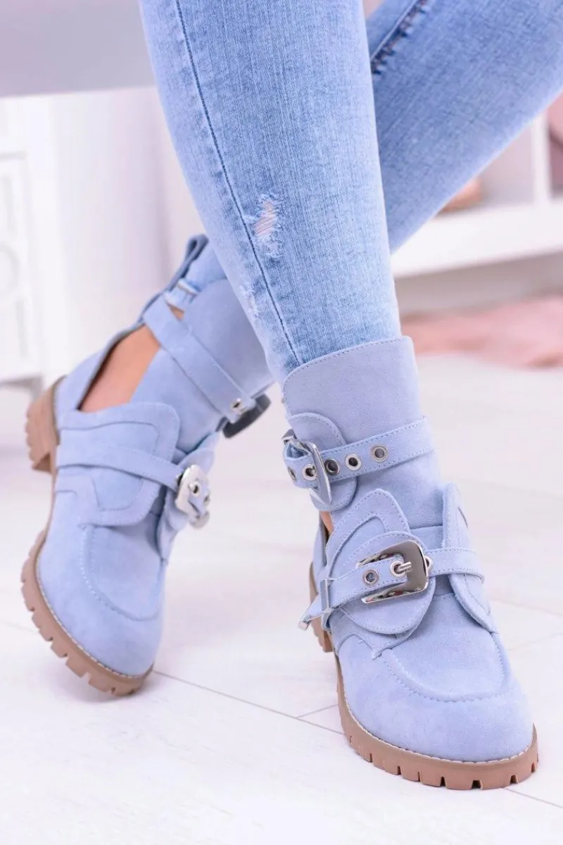 Jeśli chcesz zabłysnąć w świecie mody lub po prostu pokazać się z jak najlepszej strony, to te zamszowe botki będą idealne dla Ciebie. Bardzo wyczekiwane przez wiele kobiet! Wyglądają bardzo efektownie, a srebrne klamry nadają mocnego, rockowego charakteru. Posiadają unikalny design – są w częściowo wykrojone dzięki czemu zapewnią odpowiednią wentylację dla stopy. Wysoka, traktorowa podeszwa idealnie komponuje się z resztą obuwia. Nie czekaj dłużej i kup teraz póki jeszcze są dostępne!