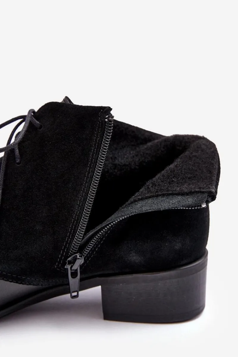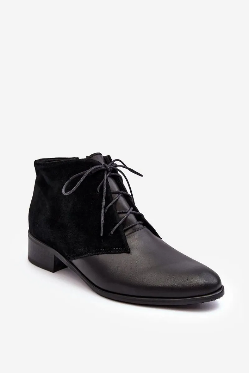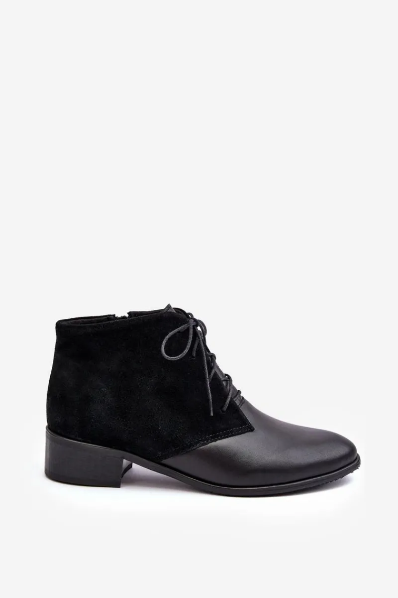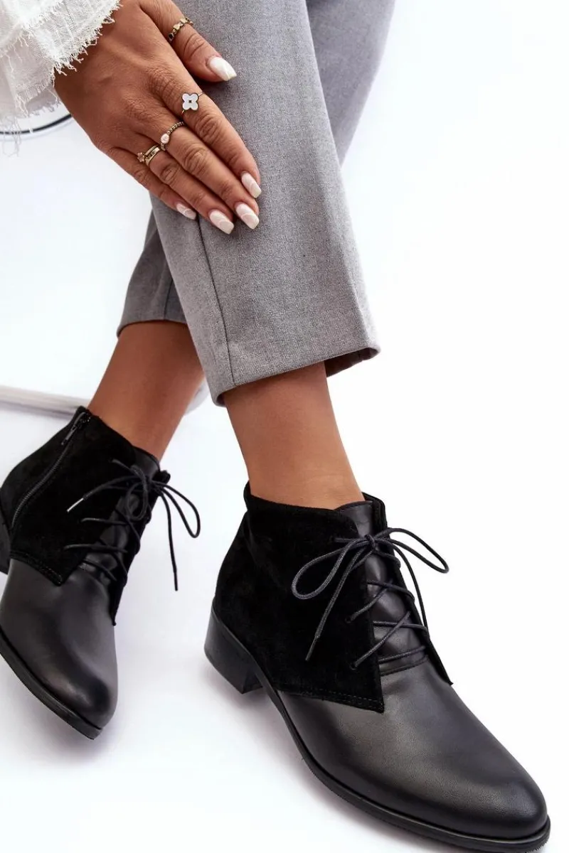 Modne, damskie botki od polskiego producenta zostały wykonane z wysokiej jakości naturalnej skóry z dbałością o szczegóły. Ten ocieplany kocem obuwniczym model zapewni wygodę i ciepło w chłodniejsze dni. Osadzono je na niskim, płaskim obcasie. Botki są sznurowane, ale także zapinane z boku cholewki na suwak. Dodatkowo posiadają usztywniany zapiętek. Przy wyborze rozmiaru prosimy sugerować się tabelą rozmiarów.