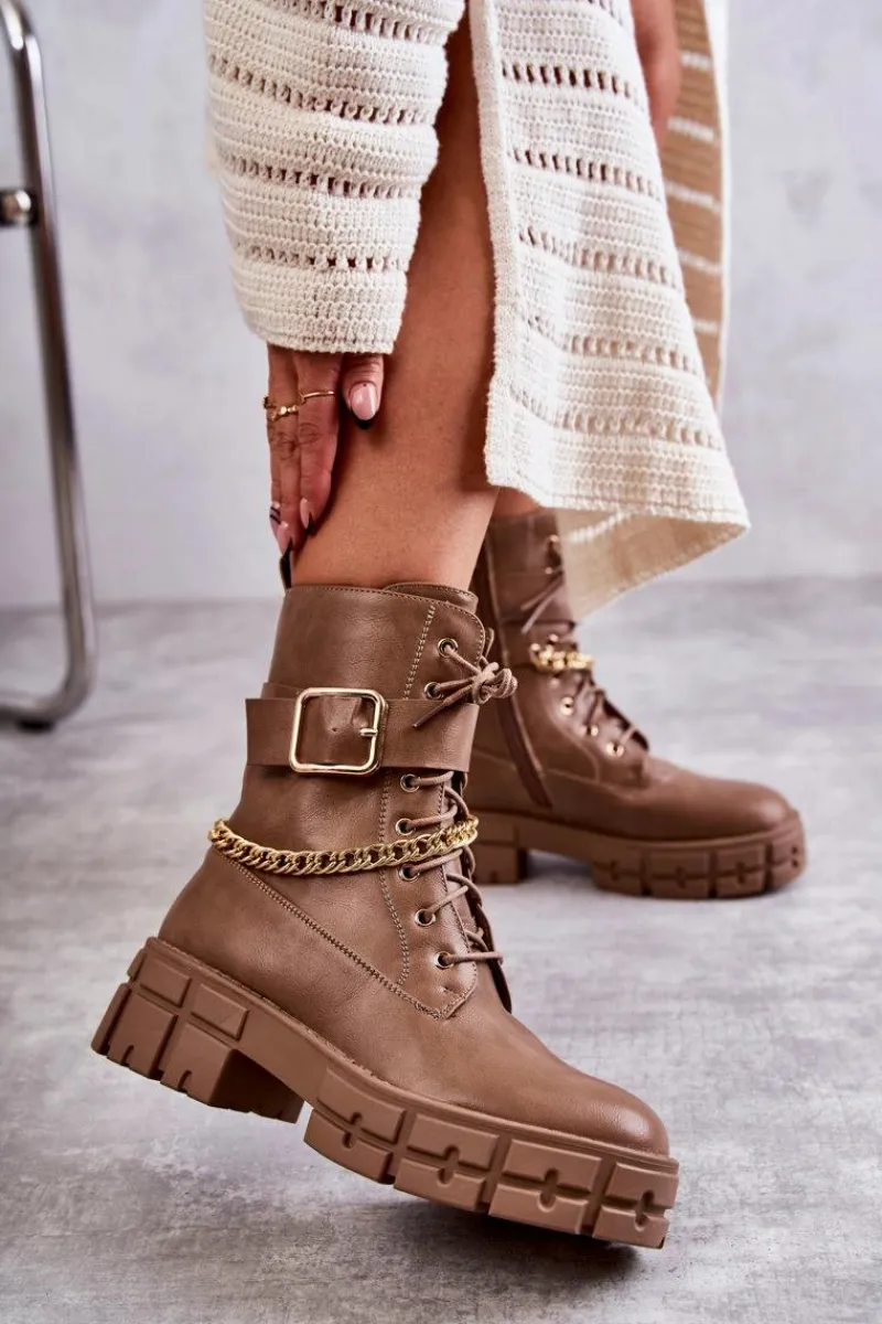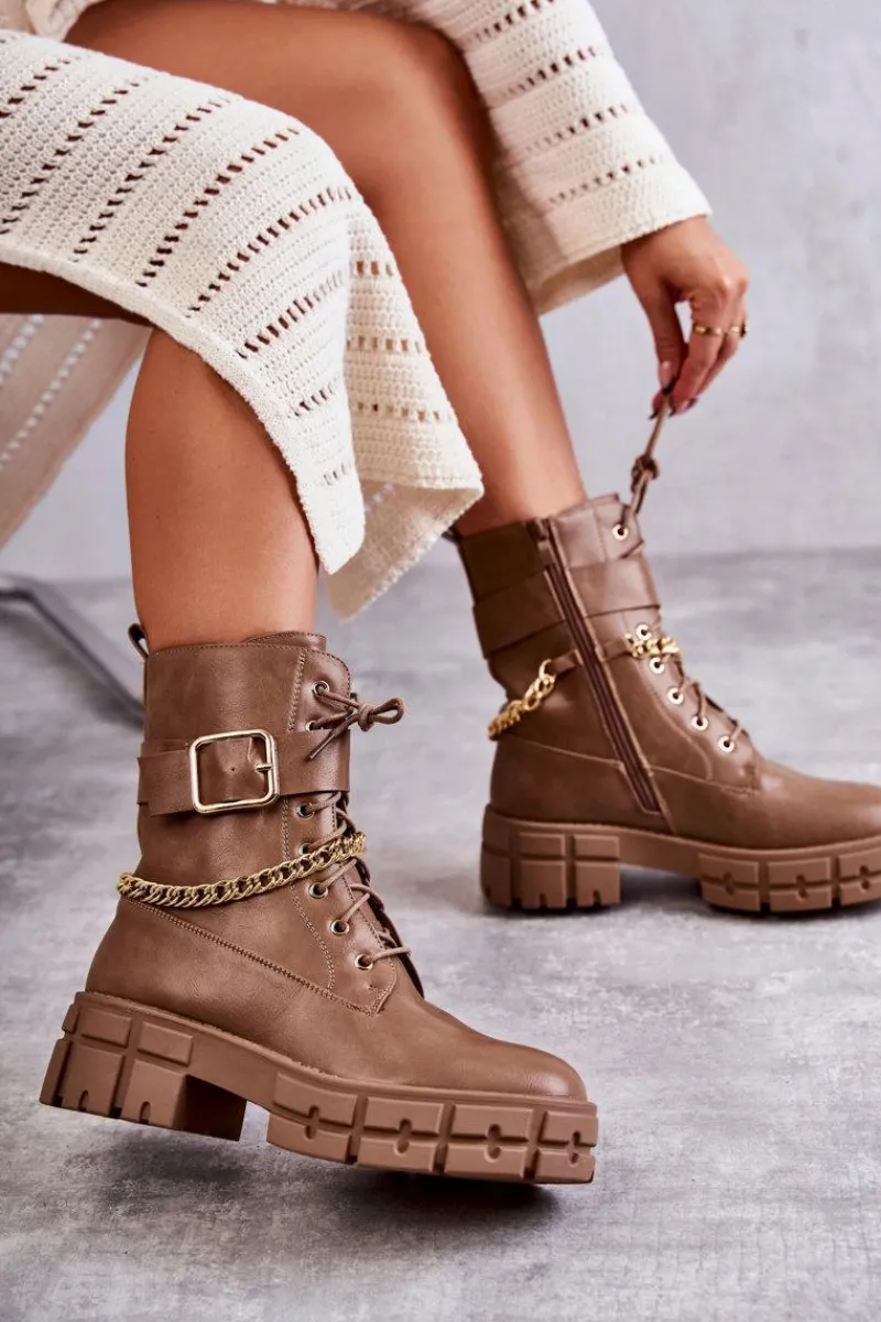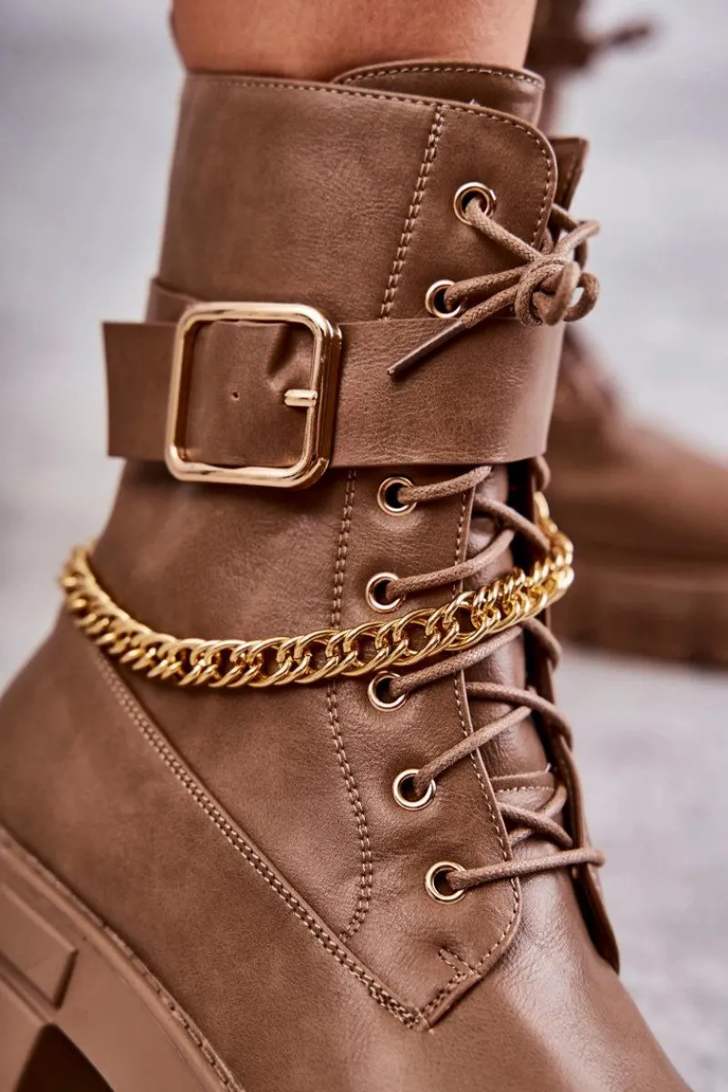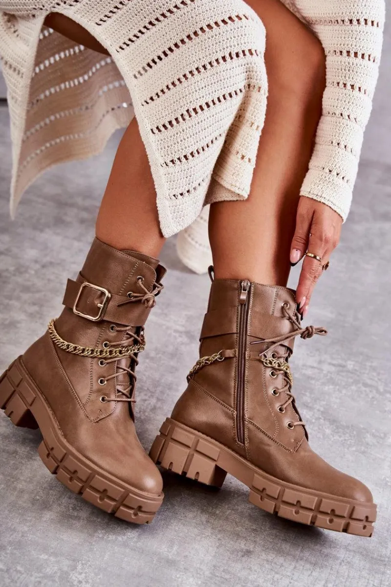 Niezwykłe i stylowe botki wykonane z eko skóry. Zapinane z boku cholewki na zamek oraz sznurowane. Dodatkowo botki posiadają regulowany pasek z klamrą. Ozdobny łańcuch jest przymocowany do cholewki i nie jest ściągany. Botki są wykonane z eko skóry. Posiadają ocieplenie w postaci koca obuwniczego. Osadzone na masywnym, płaskim obcasie i platformie. Przy wyborze rozmiaru prosimy sugerować się tabelą rozmiarów.