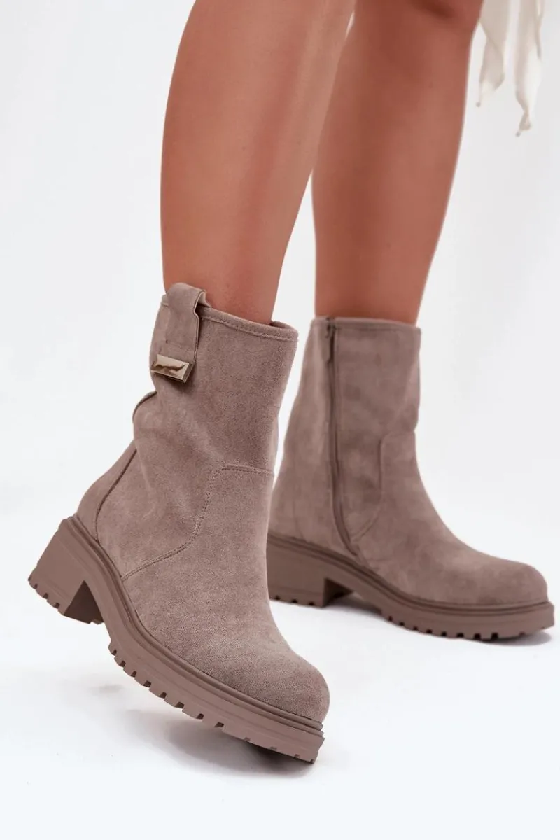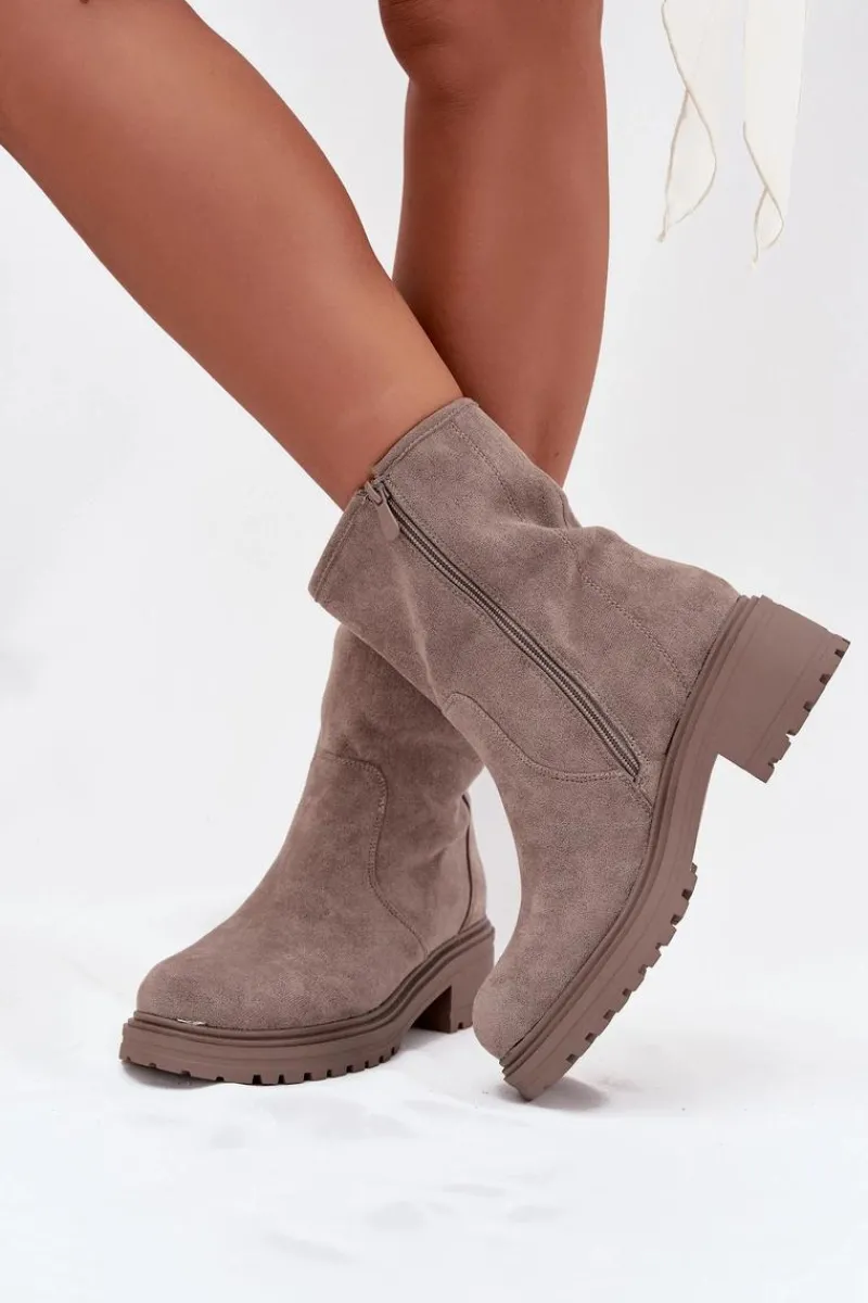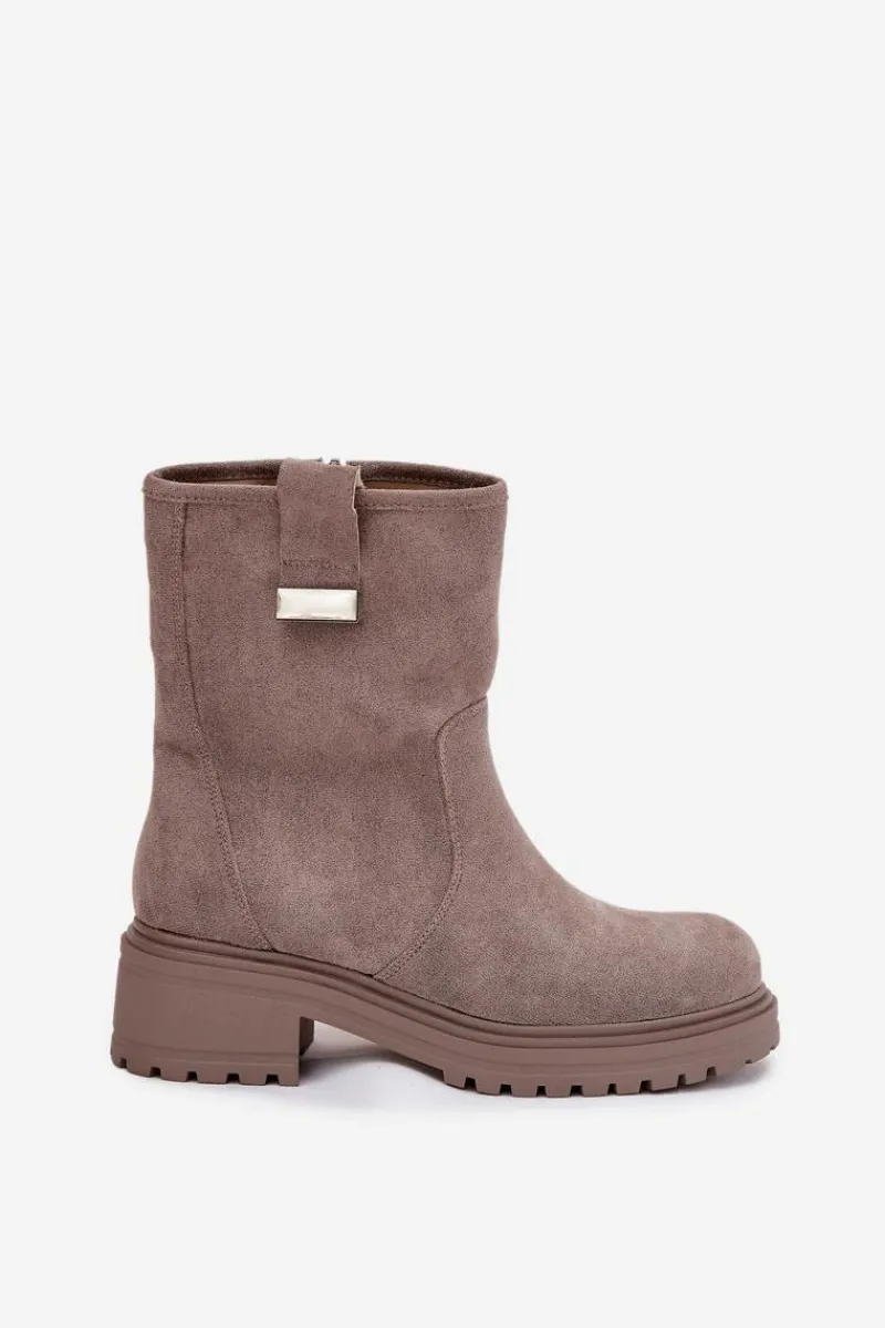 Botki damskie wykonane z eko zamszu. Osadzone na niskim obcasie, zapewniają komfort przy każdym kroku, a wnętrze ocieplane kocem obuwniczym gwarantuje ciepło. Model zapinany na zamek ułatwia szybkie zakładanie, a ozdobny, krótki pasek na górze cholewki dodaje subtelnego, stylowego akcentu, który podkreśla codzienne stylizacje. Przy wyborze rozmiaru prosimy sugerować się tabelą rozmiarów.