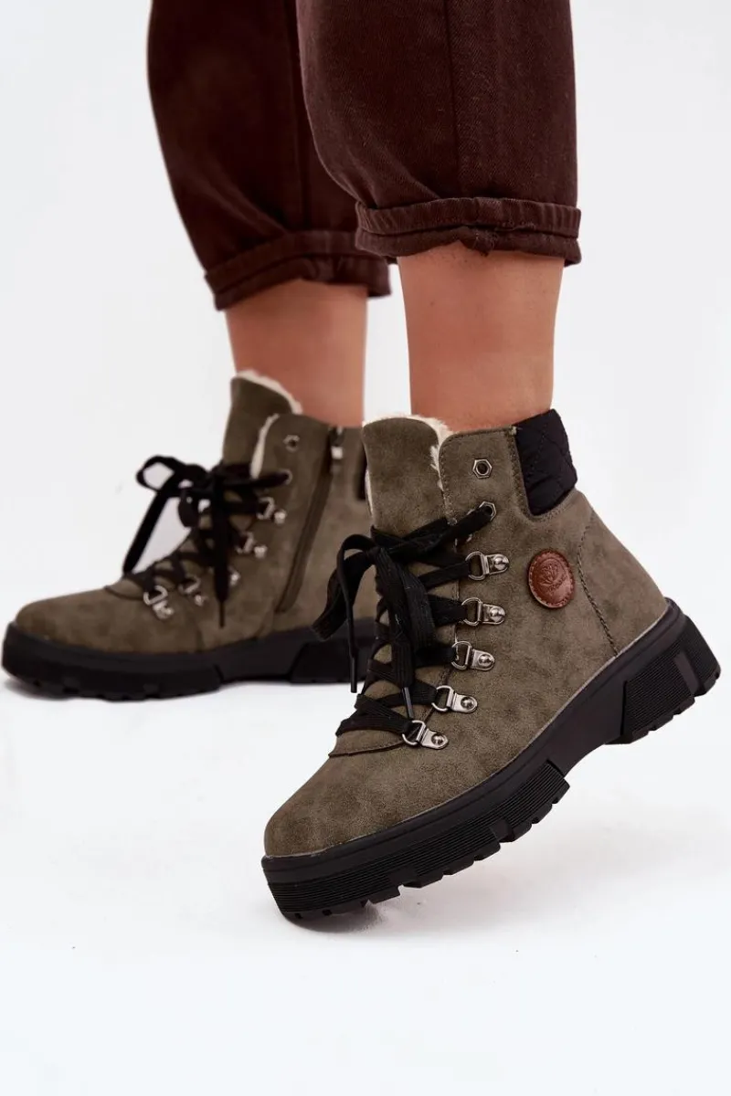 Damskie trapery wykonane z eko skóry to stylowa i praktyczna propozycja na chłodniejsze dni. Osadzone na solidnej platformie, zapewniają stabilność i wygodę podczas chodzenia. Wnętrze ocieplone miękkim futerkiem gwarantuje ciepło i komfort, dzięki czemu buty świetnie sprawdzą się w zimowe dni. Model posiada zarówno sznurowanie, jak i zamek, co ułatwia zakładanie oraz pozwala na idealne dopasowanie do stopy. To uniwersalne trapery, które doskonale uzupełnią codzienne stylizacje. Przy wyborze rozmiaru prosimy sugerować się tabelą rozmiarów.