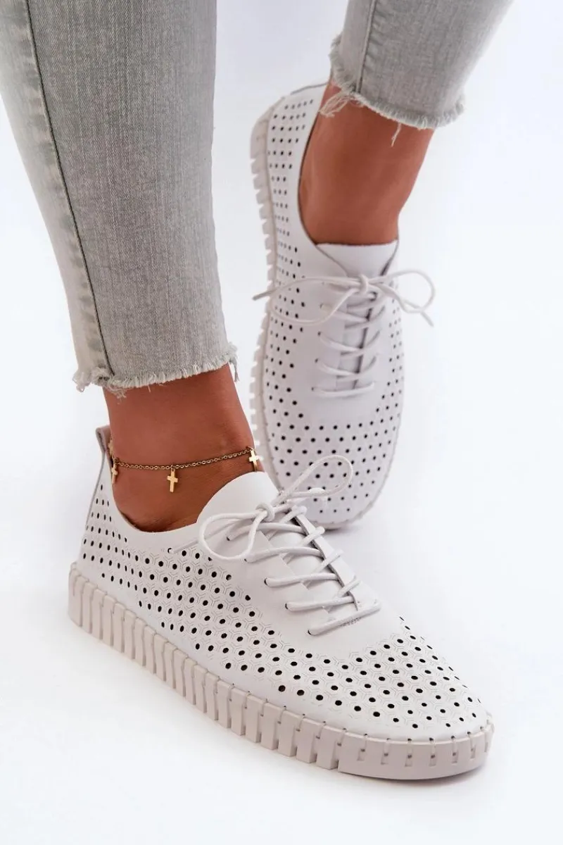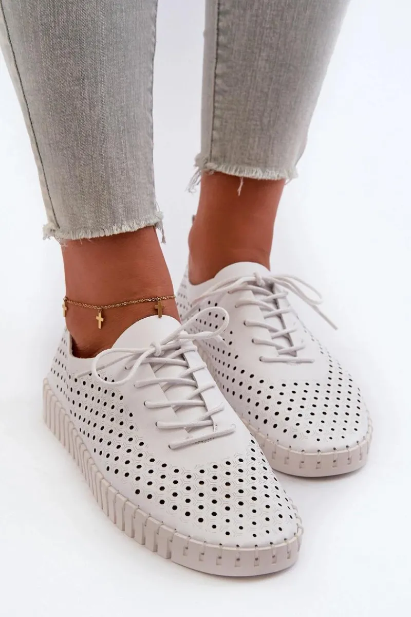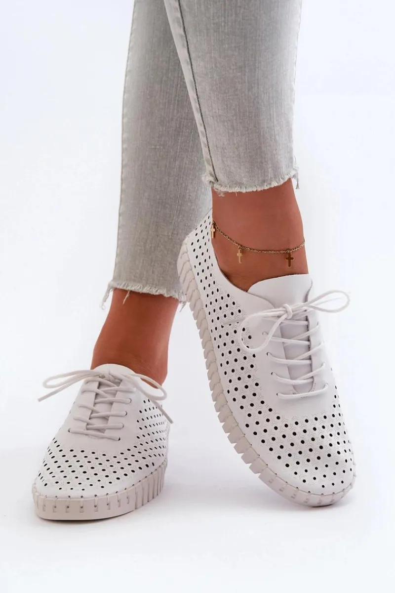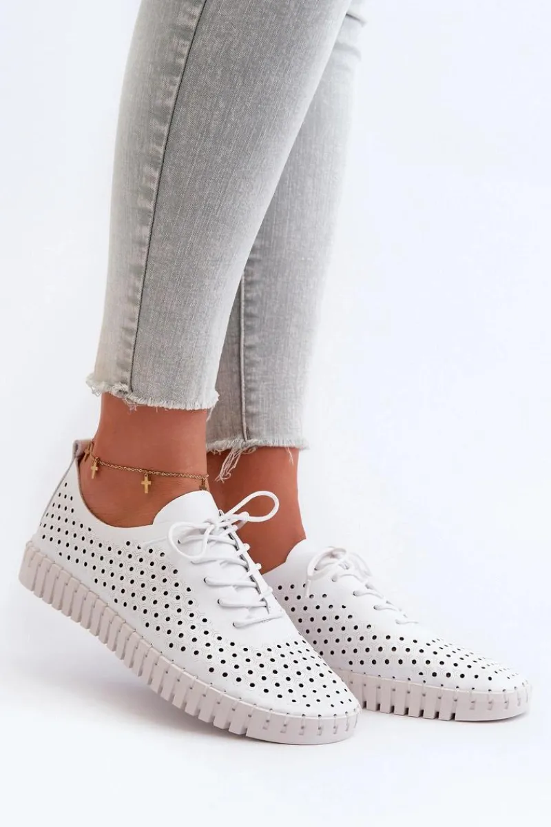 Damskie trampki wykonane ze skóry naturalnej, ozdobione ażurowym wzorem. Te stylowe buty zapewniają komfort i przewiewność, idealne na ciepłe dni. Doskonałe połączenie mody i funkcjonalności, świetnie sprawdzą się w codziennych stylizacjach. Przy wyborze rozmiaru prosimy sugerować się tabelą rozmiarów.