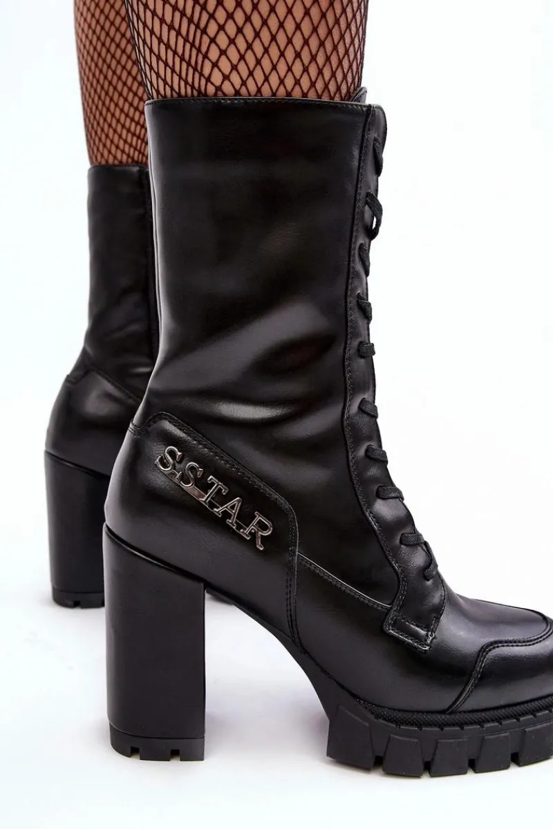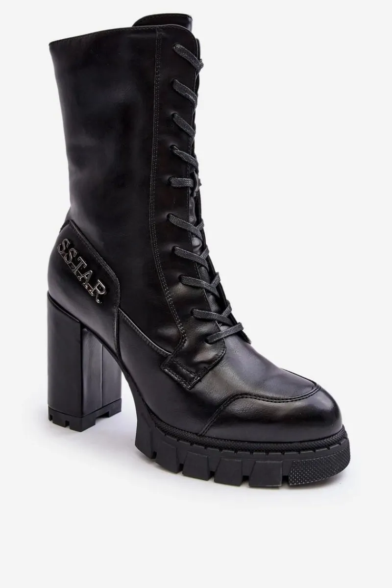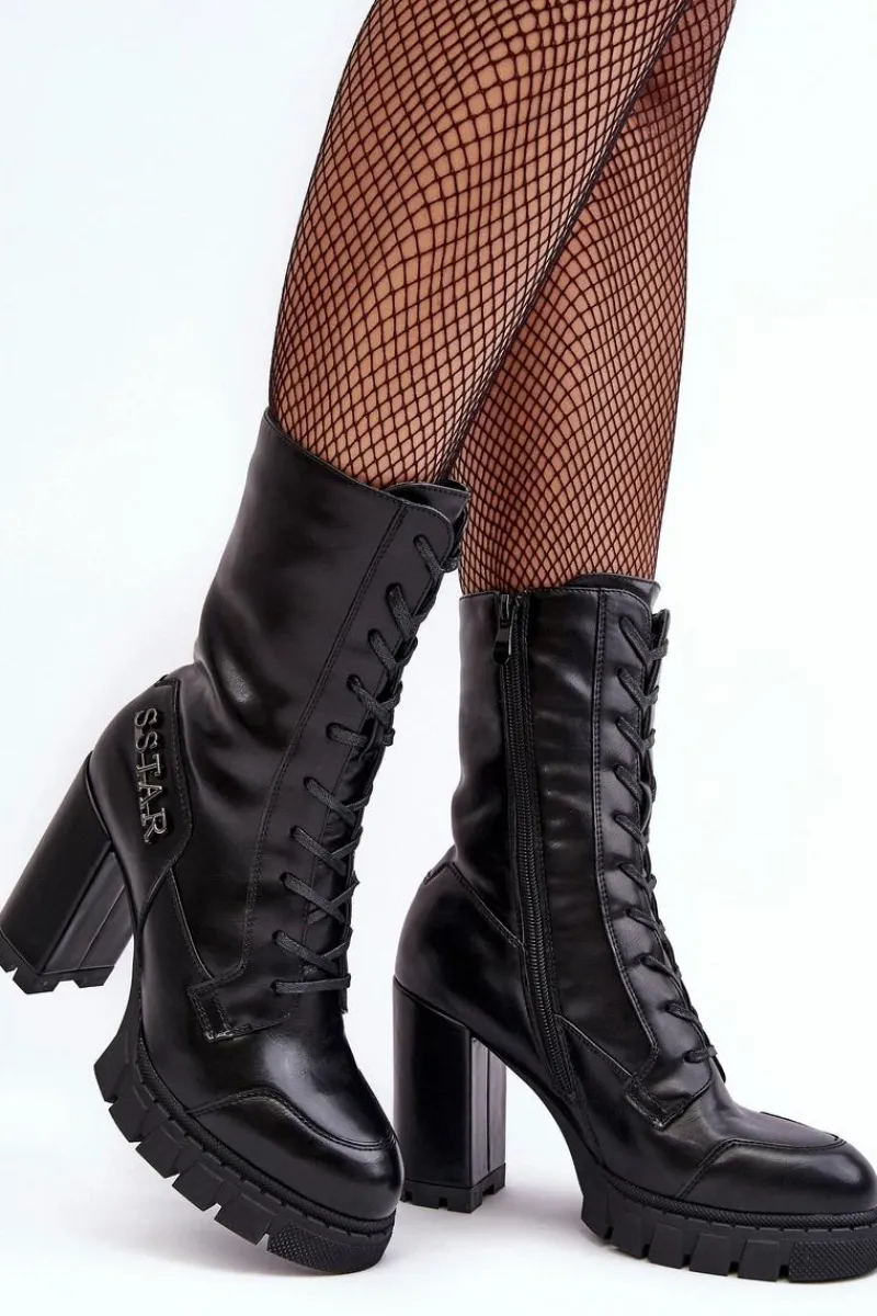 Botki damskie wykonane z eko zamszu. Zapinanie na suwak po wewnętrznej stronie cholewki. Z przodu sznurowanie. Obcas w postaci wysokiego słupka. Model z wyższą cholewką. Środek ocieplony kocem obuwniczym. Dodatkowo zapiętek jest usztywniony. Przy wyborze rozmiaru prosimy sugerować się tabelą rozmiarów.