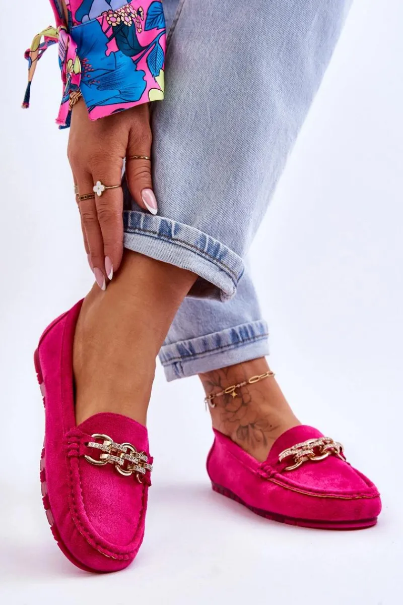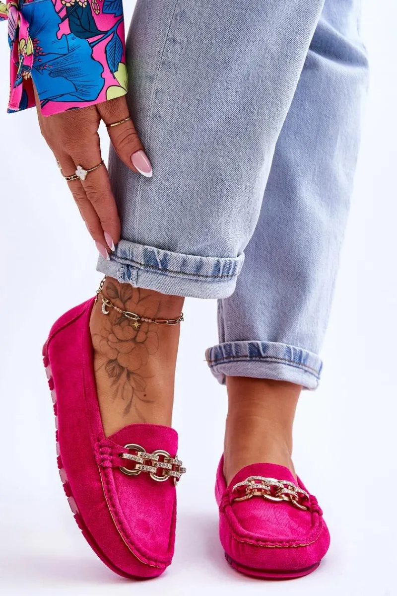 Mokasyny damskie zostały wykonane z eko zamszu. Posiadają na przodzie ozdobny łańcuszek z dżetami. Mokasyny zostały osadzone na platformie z gumową, antypoślizgową podeszwą. Miękka wkładka z eko skóry zapewni komfortowe użytkowanie. Koniecznie powinnaś je mieć! Przy wyborze rozmiaru prosimy sugerować się tabelą rozmiarów.