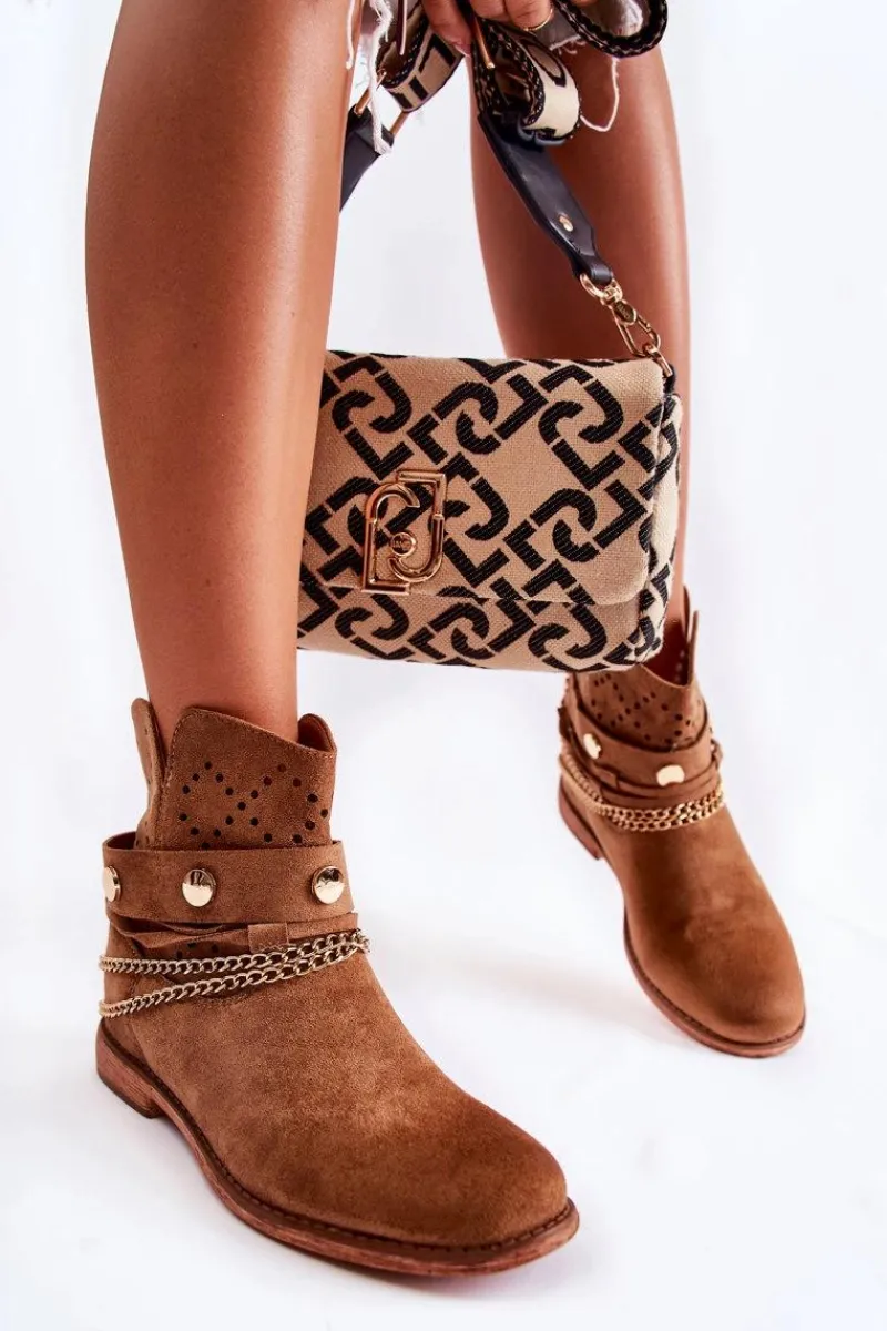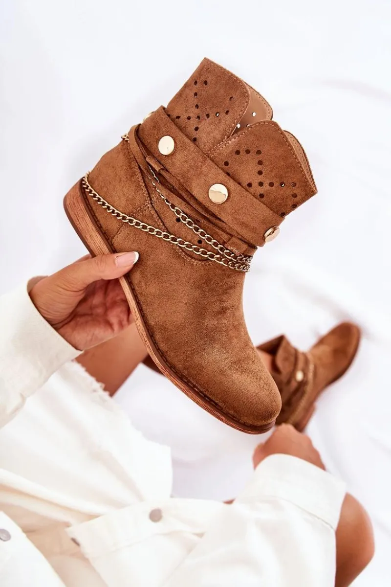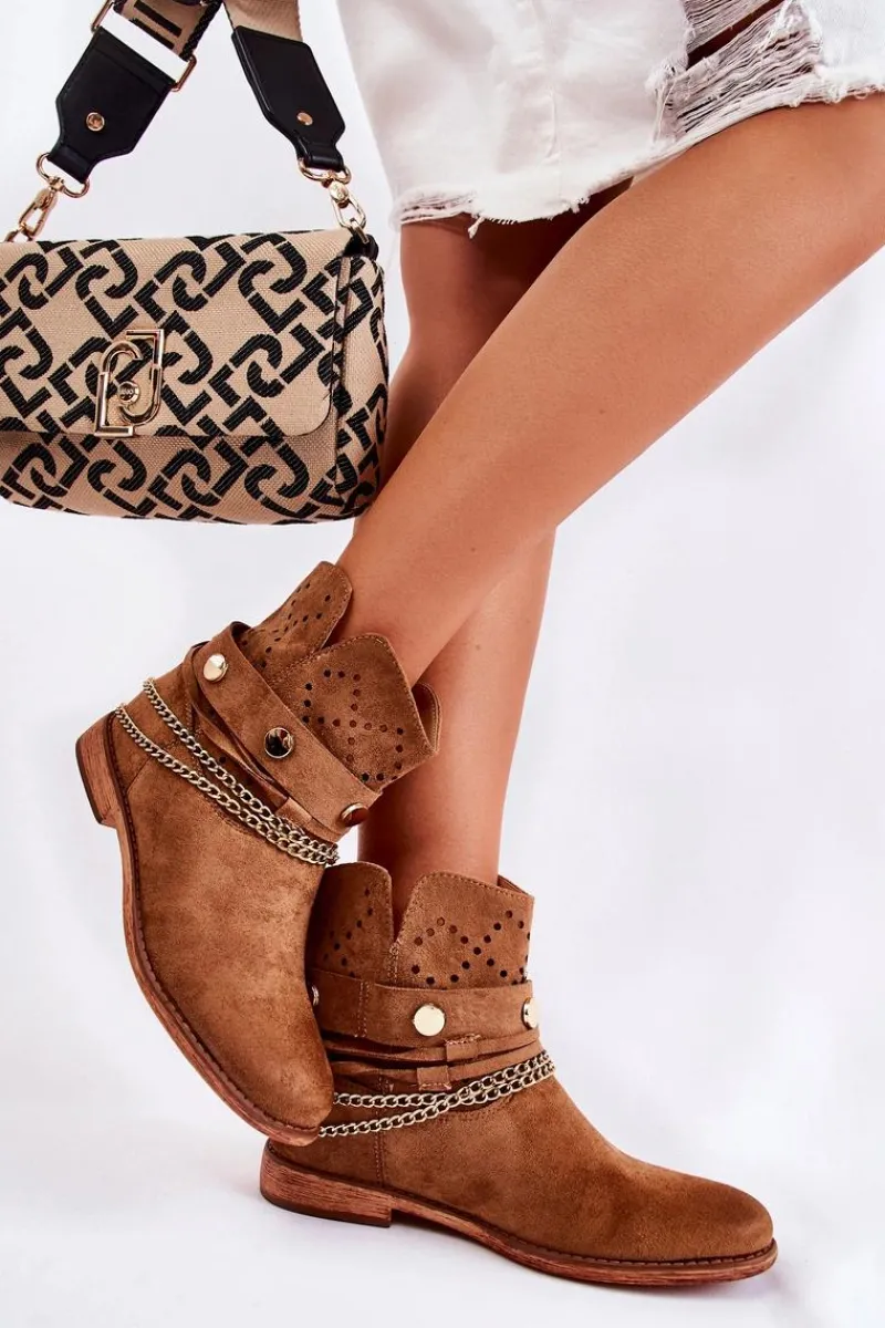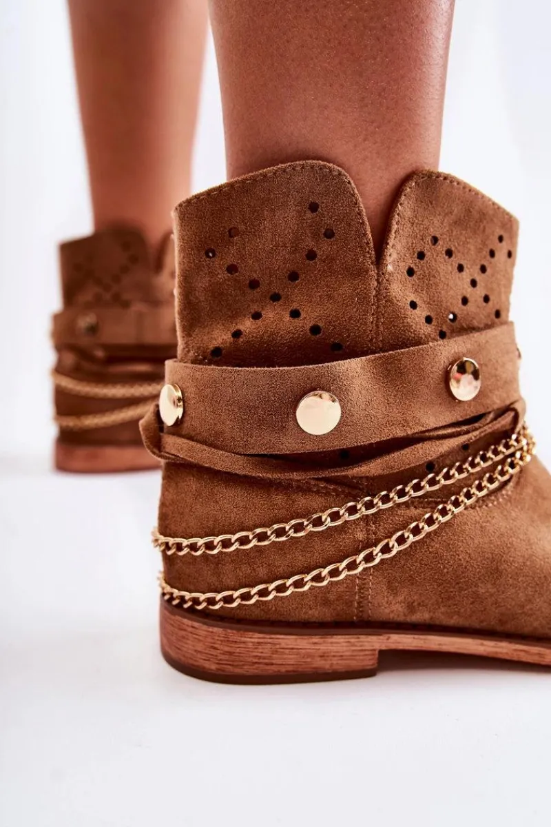 Botki na ukrytym koturnie i płaskim obcasie posiadają cholewką za kostkę, która jest delikatnie perforowana. Model wsuwany, wykonany z eko zamszu. Miękka wkładka z eko skóry pozwala na wygodne użytkowanie. Zapiętek usztywniany. Idealne na sezon wiosenno-jesienny. Botki posiadają osobno ściągane paseczki i łańcuszek, dlatego możesz je nosić razem z ozdobami lub bez. Przy wyborze rozmiaru prosimy sugerować się tabelą rozmiarów.