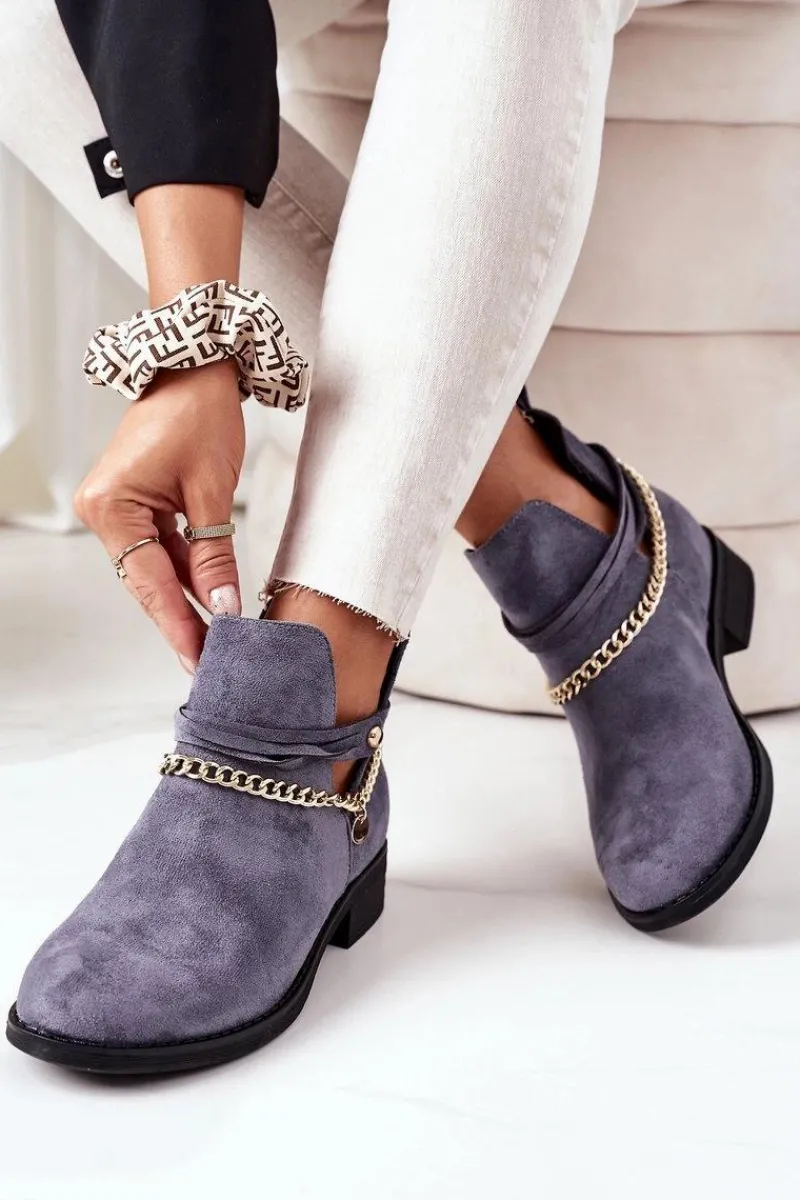 Botki damskie wykonane z eko zamszu ozdobione złotym łańcuszkiem. Przy wyborze rozmiaru prosimy sugerować się tabelą rozmiarów.