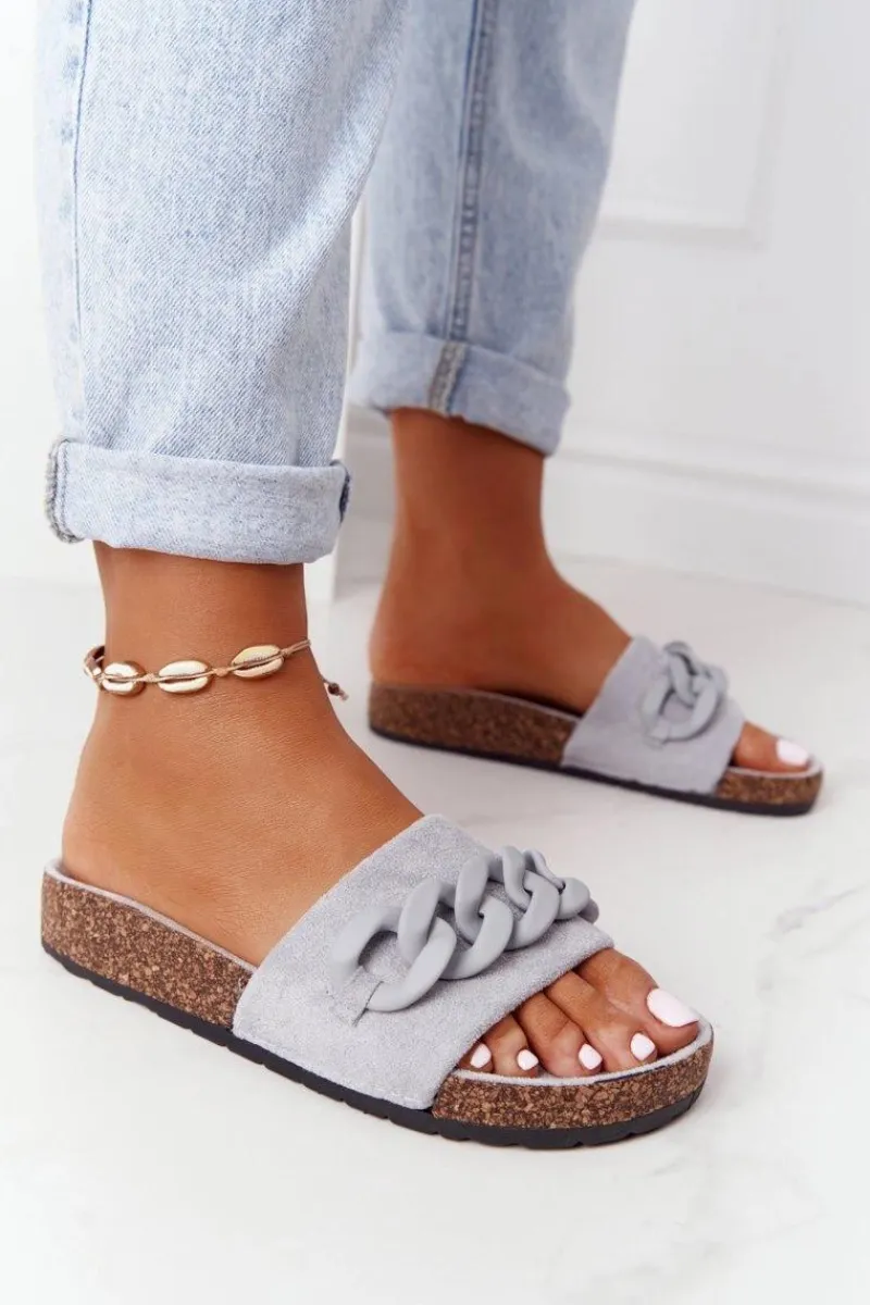 Wyjątkowe klapki damskie wykonane z eko zamszu. Buty posiadają profilowaną wkładkę, która zagwarantuje komfort. Modny fason ozdobiony lekkim łańcuchem urozmaici Twoje stylizacje! Przy wyborze rozmiaru prosimy sugerować się tabelą rozmiarów.