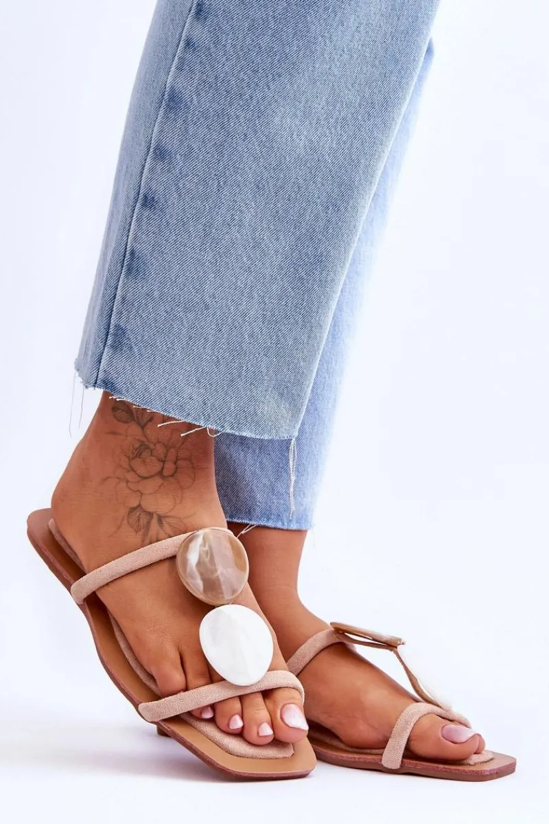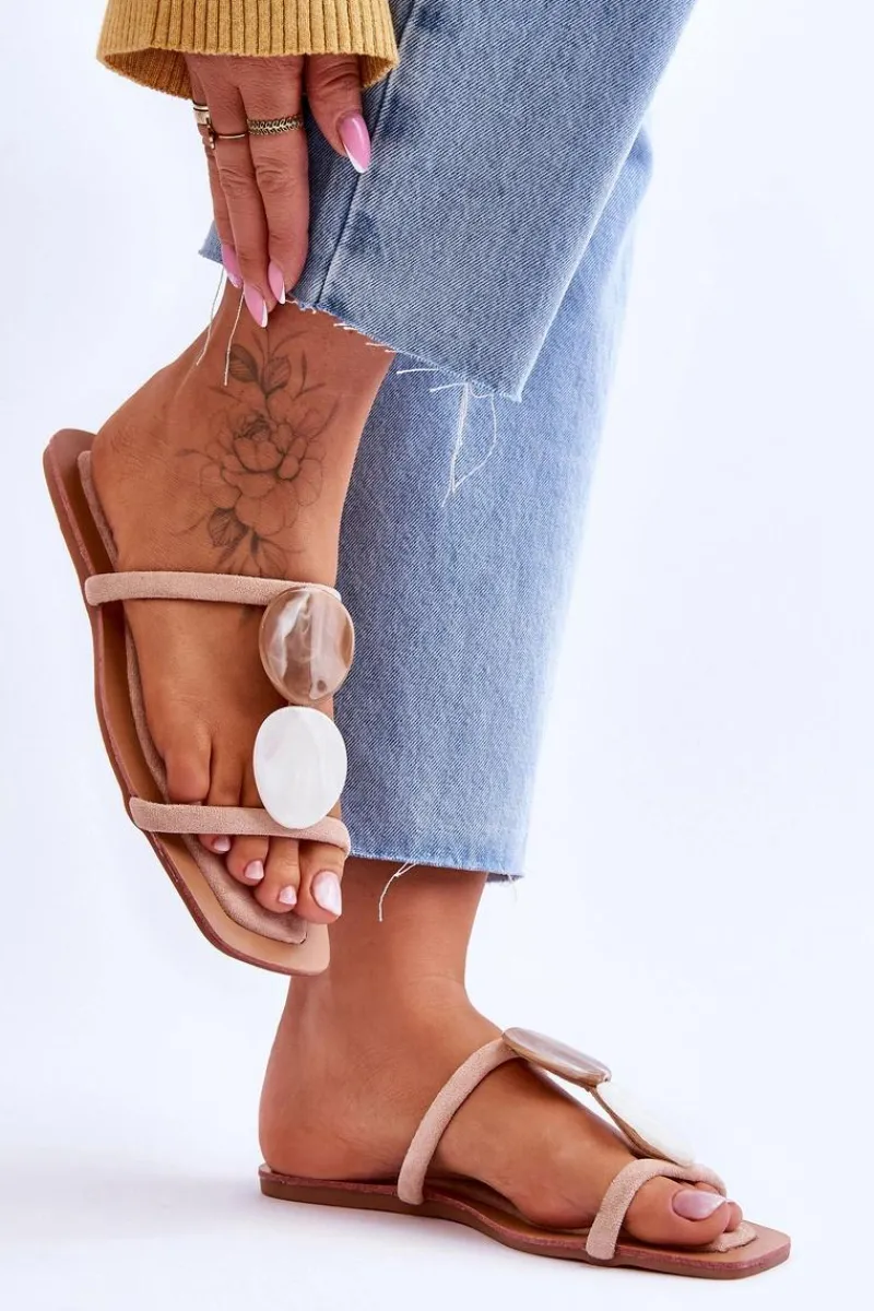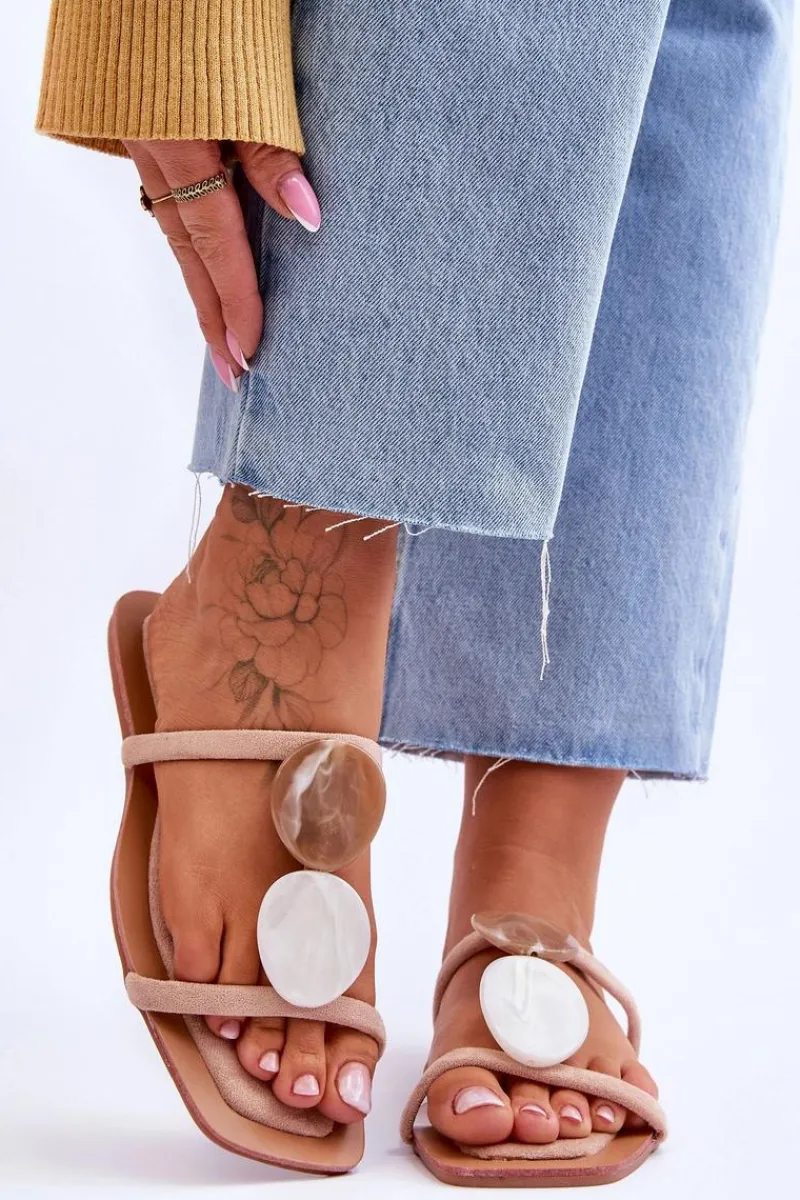 Klasyczne klapki damskie zostały wykonane z eko zamszu. Paseczki są połączone ozdobnymi kamieniami z tworzywa imitującymi marmur. Klapki posiadają niezwykle miękką i komfortową wkładkę. Idealne obuwie do wielu stylizacji np.: sukienek boho czy lnianych, szerokich spodni. Koniecznie powinnaś je mieć! Przy wyborze rozmiaru prosimy sugerować się tabelą rozmiarów.