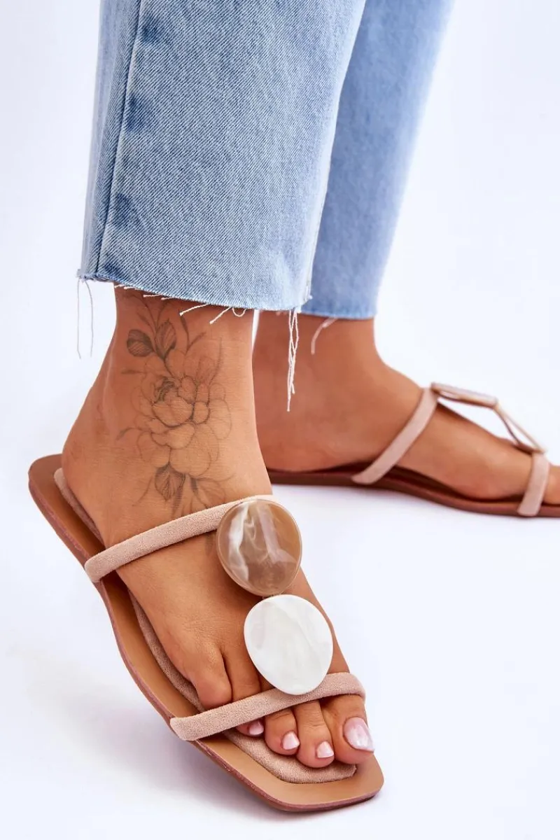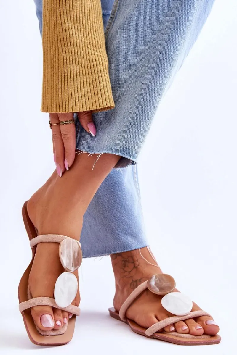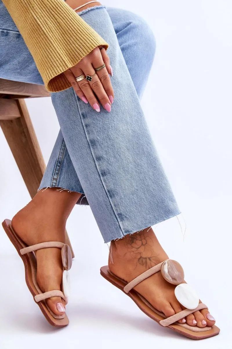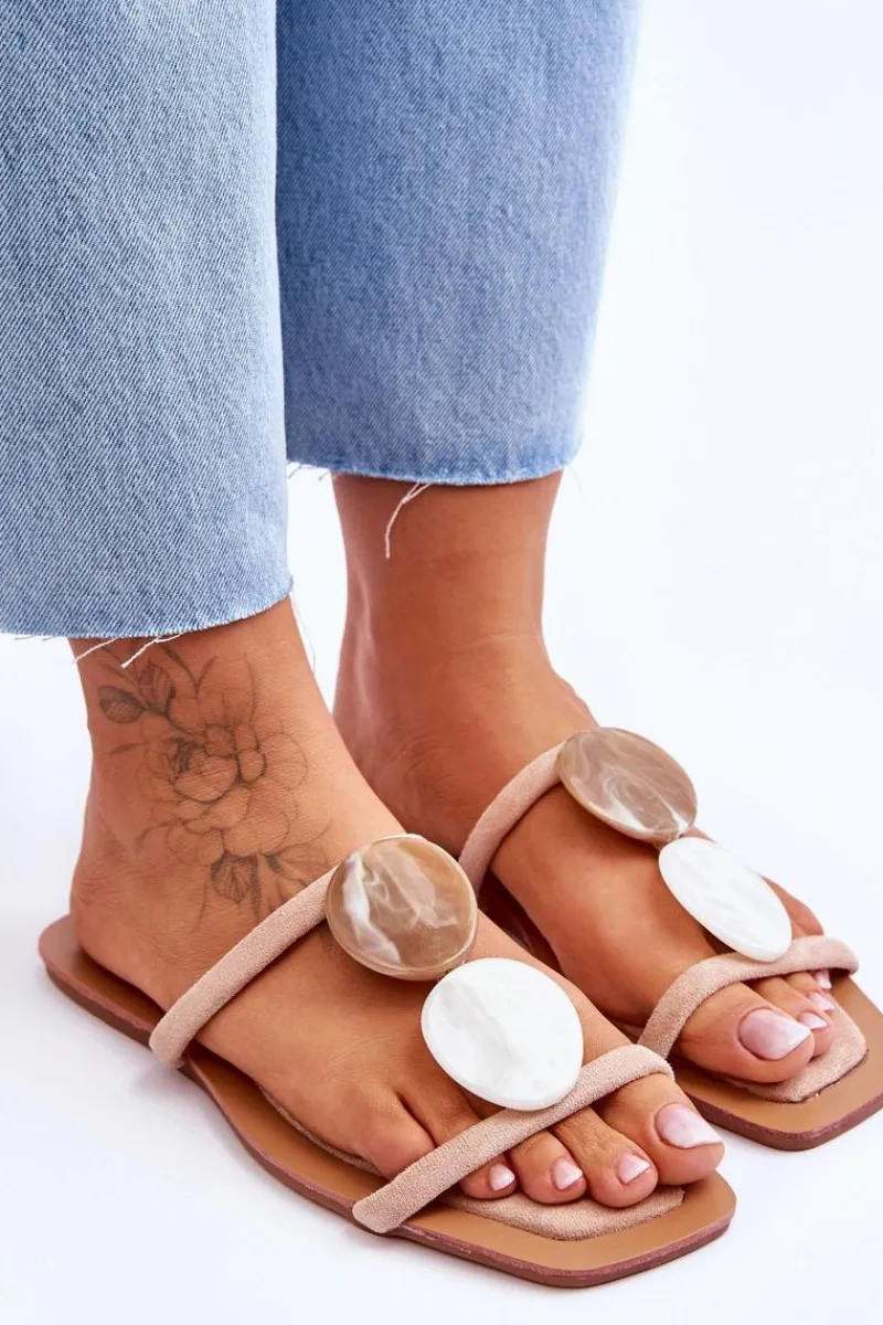 Klasyczne klapki damskie zostały wykonane z eko zamszu. Paseczki są połączone ozdobnymi kamieniami z tworzywa imitującymi marmur. Klapki posiadają niezwykle miękką i komfortową wkładkę. Idealne obuwie do wielu stylizacji np.: sukienek boho czy lnianych, szerokich spodni. Koniecznie powinnaś je mieć! Przy wyborze rozmiaru prosimy sugerować się tabelą rozmiarów.