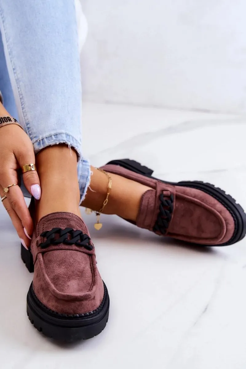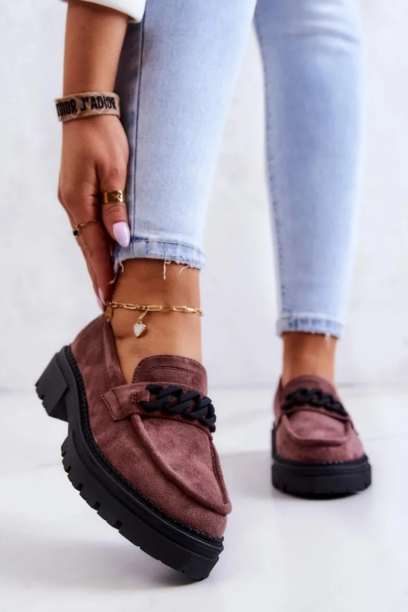 Klasyczne półbuty w stylu przepięknych loaferów marki Laura Fiore! Buty zostały wykonane z wysokiej jakości zamszowej eko skóry. Charakterystyczne zdobienie w postaci łańcucha sprawi, że stworzymy z nimi wiele wspaniałych stylizacji. Posiadają wysoką podeszwę oraz obcas, który uniesie naszą sylwetkę. Miękka wykonana z naturalnej skóry wkładka zadba o komfort podczas użytkowania obuwia. Przy wyborze rozmiaru prosimy sugerować się tabelą rozmiarów.