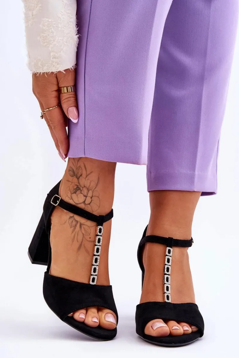 Klasyczne sandałki damskie zostały wykonane z eko zamszu. Model ten został ozdobiony mieniącymi się dżetami imitującymi cyrkonie. Sandałki posiadają usztywniany zapiętek oraz eko skórzaną, miękką wkładkę. Model ten został osadzony na obcasie w postaci słupka i jest zapinany na regulowany pasek ze sprzączką. Przy wyborze rozmiaru prosimy sugerować się tabelą rozmiarów.