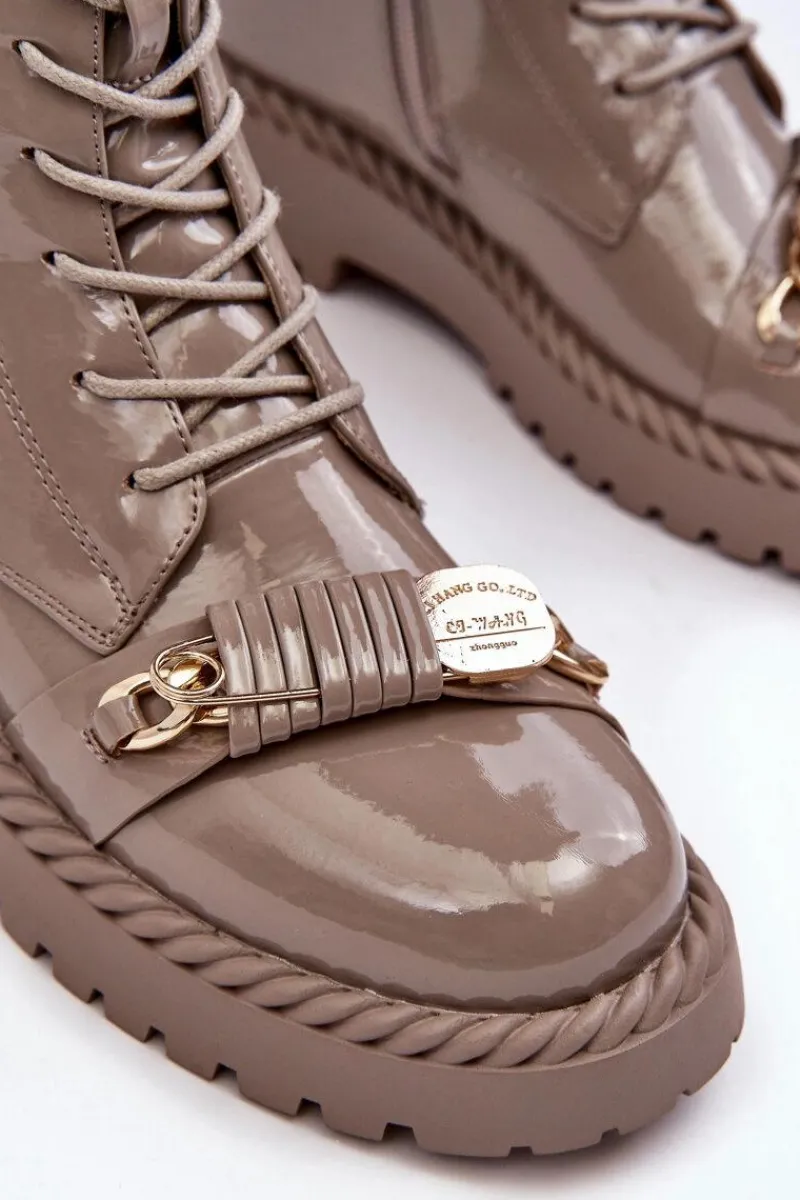 Damskie botki w stylu workerów zostały wykonane z wysokiej jakości eko skóry. Posiadają suwak z boku cholewki ułatwiający zakładanie obuwia. Botki osadzono na płaskim obcasie oraz delikatnej platformie ze żłobieniami. Posiadają w środku ocieplenie kocem obuwniczym. Z przodu złote ozdoby z tworzywa sztucznego. Ten model na pewno wykorzystasz w wielu stylizacjach! Przy wyborze rozmiaru prosimy sugerować się tabelą rozmiarów.