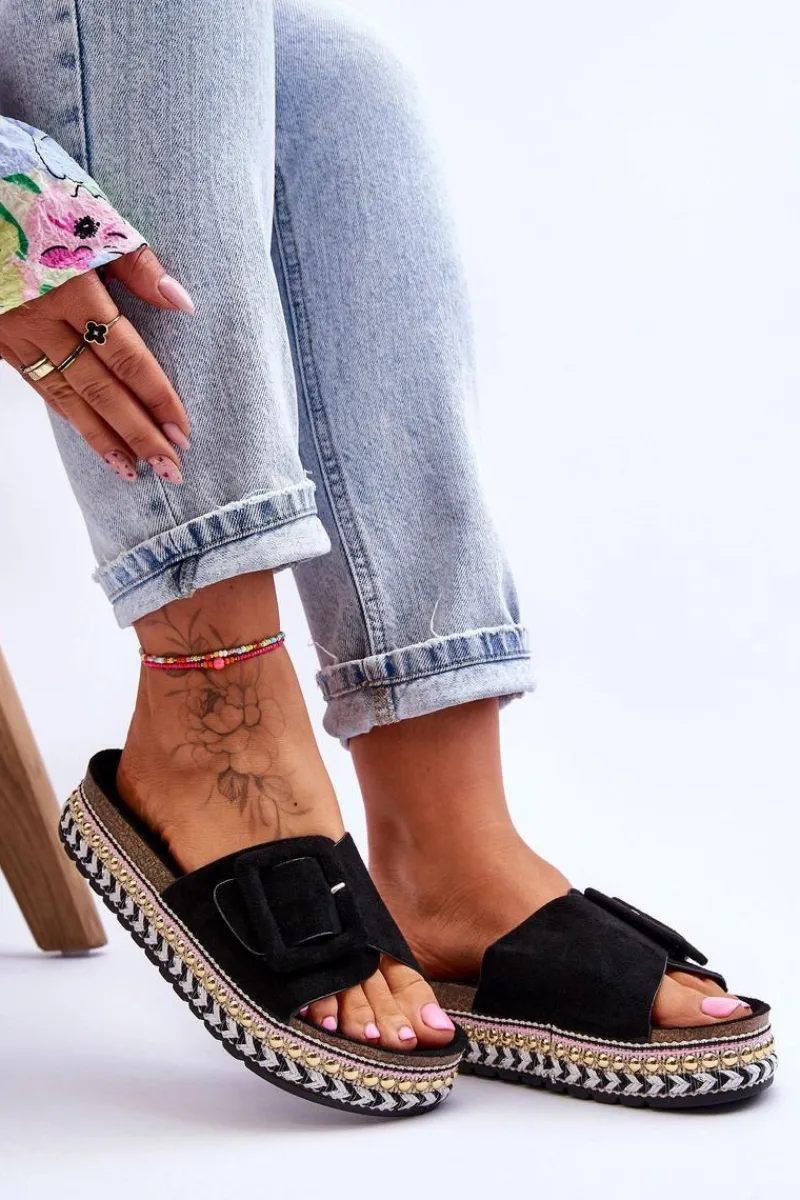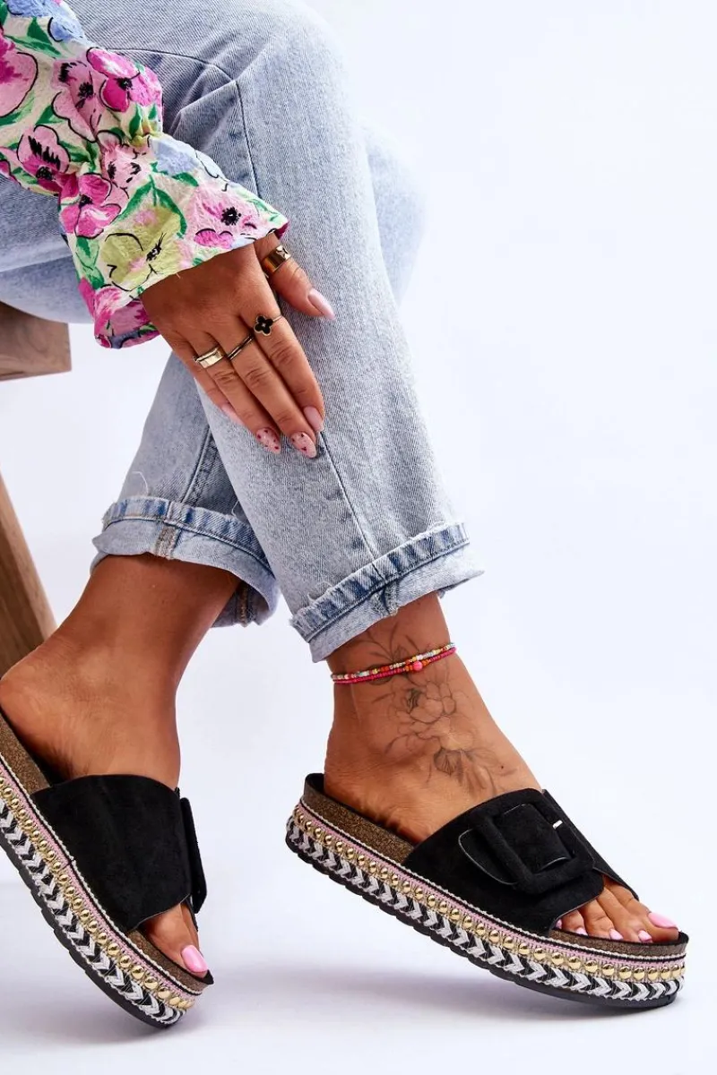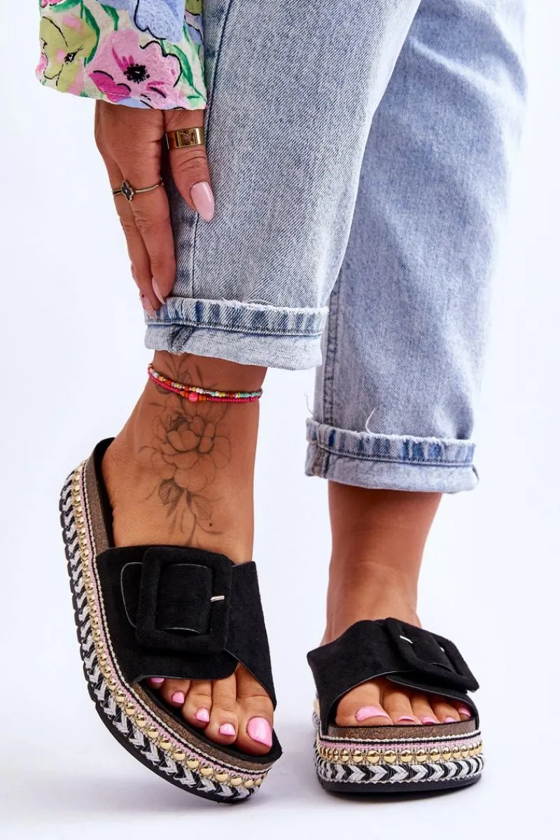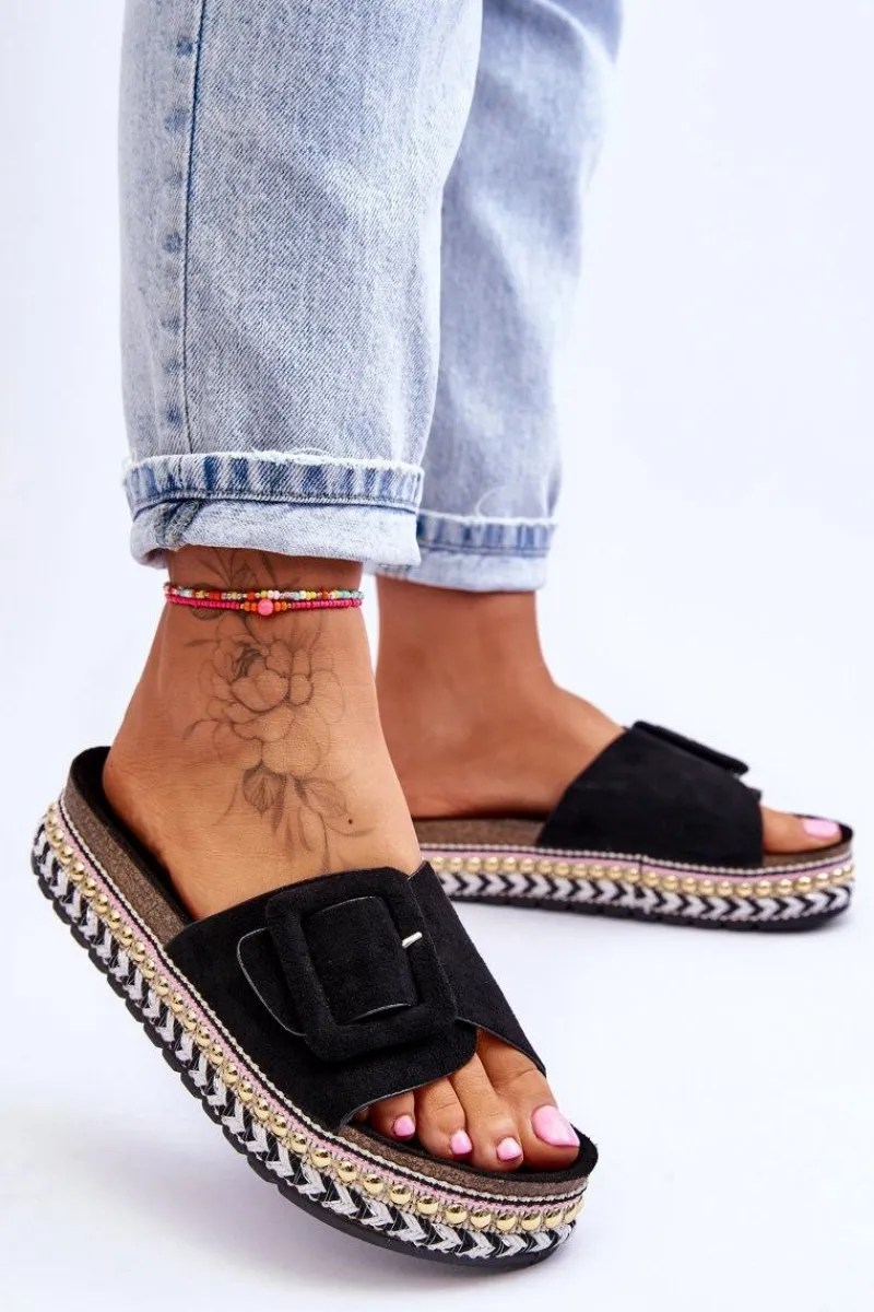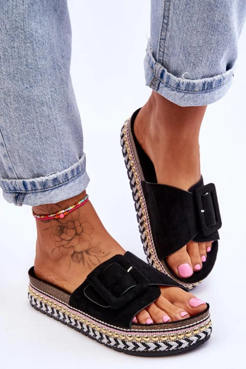 Wyjątkowe, damskie klapki zostały osadzone na platformie ozdobionej nitami oraz kolorowymi plecionkami. Model klasyczny, wsuwany, ozdobną klamrą i regulowanym paskiem, który pozwoli na odpowiednie dopasowanie obuwia do tęgości nogi. Profilowana wkładka zapewni wygodę w użytkowaniu. Świetny model do wielu stylizacji! Przy wyborze rozmiaru prosimy sugerować się tabelą rozmiarów.
