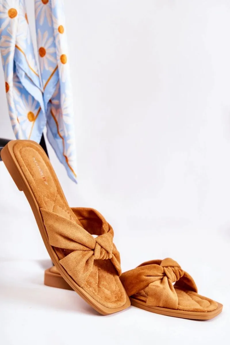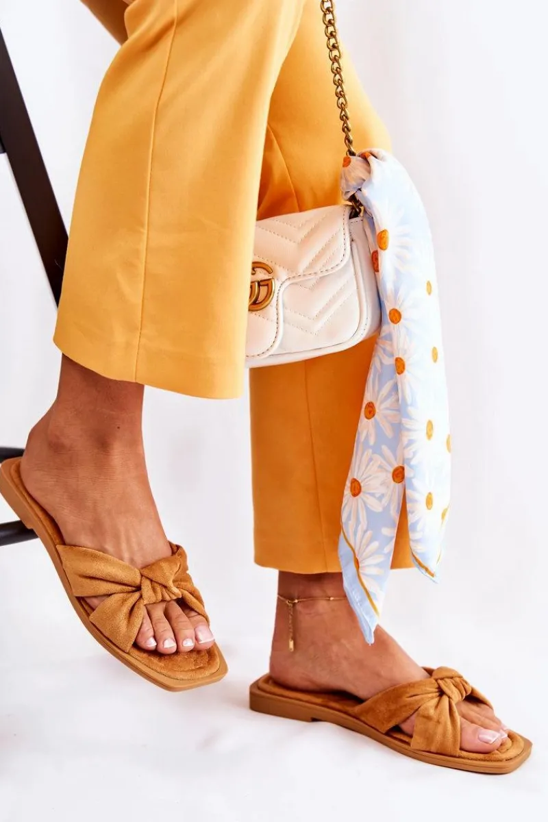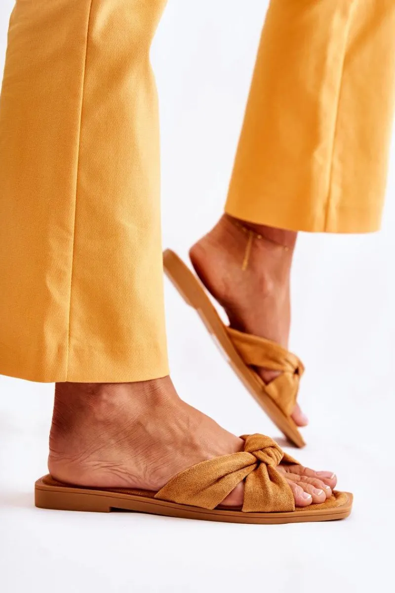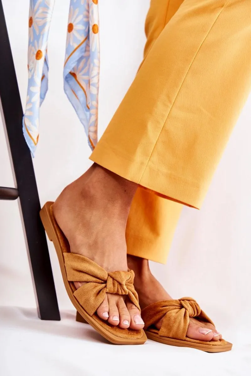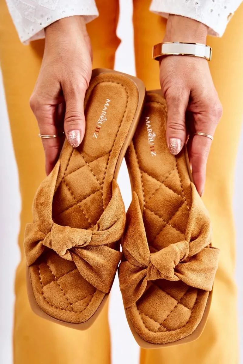 Klasyczne klapki damskie zostały wykonane z miłego w dotyku eko zamszu. Paski klapek łączą się na przodzie tworząc supełek. Wkładka jest pikowana i także wykonana z eko zamszu. Klapki osadzone na płaskim obcasie. Model, który świetnie sprawdzi się podczas codziennych aktywności, np.: podczas zakupów czy spaceru. Klapki te posiadają odkryty, kwadratowy nosek. Przy wyborze rozmiaru prosimy sugerować się tabelą rozmiarów.